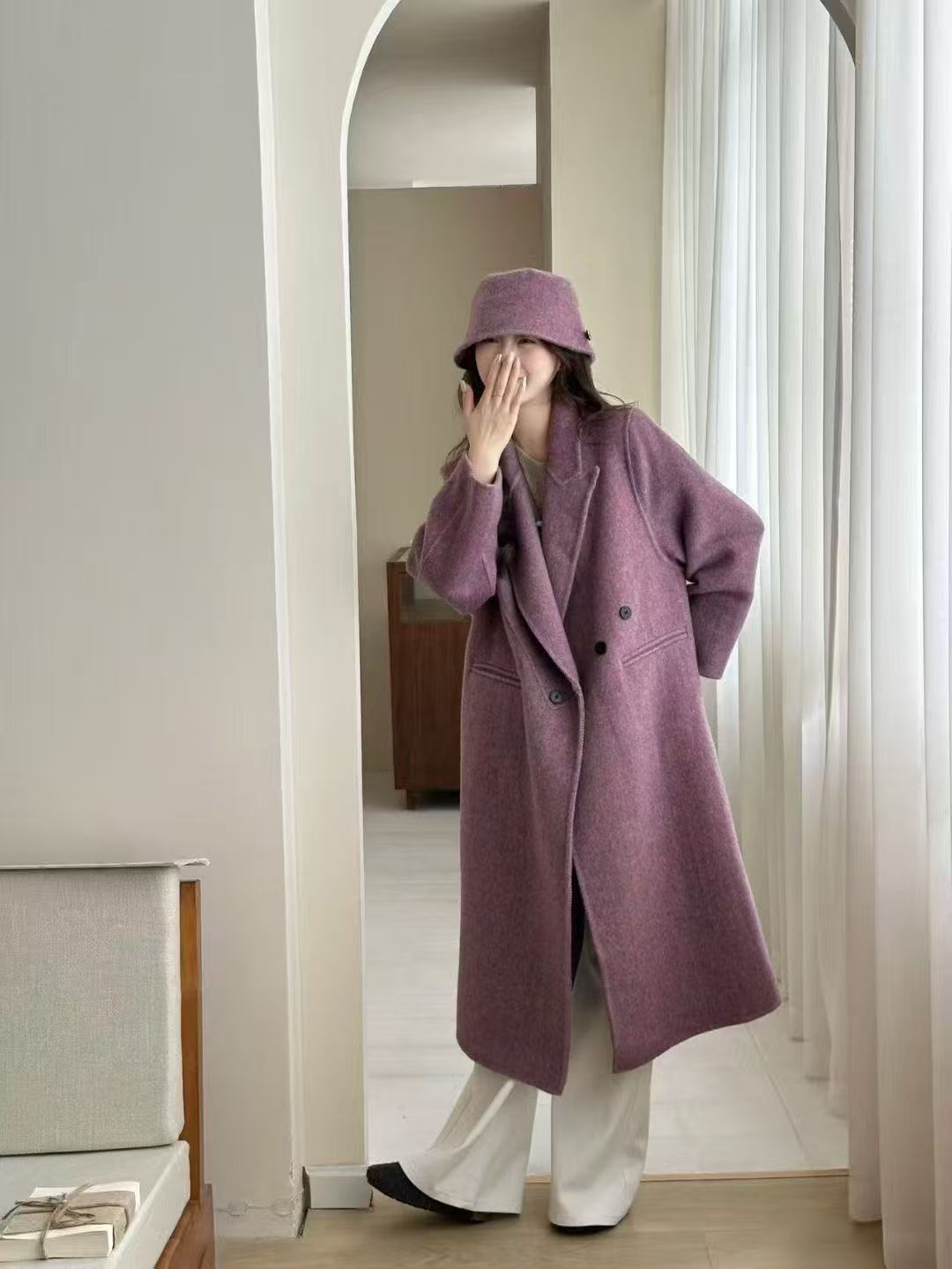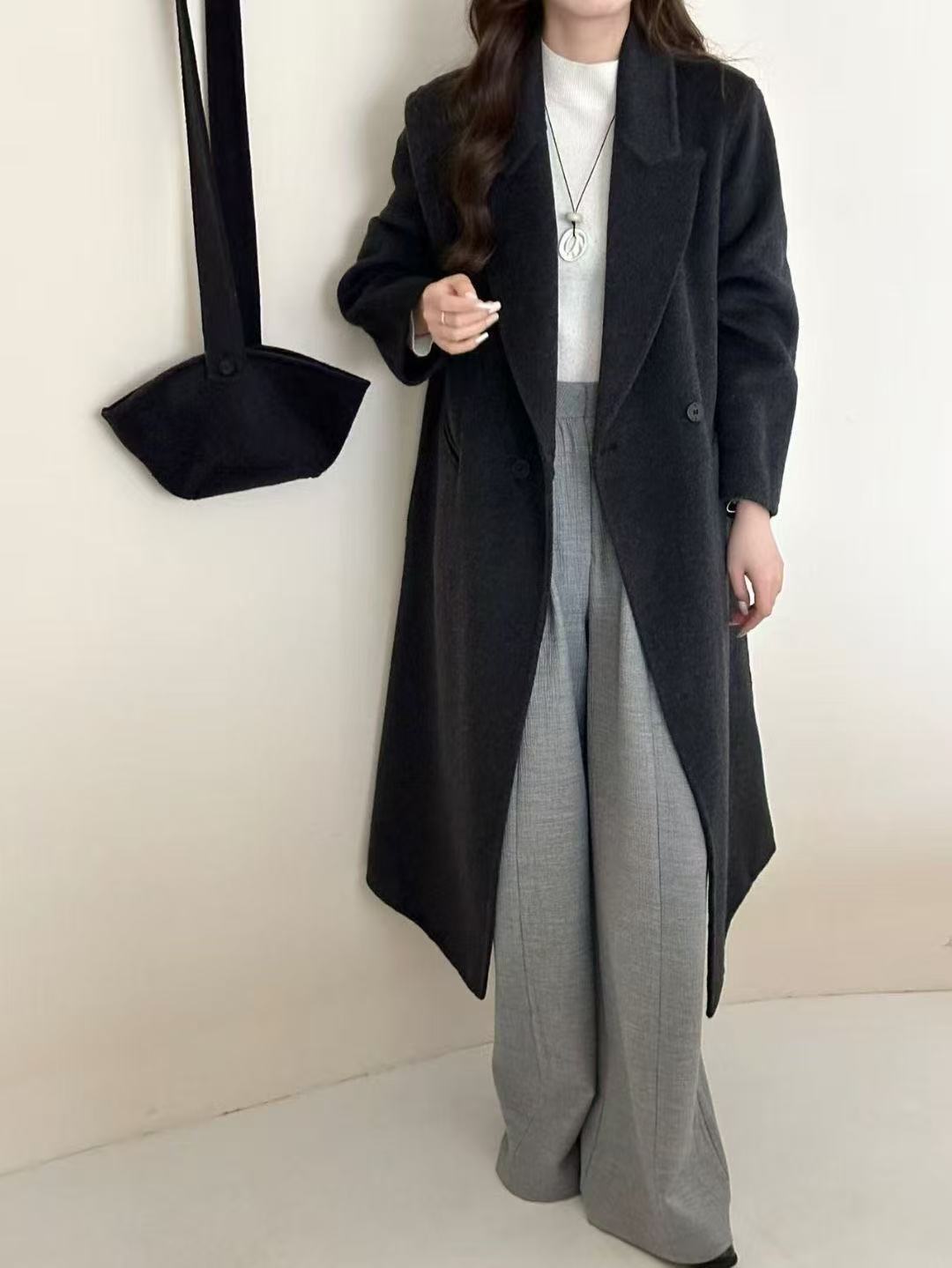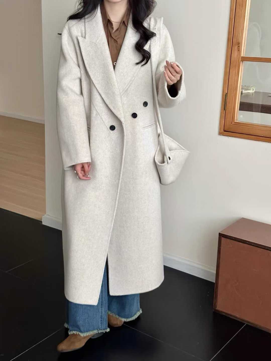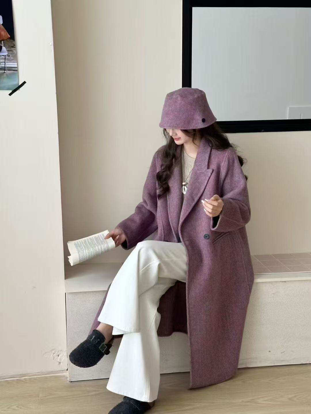 【YW】无忧购长款双面100%羊毛大衣西装领渔夫帽两件毛呢气质外套(截单后3-5天发货)