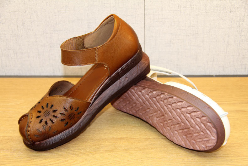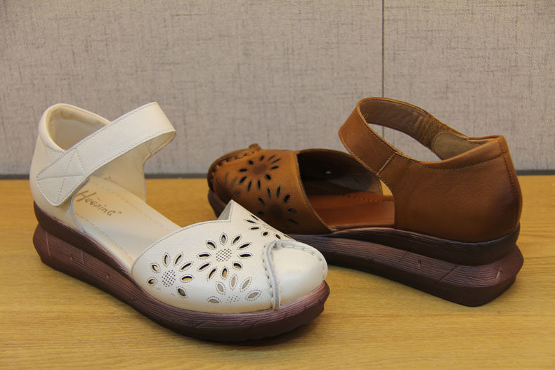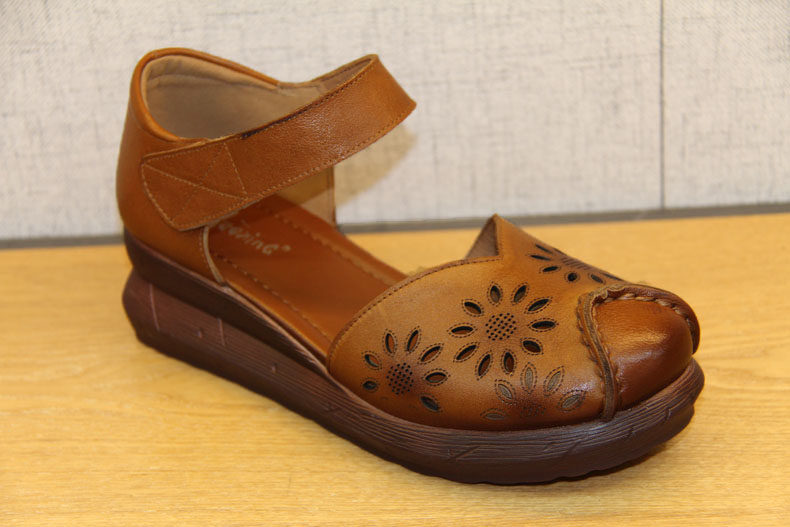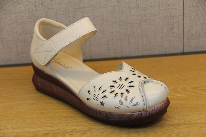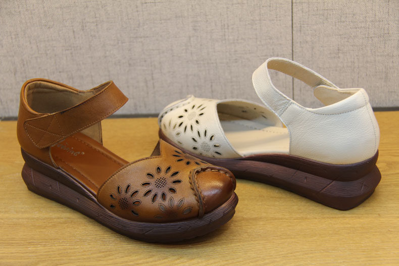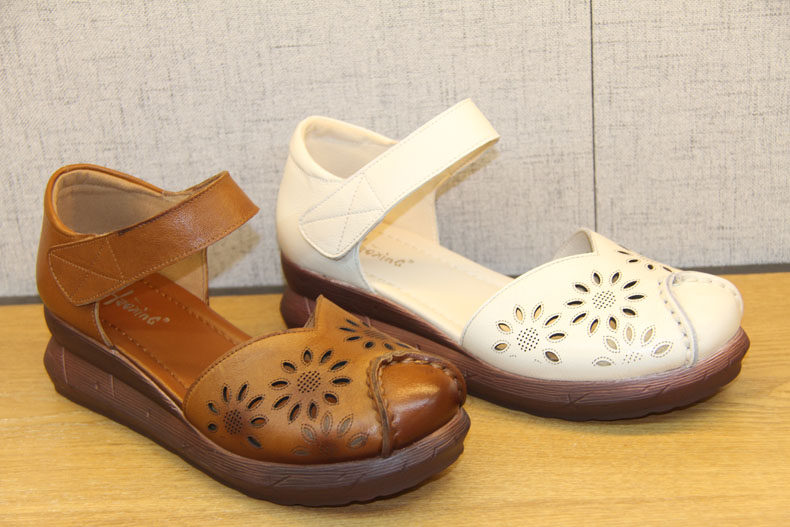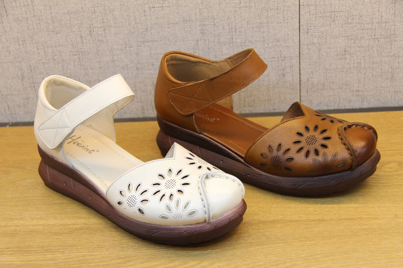豪行夏季新款20292888镂空真皮软底鞋复古坡跟女鞋防滑底百搭凉鞋