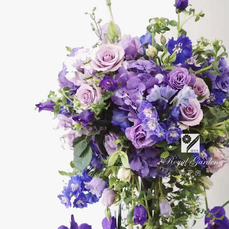 花艺选材:该产品选用了风铃草/阔叶武竹/海洋之歌/鸢尾花/飞燕/万代兰等;
