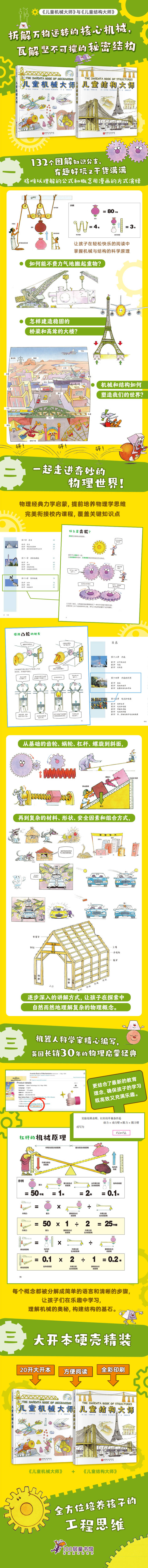 《儿童机械大师》是介绍物理学科中,有关机械物理知识的图文结合科普书,适读年龄为7-15岁。主要内容为机械物理的5大基础:轮子&滚轴,楔子,杠杆,滑轮,螺丝。《儿童机械大师》解释了所有基础机械装置,每个部分都解释了它们是如何运作的,并展示了它们的科学和数学原理;然后呈现出每个装置的系统、术语、结构、利弊;最后是应用实例。全书以图为主,文字为辅,以详细的图解,展示了每一个知识点,包括其概念、应用、原理、失败和成功的案例、自然界中存在的案例等。清晰的呈现了又难有复杂的机械物理概念。《儿童机械大师》内容可以奠定儿童机械物理启蒙的基础,并对机器人、设计等STEM相关领域的知识有补充。