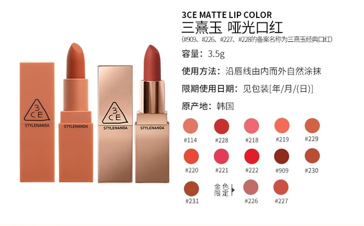 韩国 3CE三熹玉 哑光方管口红 3.5g