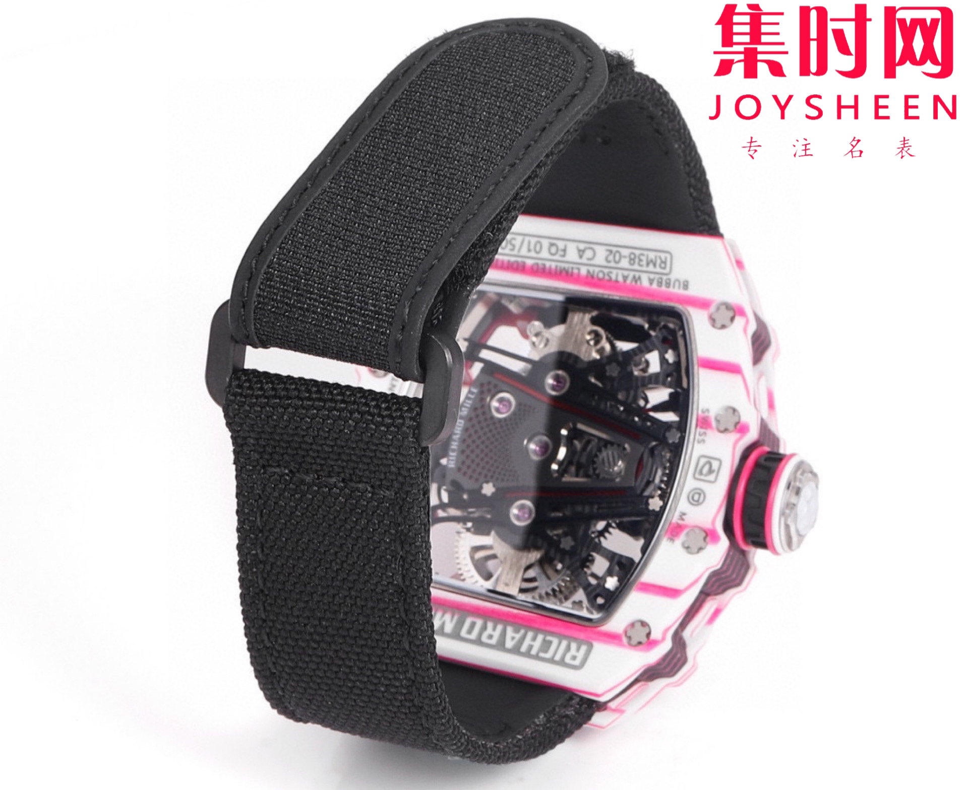 搭载定制RM38-02手动上链机械机芯,摆频28800vph,提供52小时动力储备。这枚机芯采用碳纤维制作镂空底板,具备优异的防震性能。桥板依然为坚固的 5级钛金属材质,背面的小孔亦融入粉色元素装饰。