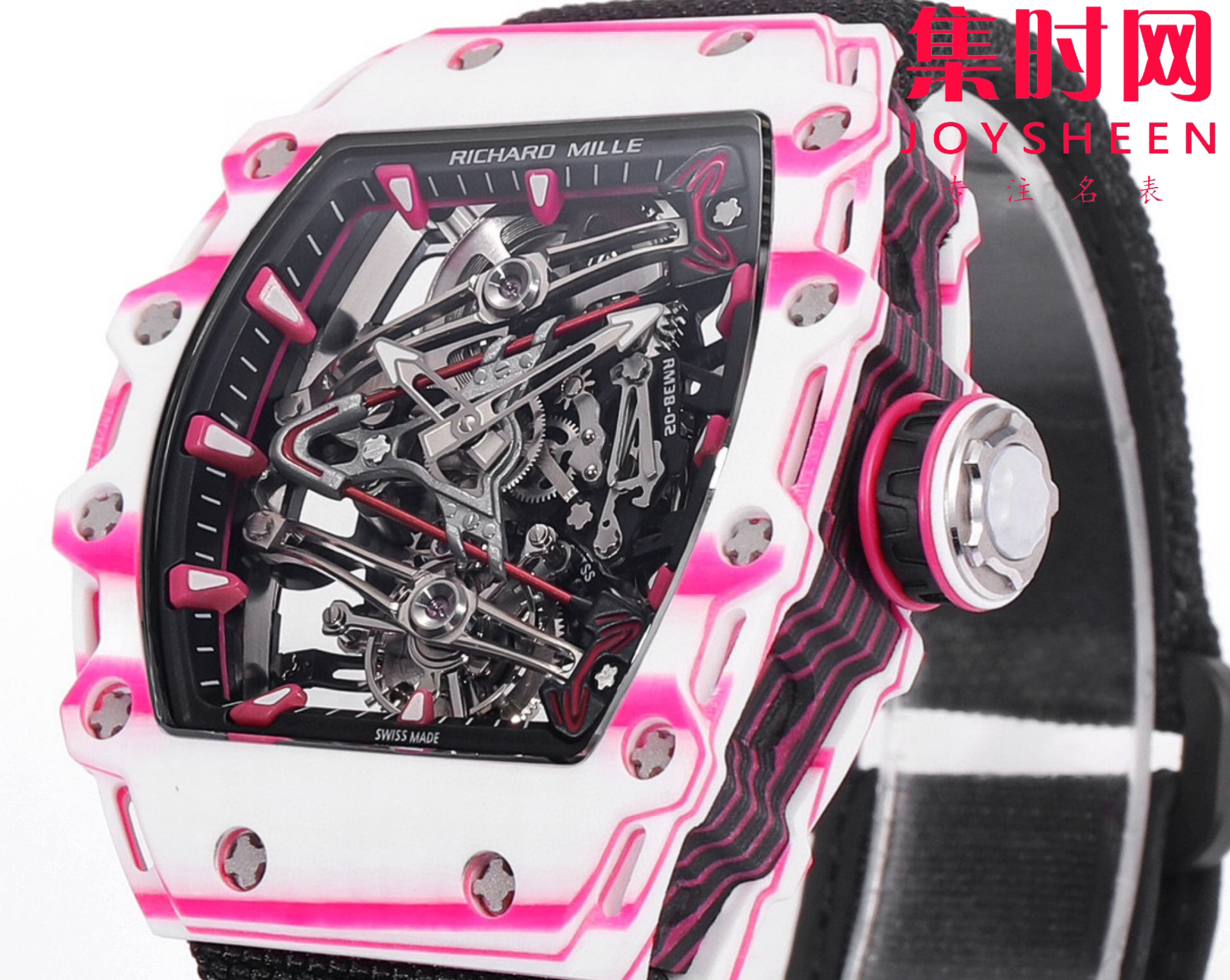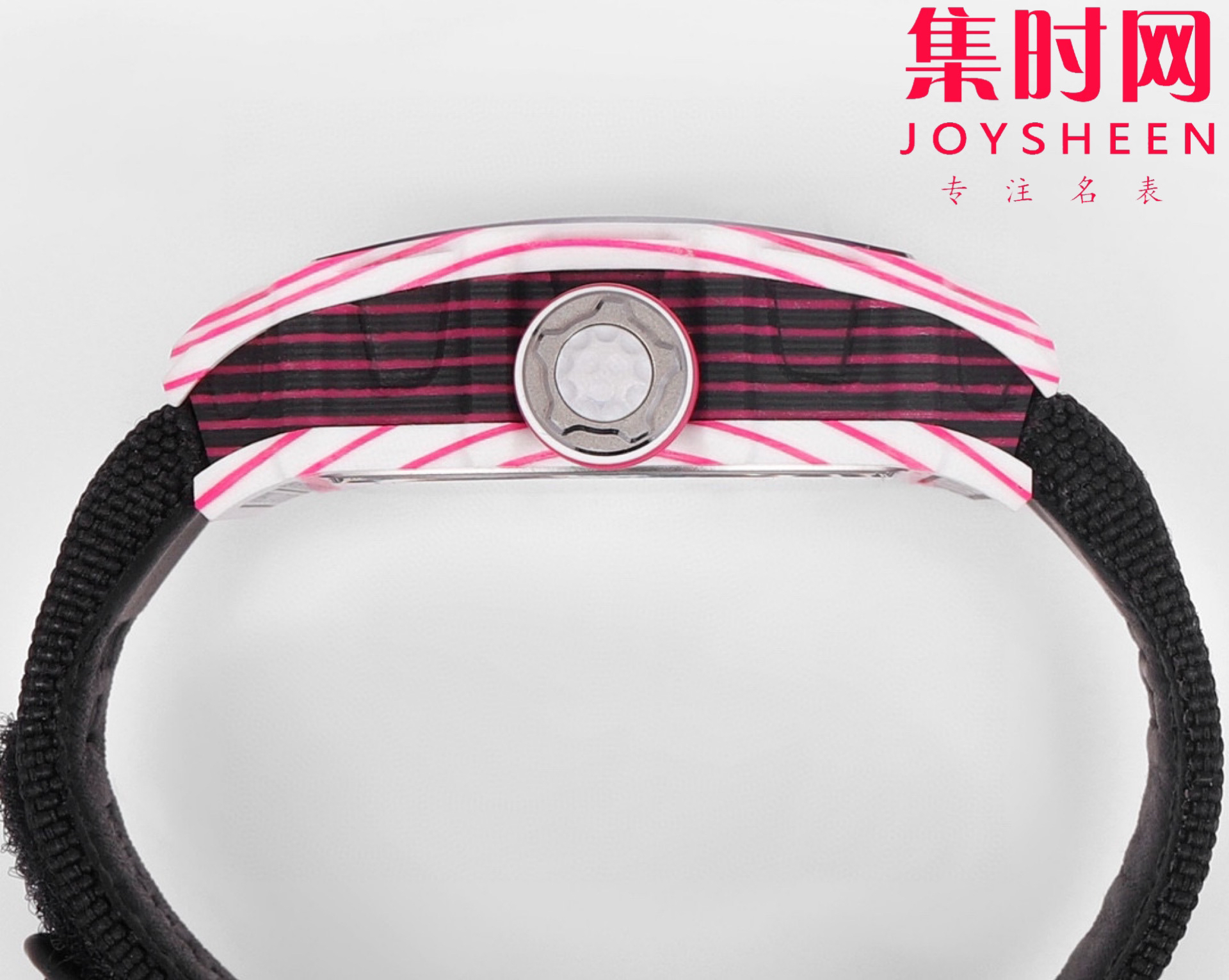 新作表圈和底盖采用粉色和白色石英碳纤维复合材料加工而成,中层表壳则以碳纤维和粉色石英碳纤维制成,每一个表壳都有独一无二的交错纹理。梯桶形表壳能够更舒适紧密的贴合手腕,表冠巧妙模仿高尔夫球的凹凸造型,是颇为有趣的细节。