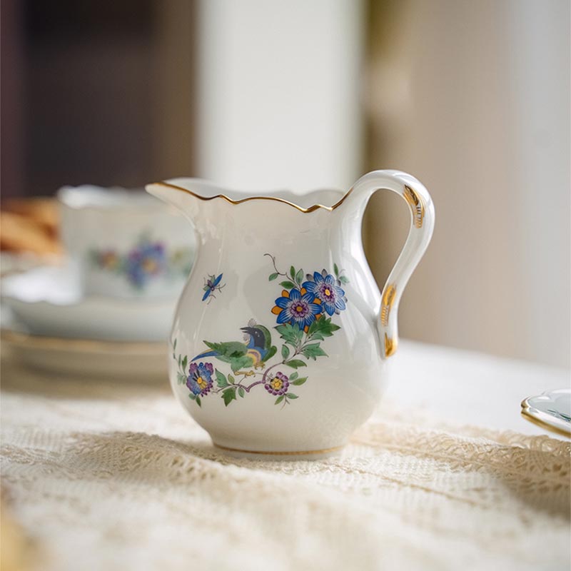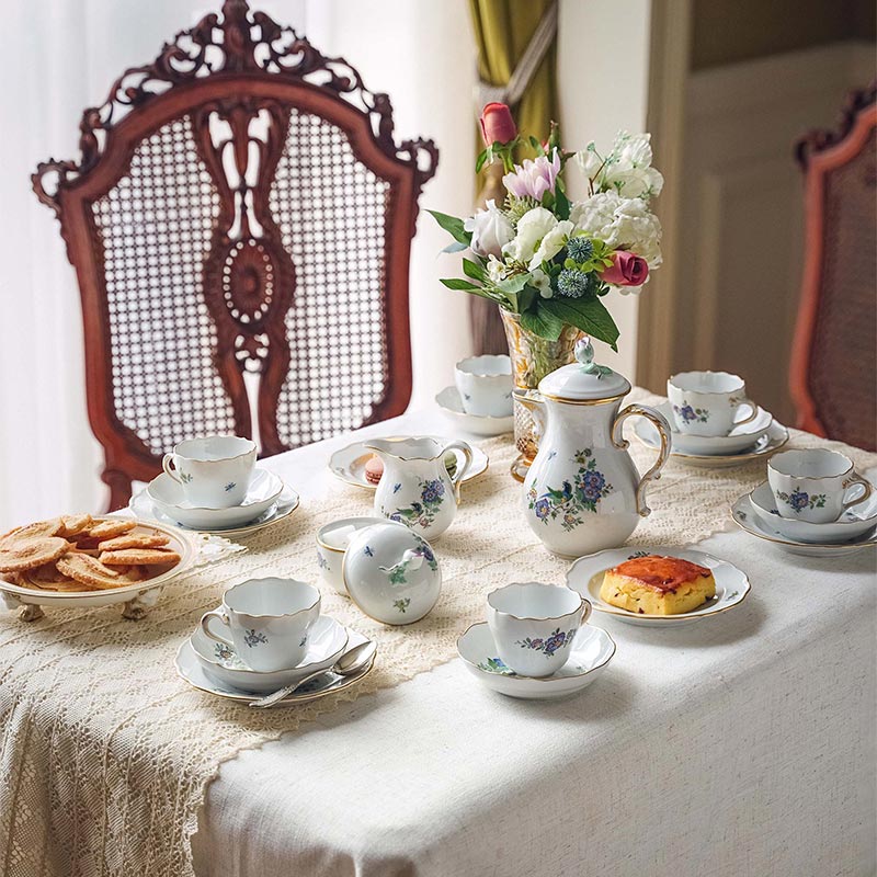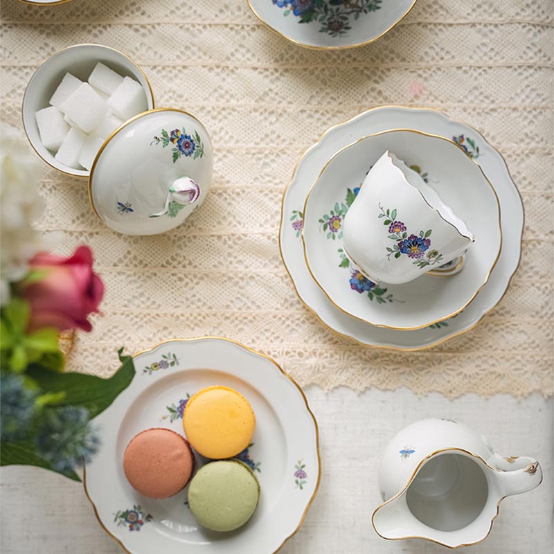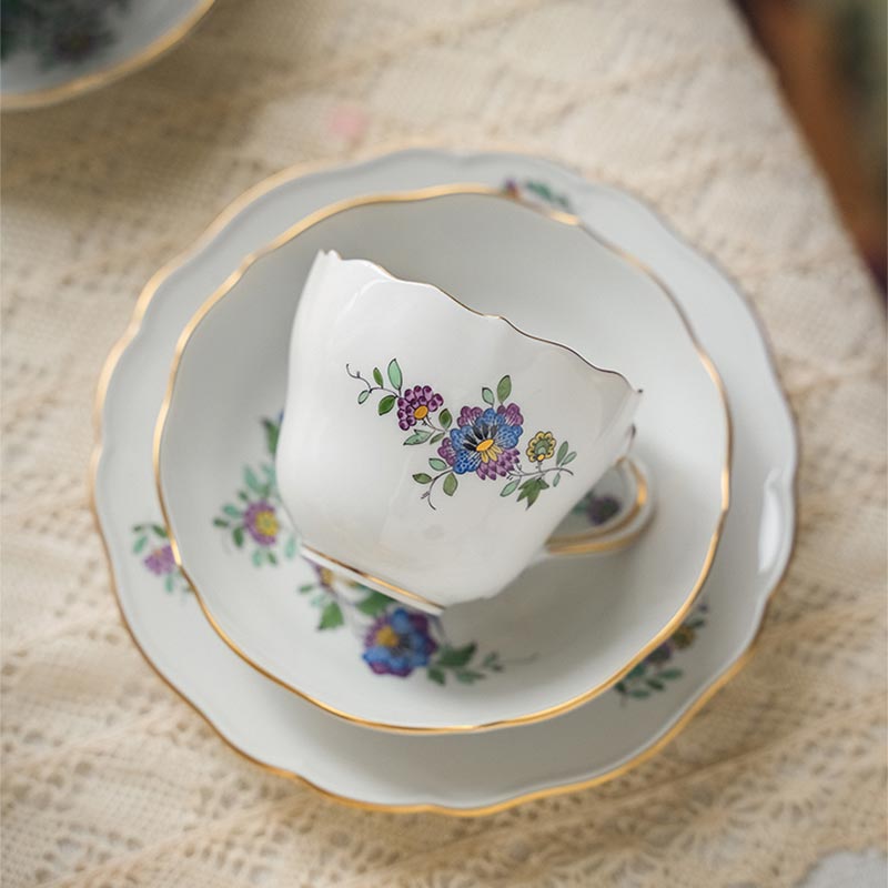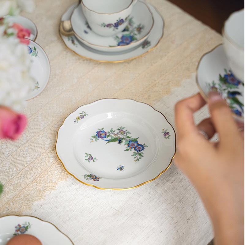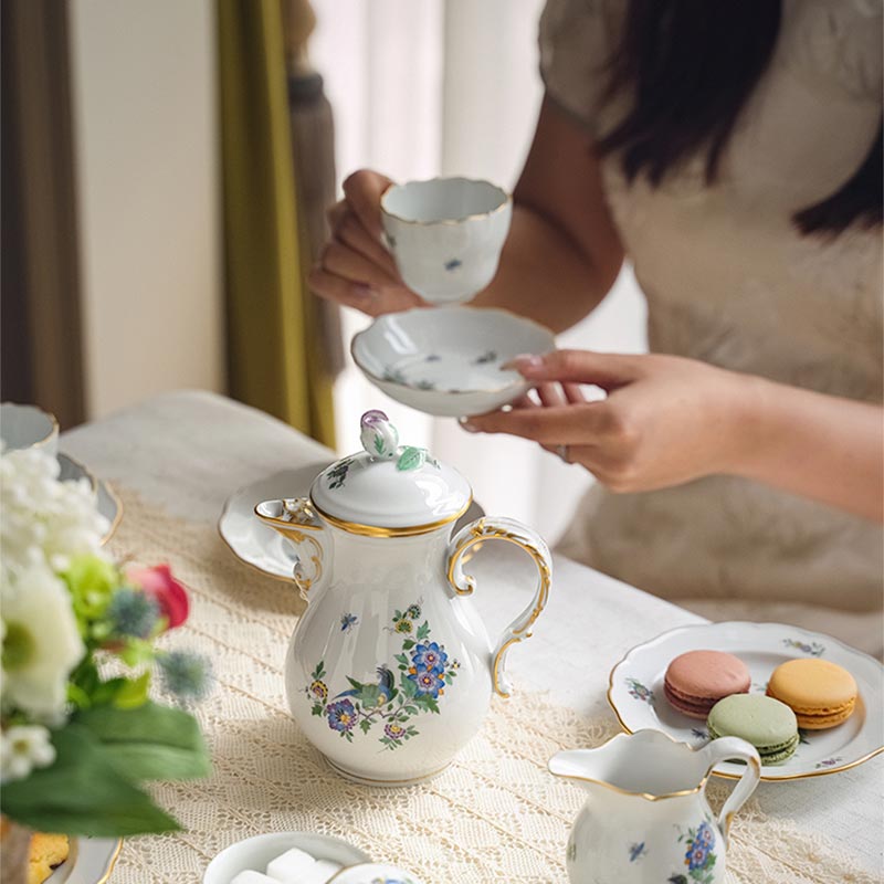 1980年代德国著名瓷窑梅森Meissen出品印度岩石花鸟系列主题手绘描金装饰六人下午茶瓷器套件