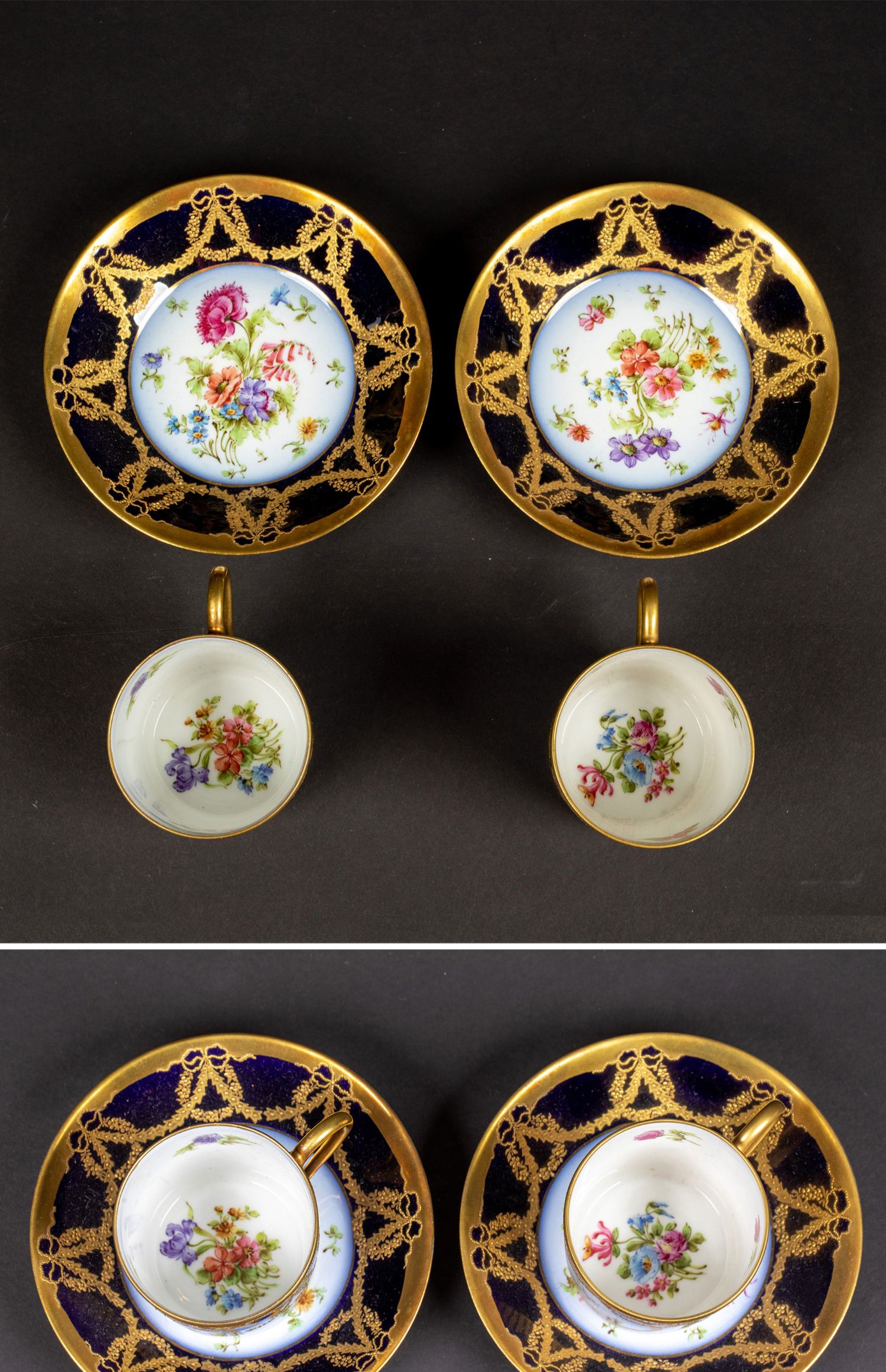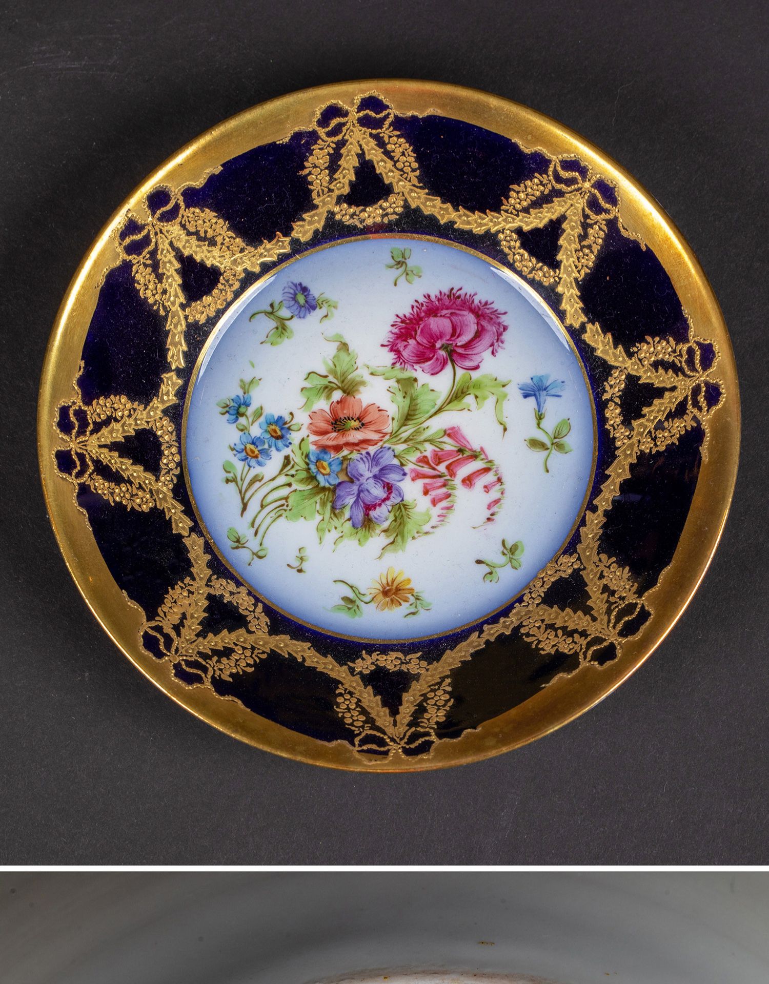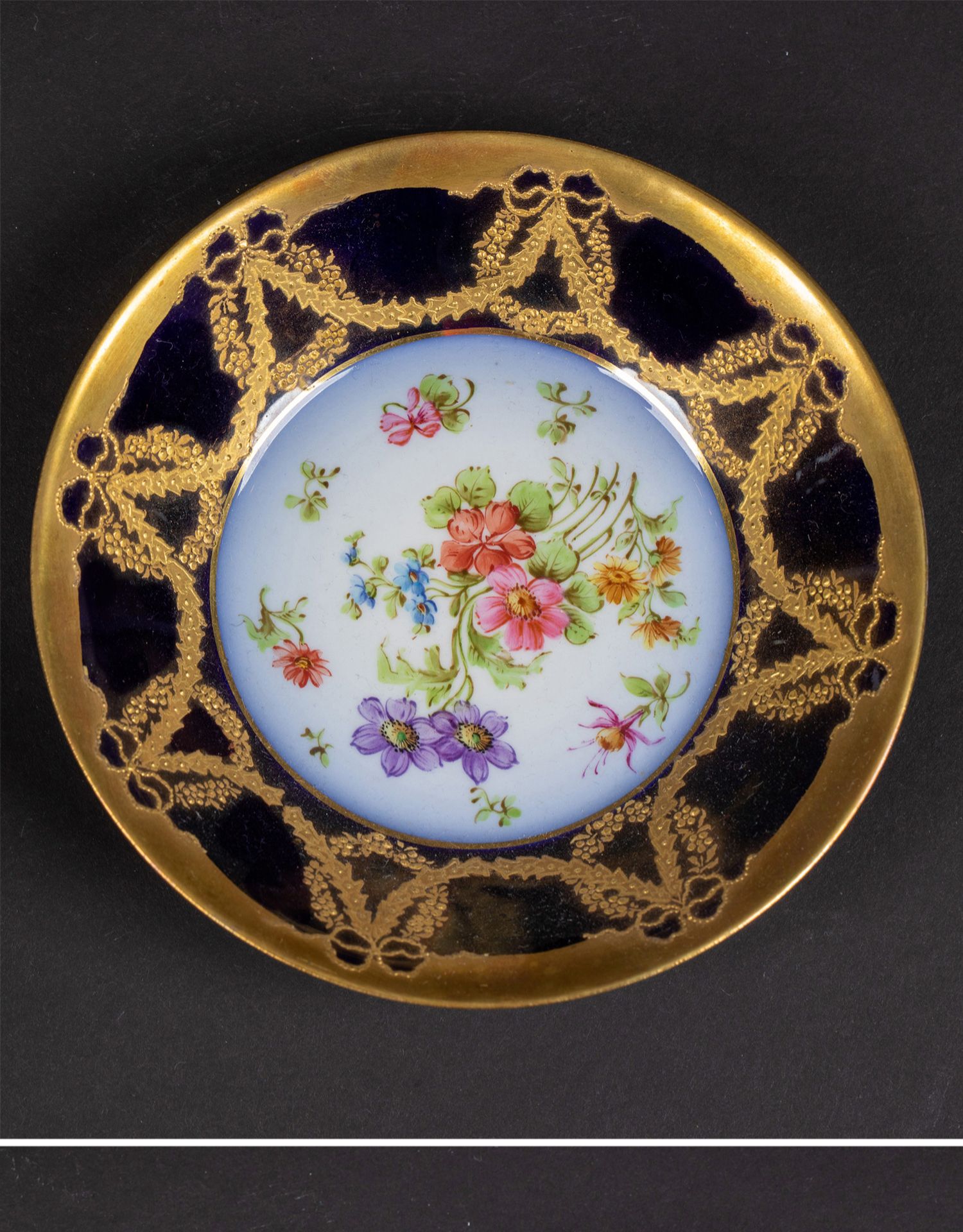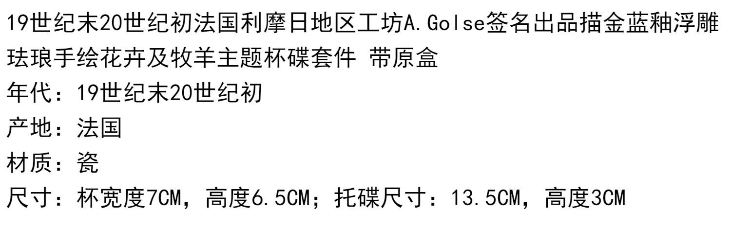 独角鹿西洋古董法国描金蓝釉浮雕珐琅手绘花卉瓷器杯碟双人套装