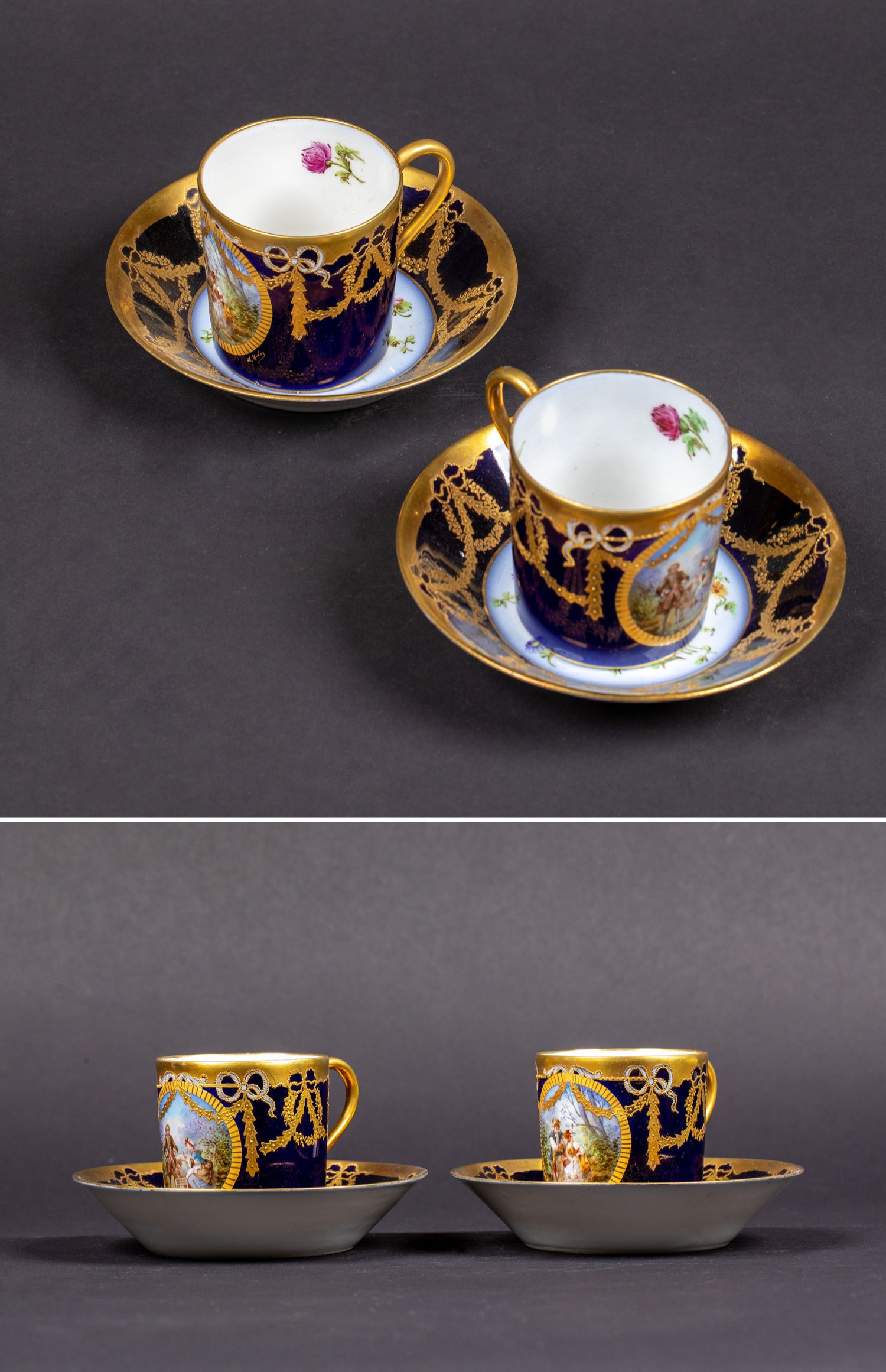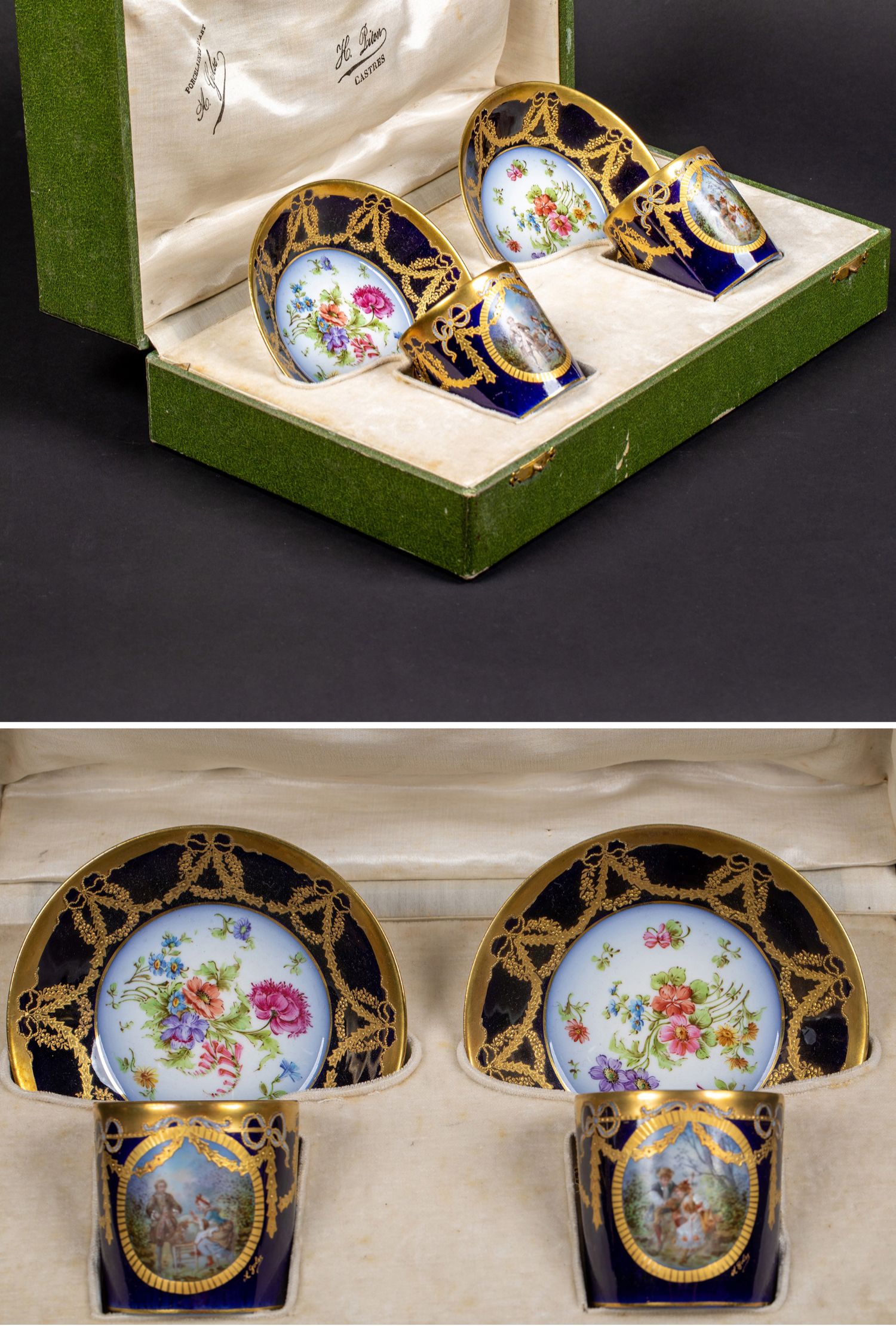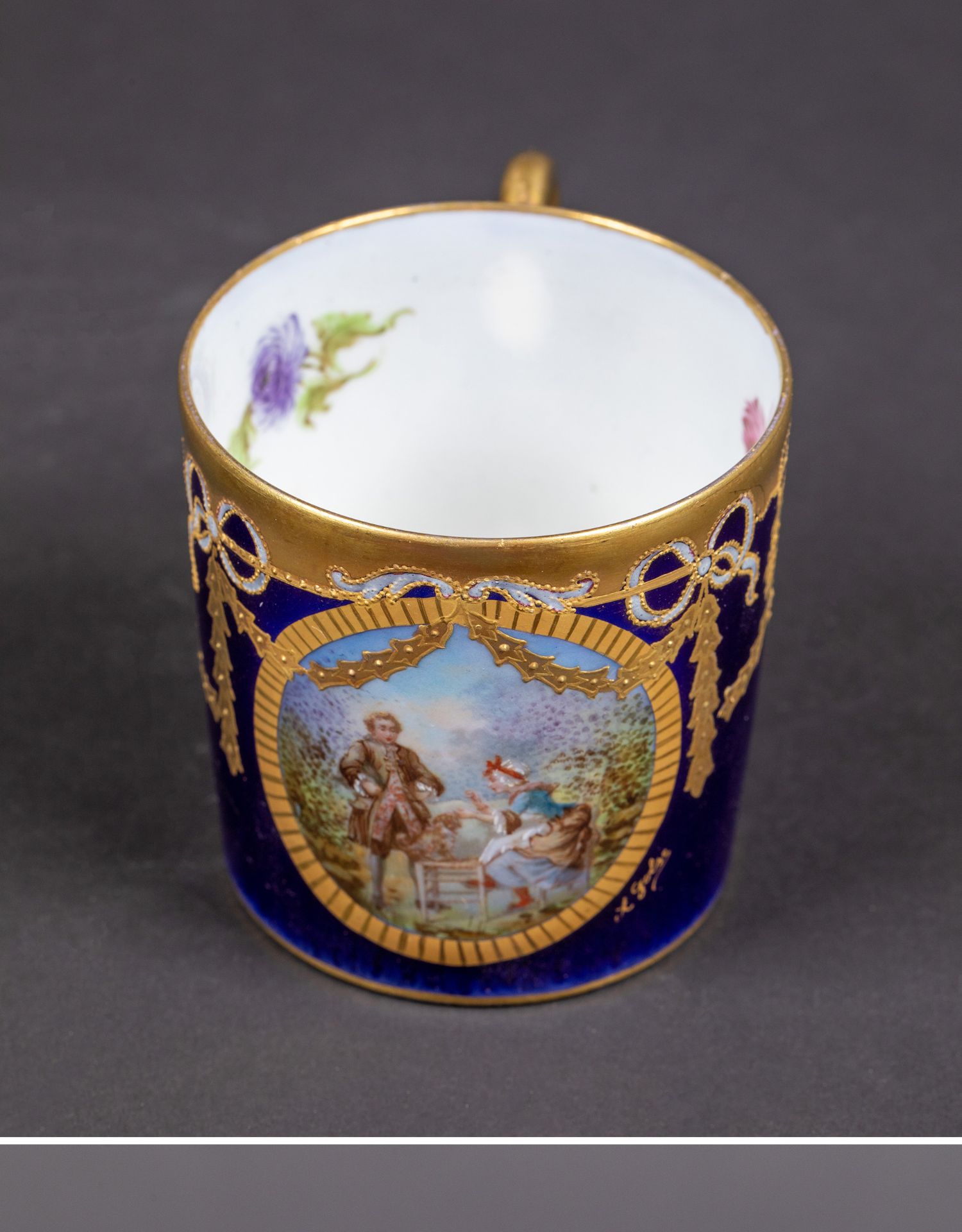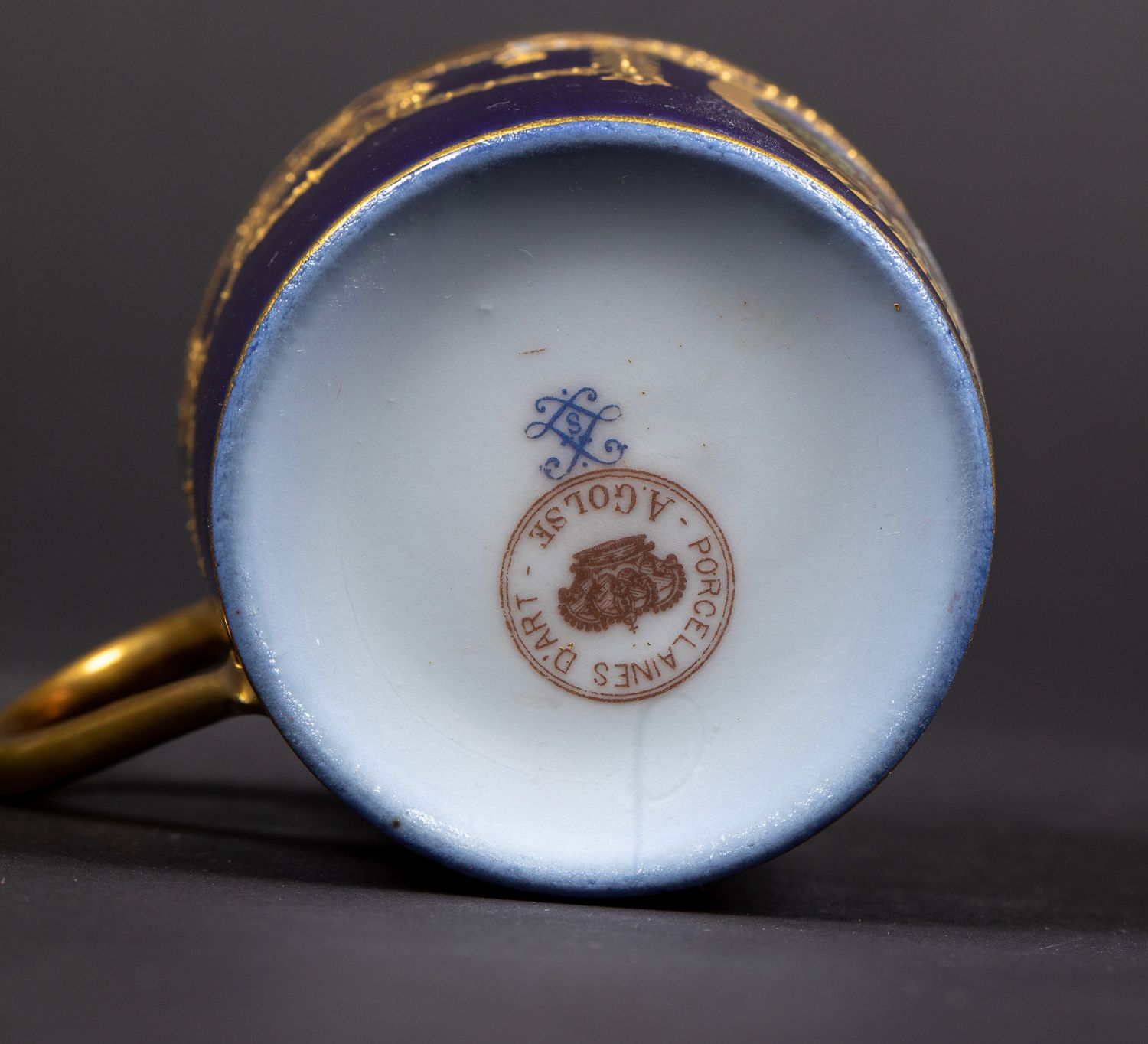 独角鹿西洋古董法国描金蓝釉浮雕珐琅手绘花卉瓷器杯碟双人套装