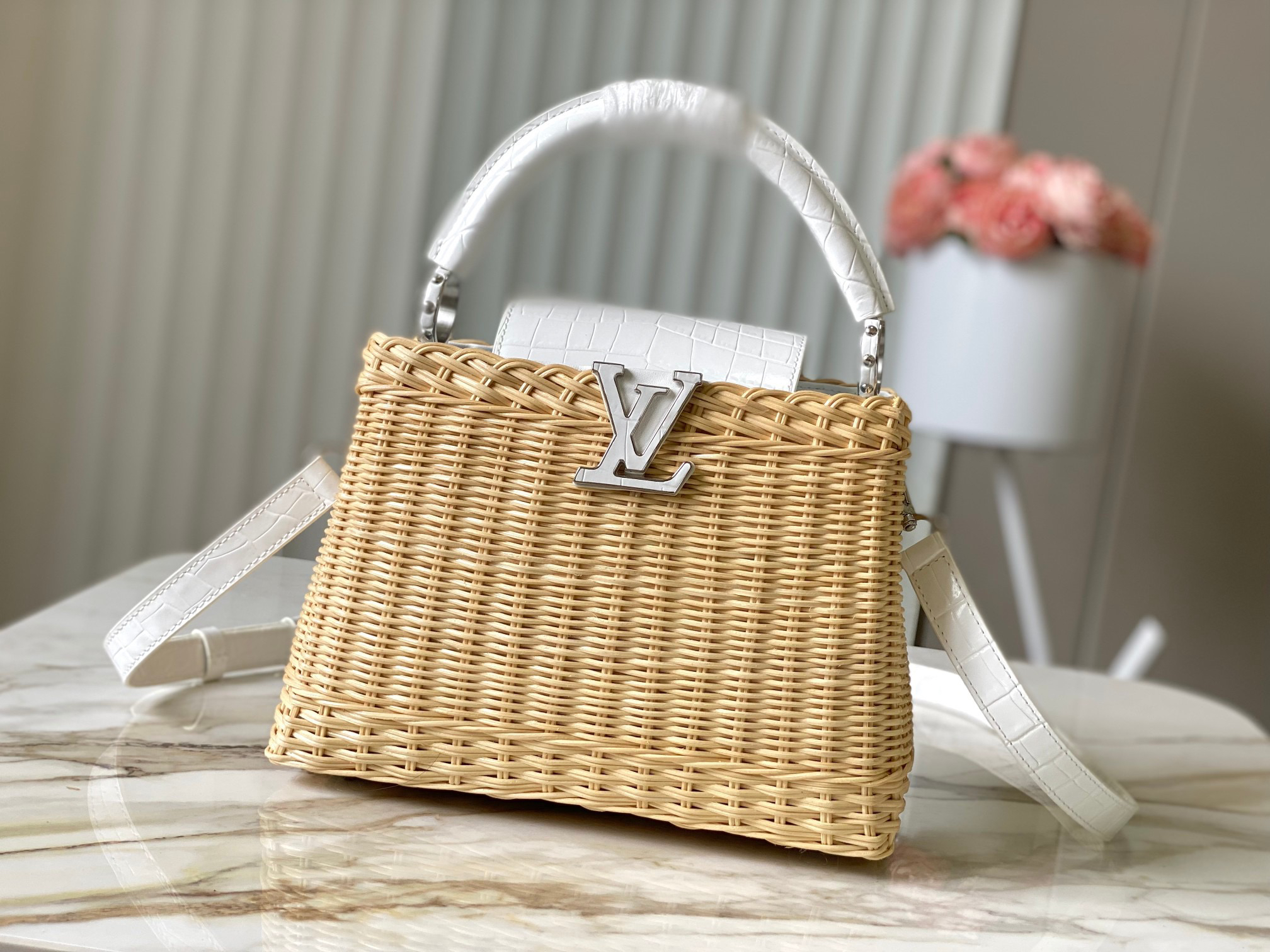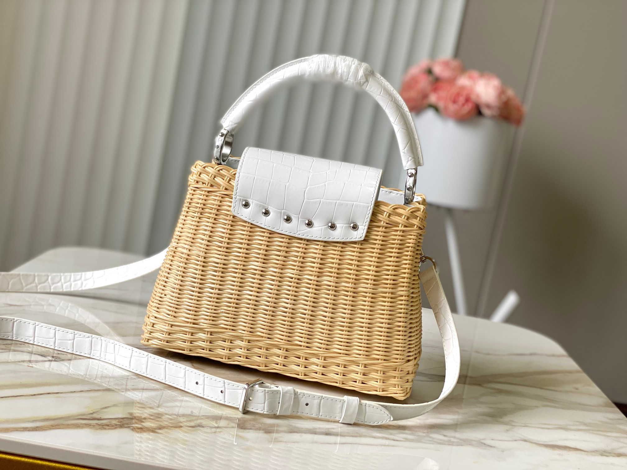 秋冬特惠💰1700 渠道级LV 新品 te级LV 动态芯片 N85520/M48865白鳄鱼竹篮 本款Capucines手袋向路易威登于1892年推出的Picnic 硬箱汲取灵感 洋溢浓郁夏日风情 藤条包身需要数天的匠心编织方可完成 皮革饰边和耀目LV 字母完善细节 斜挎、肩背或手提皆宜 Size : 27 * 18 * 9 CM