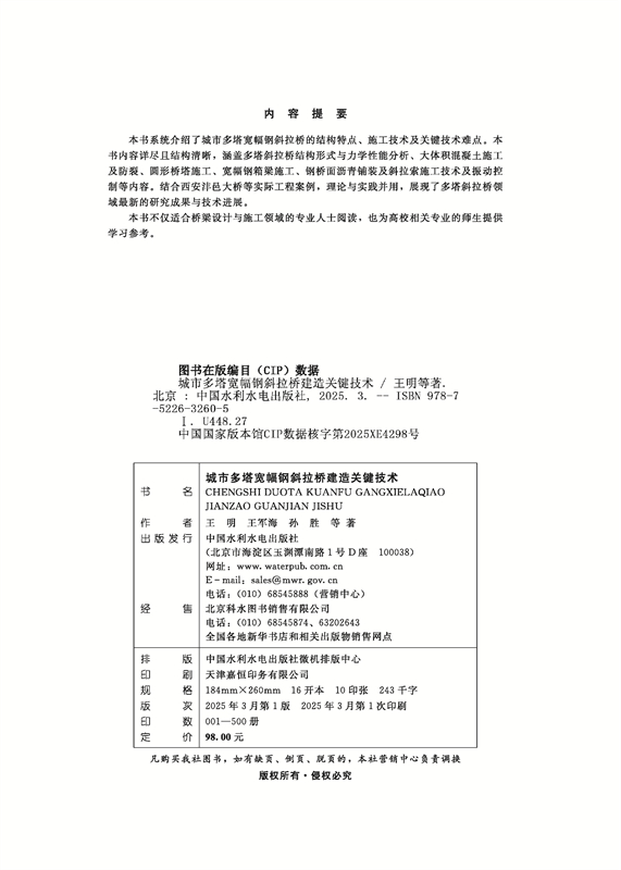 本书系统介绍了城市多塔宽幅钢斜拉桥的结构特点、施工技术及关键技术难点。本书内容详尽且结构清晰,涵盖多塔斜拉桥结构形式与力学性能分析、大体积混凝土施工及防裂、圆形桥塔施工、宽幅钢箱梁施工、钢桥面沥青铺装及斜拉索施工技术与振动控制等内容。结合西安沣邑大桥等实际工程案例,理论与实践并用,展现了多塔斜拉桥最新的研究成果与技术进展。