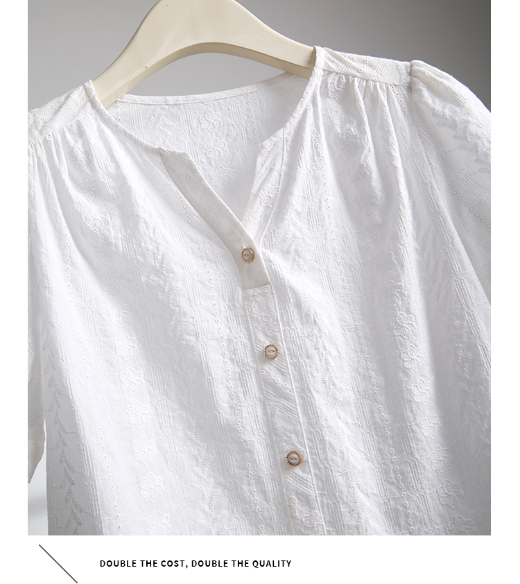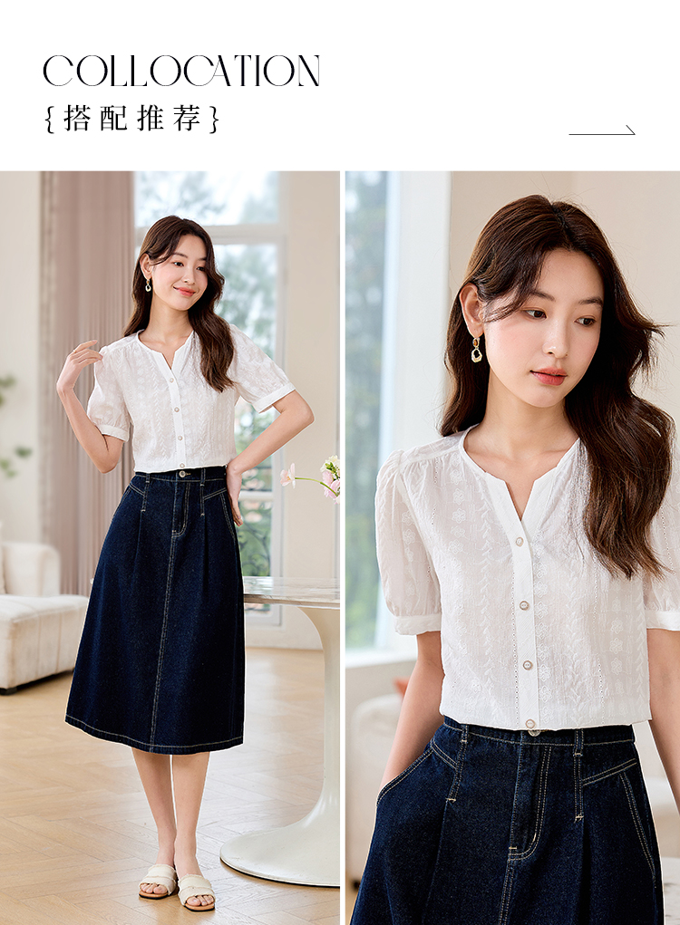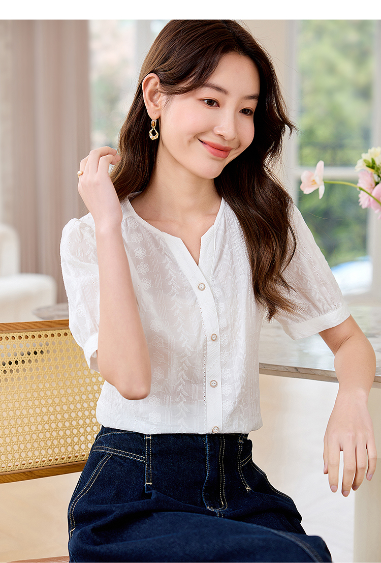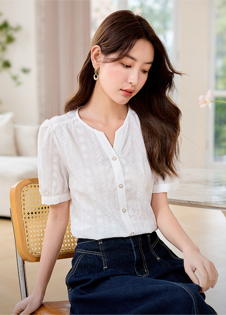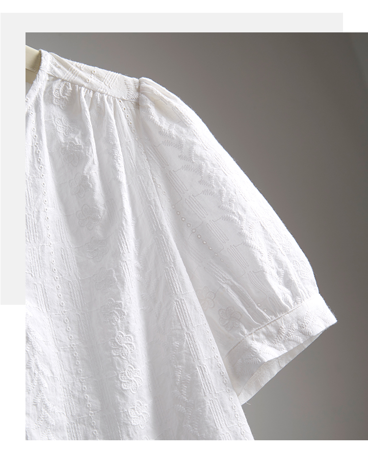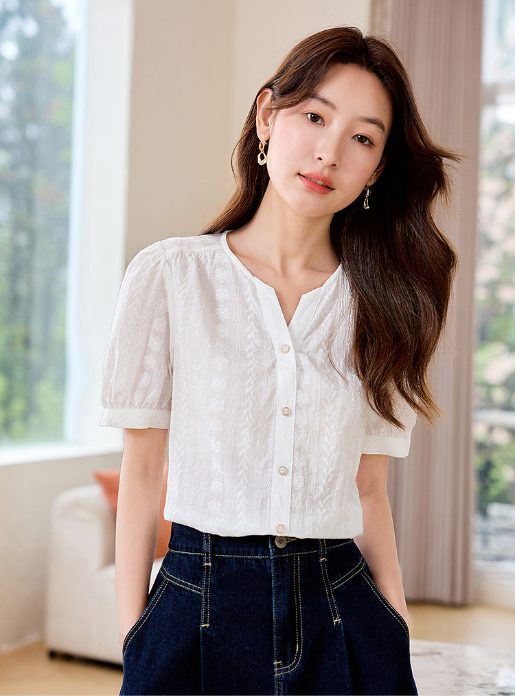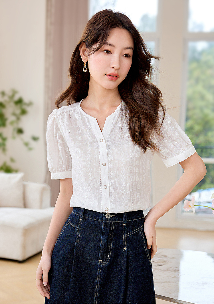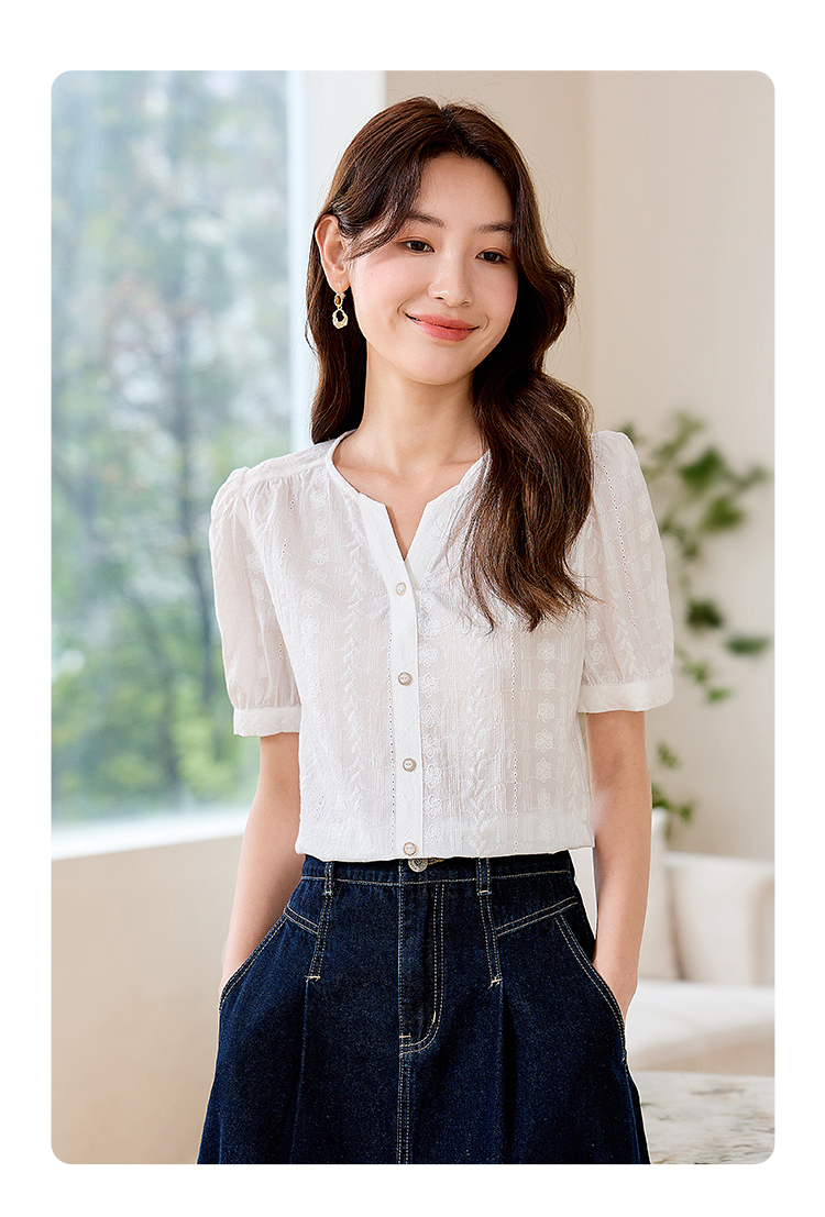 【专属好价】熙世界法式白衬衫短袖2025夏装新款气质刺绣衬衣泡泡袖纯棉上衣