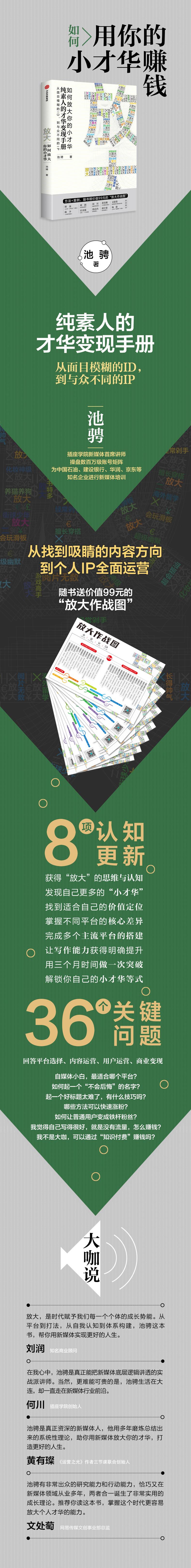 1.系统全面的新媒体从业指南。在新媒体时代,“放大”自己的小才华成为一个人的底层能力。本书从找到适合自己的平台和内容方向,到如何进行内容运营、用户运营、商业变现,结合大量真实或虚构的案例,手把手教你放大自己的小才华,快速打造个人品牌,涨粉变现,甚改变命运。