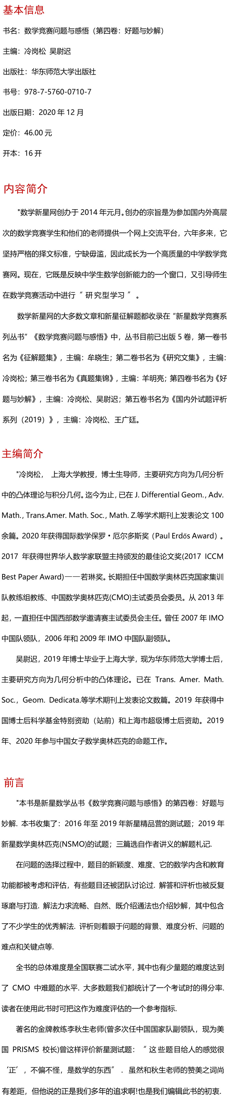 本书是新星数学丛书《数学竞赛问题与感悟》的第四卷:好题与妙解。本书收集了2016年至2019年新星精品营的测试题、2019年新星数学奥林匹克(NSMO)的试题、三篇选自作者讲义的解题札记。