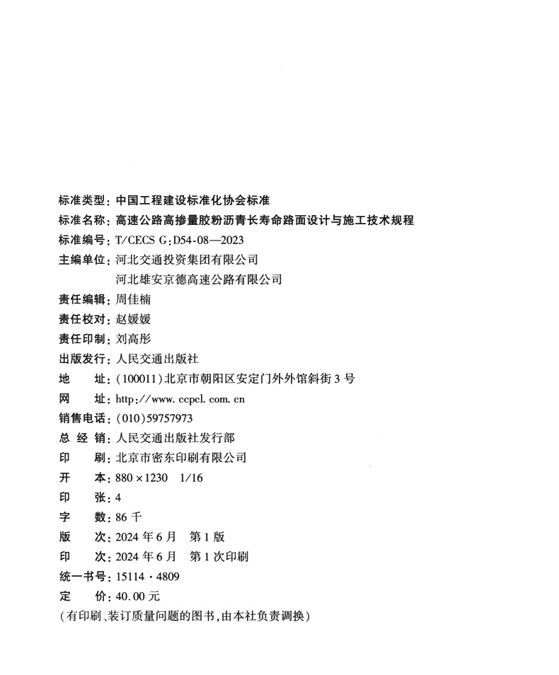 书名:高速公路高掺量胶粉沥青长寿命路面设计与施工技术规程(T/CECS G:D54-08—2023)