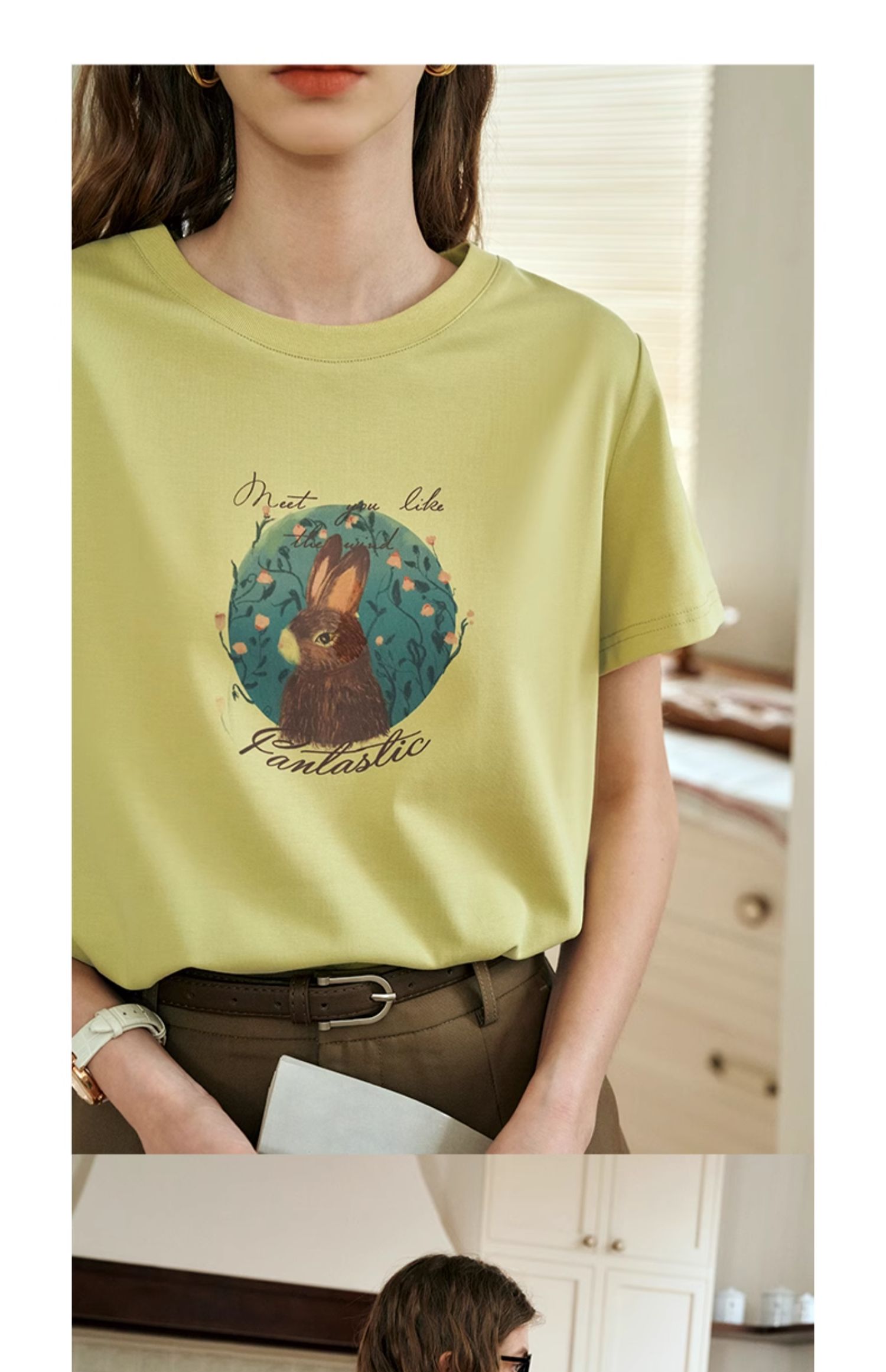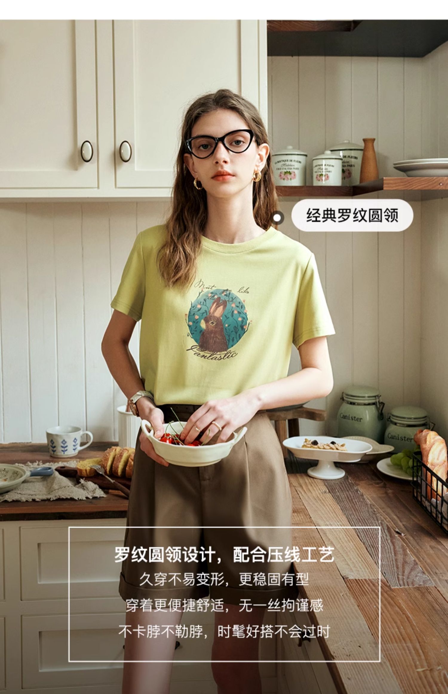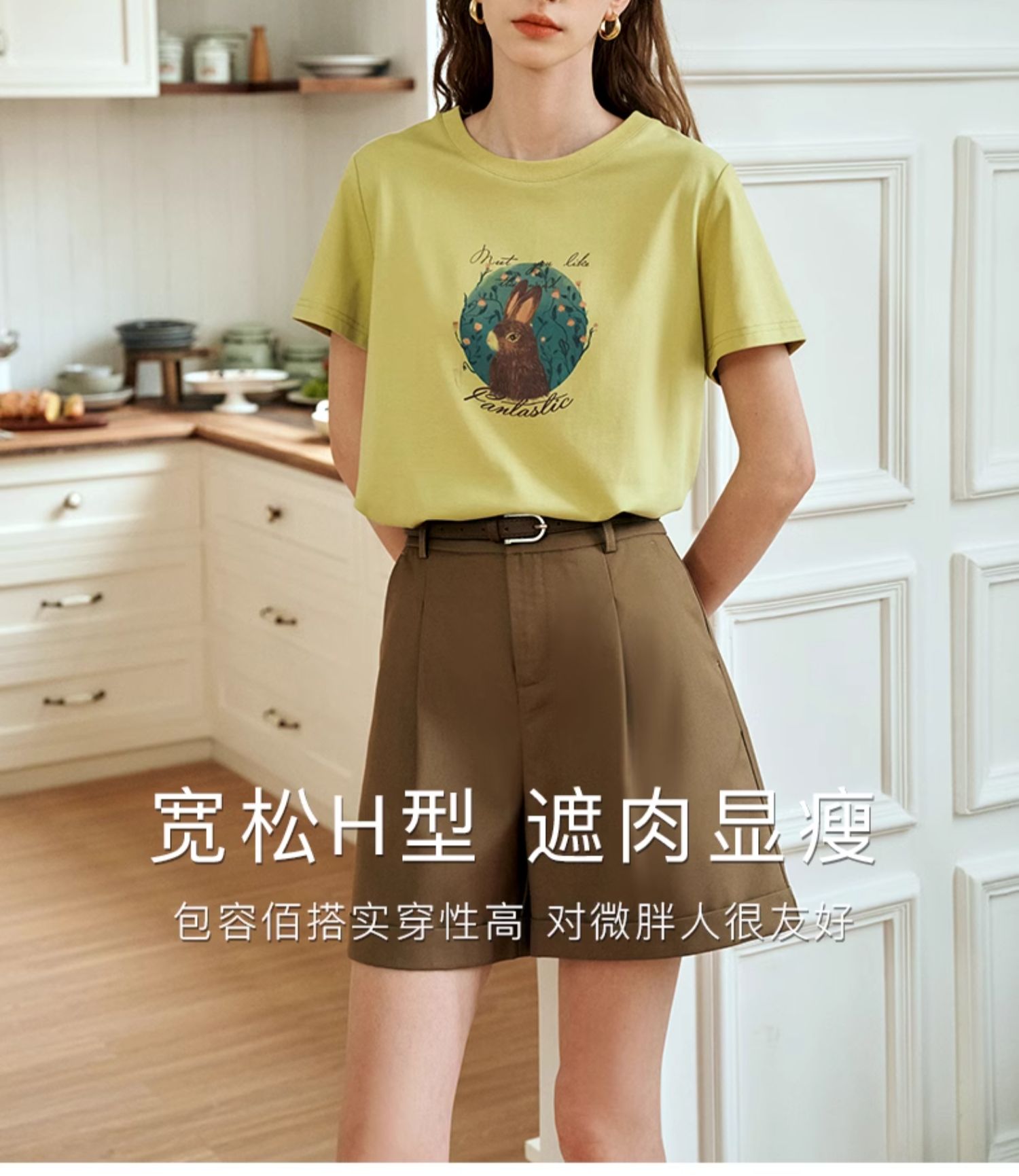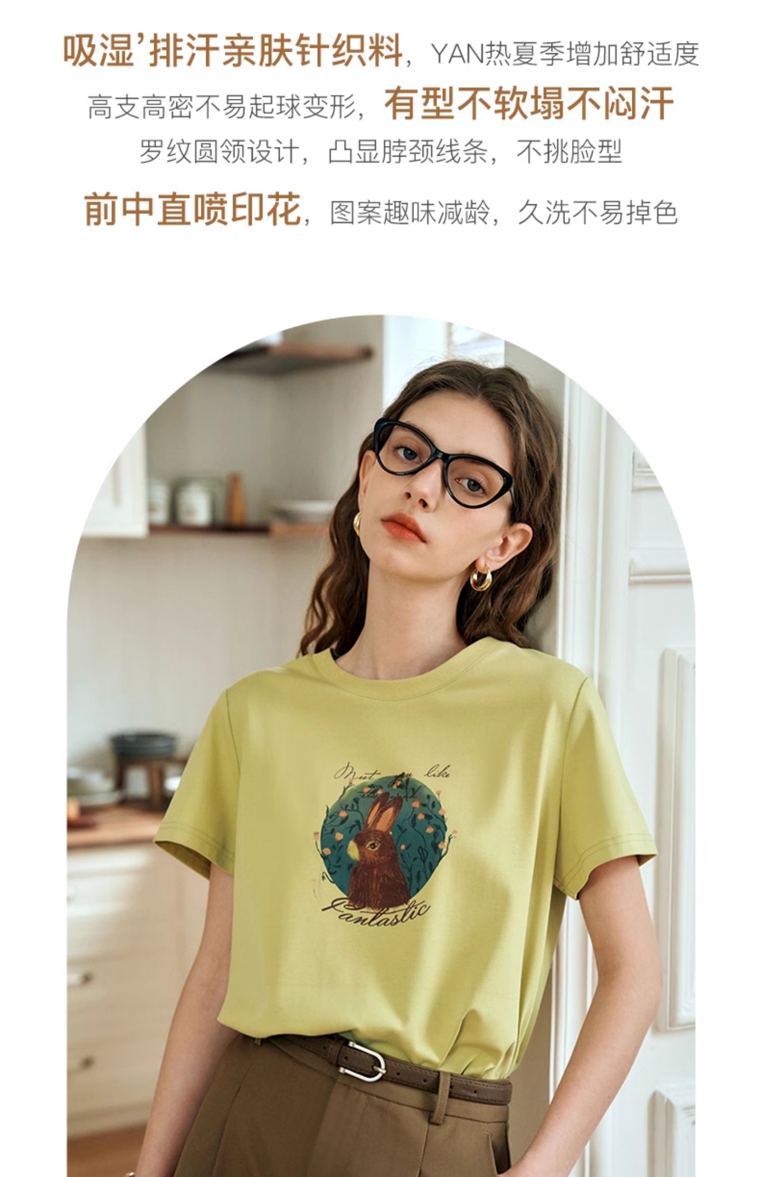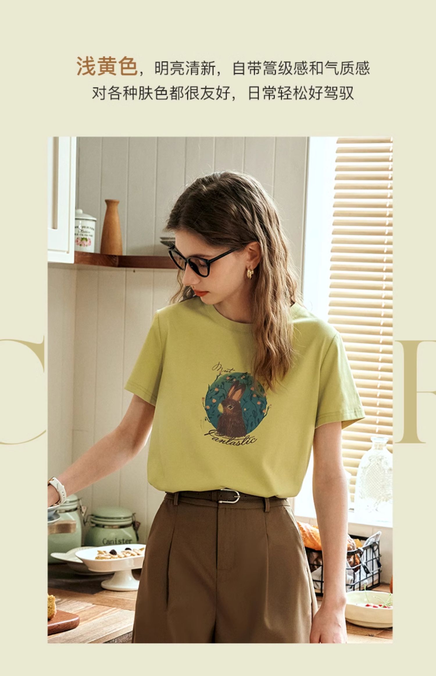 OLrain欧芮儿浅黄色短袖T恤女夏季2024新款简约百搭松鼠印花上衣