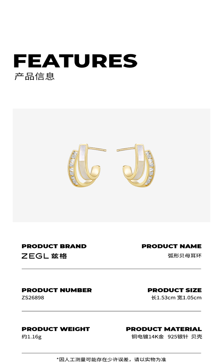 ZEGL法式高级感贝壳耳钉女小众设计感耳环复古925银针C型通勤耳饰