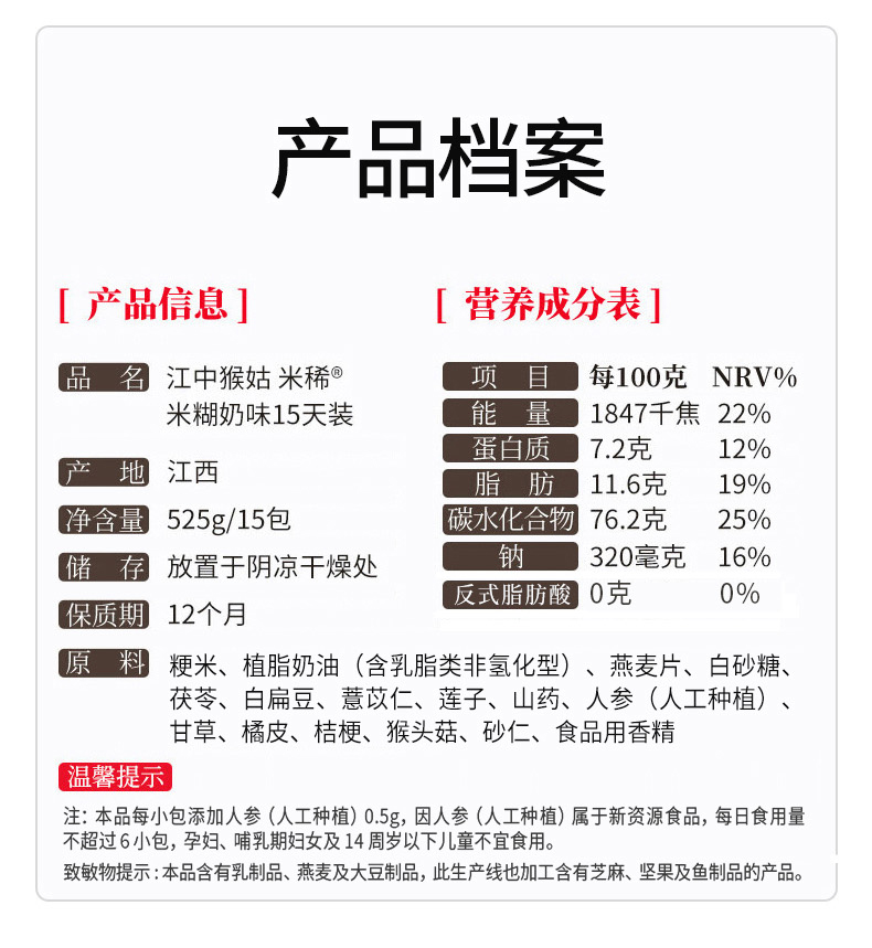 【味香奶甜】江中猴姑米稀奶味米糊15天养胃猴头菇代餐营养粉