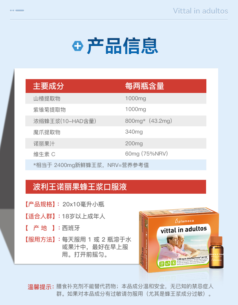 【邱震海专属】西班牙进口Plameca成人蜂王浆 波利王诺丽果蜂王浆口服液 20瓶/盒(有效期至2026年3月,介意慎拍)