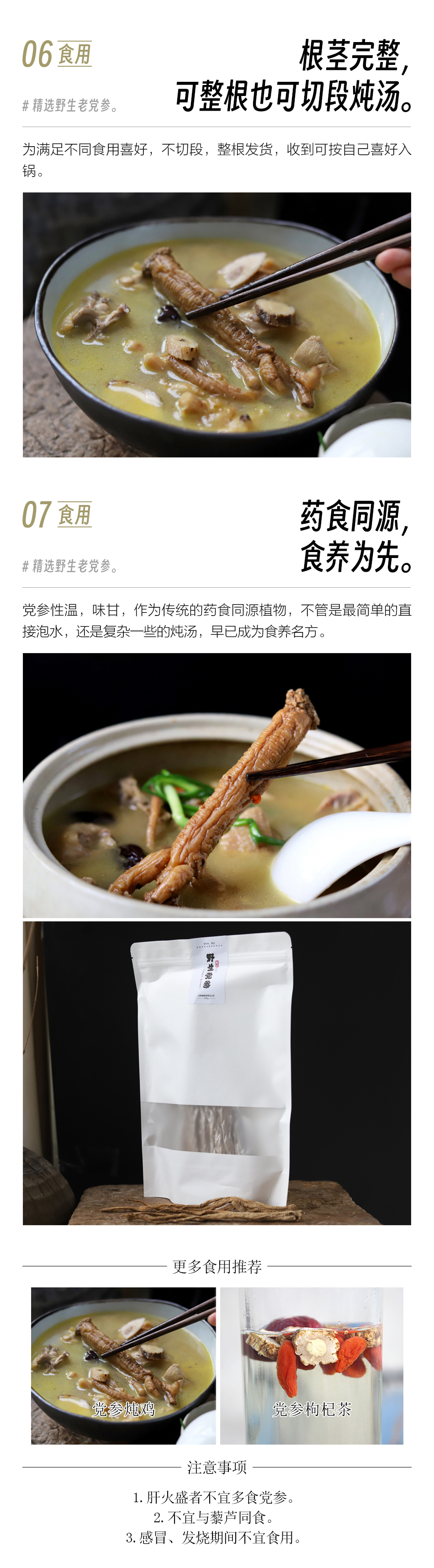 【品名】岷县野生党参 【规格】250g/袋 【品级】特级 【采集人】周尚书 【采集标准】野生采挖,十五年以上生长期,自然晾晒不熏硫 【生产日期】见包装 【保质期】18个月 【食用方法】洗净后炖汤或与黄芪、枸杞一同泡饮 【保存方法】阴凉避光密封保存 【采挖地址】甘肃省岷县周边山区 【注意事项】感冒、发烧患者、孕妇不宜食用,肝火旺盛者也少食用为佳,不宜与藜芦同食。 【注意事项】 1、受天气或库存等原因影响快递可能偶有耽误,急单请发货前咨询客服。 2、已发货后不接受没有沟通的退款申请。