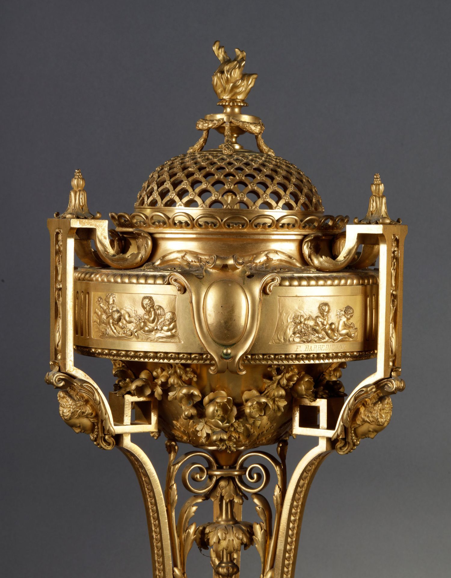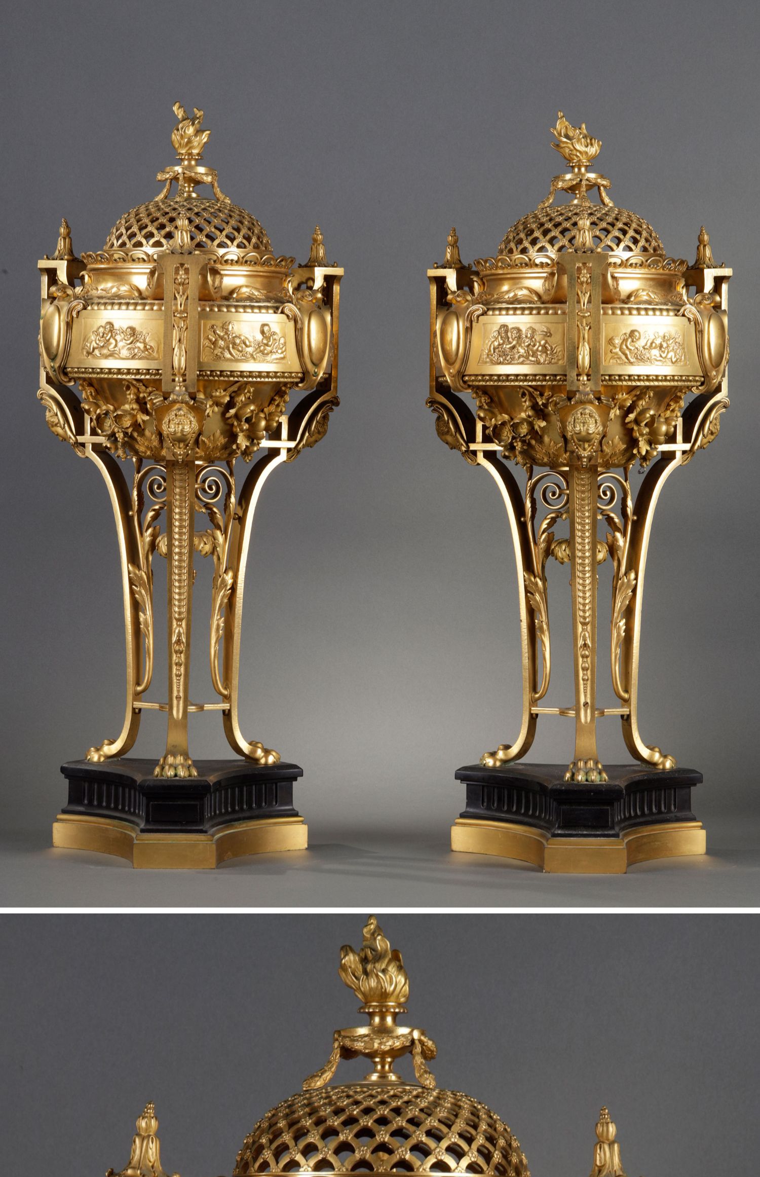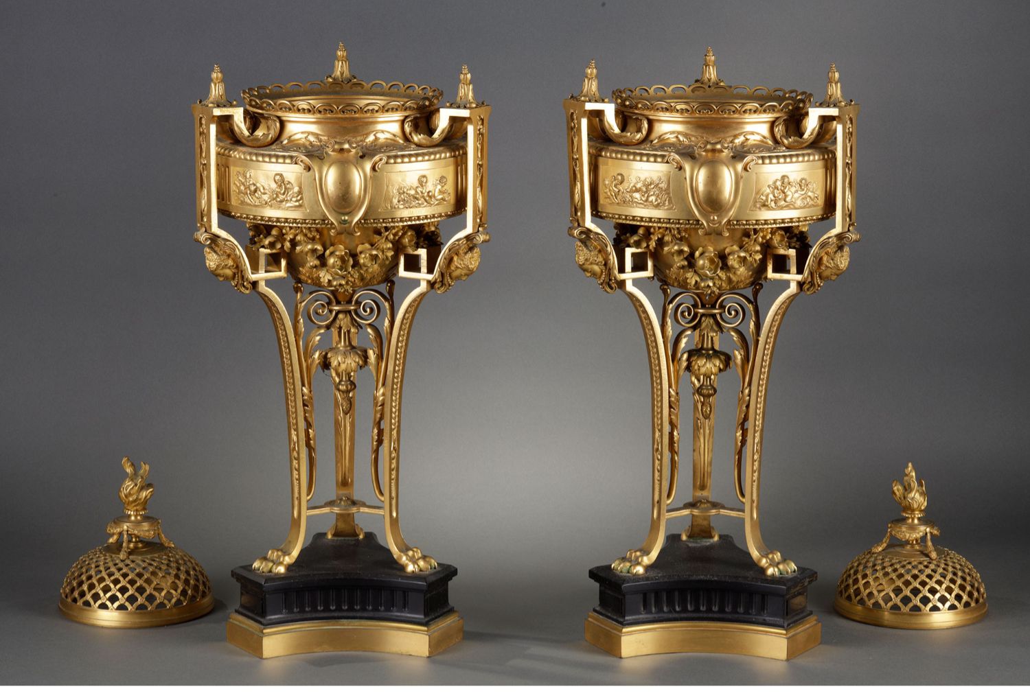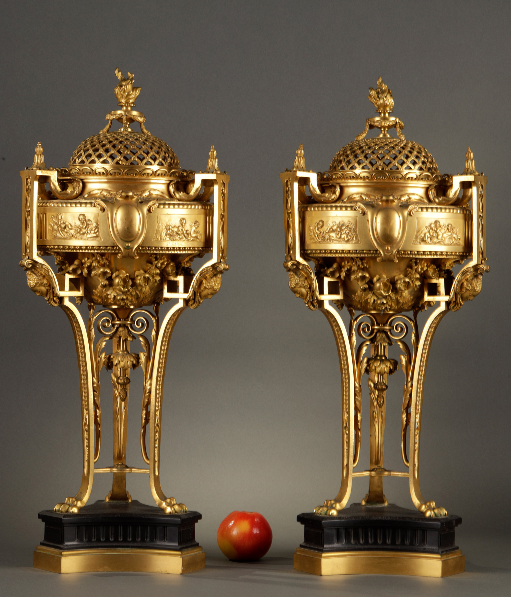 独角鹿西洋古董法国新古典主义风格铜鎏金大理石底座薰香炉一对