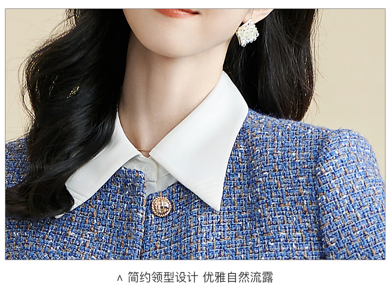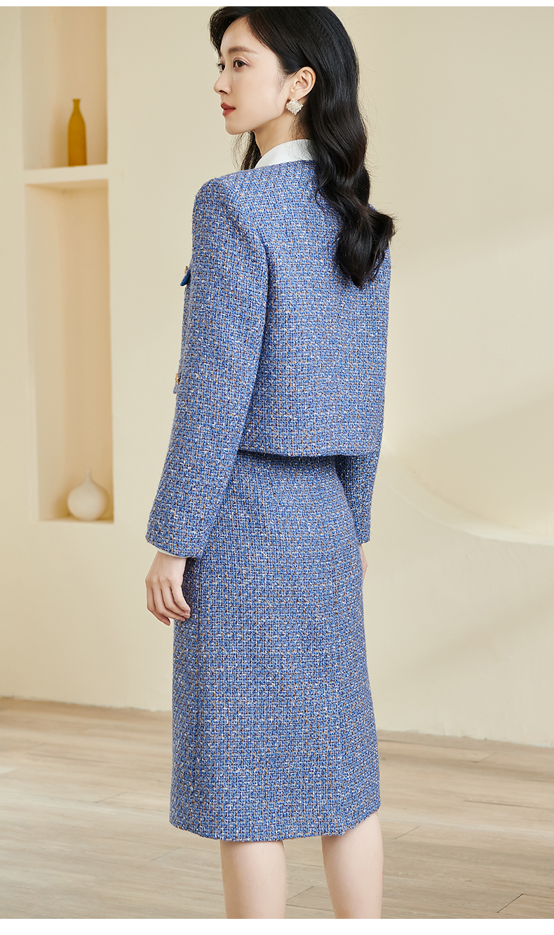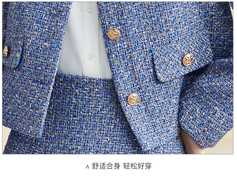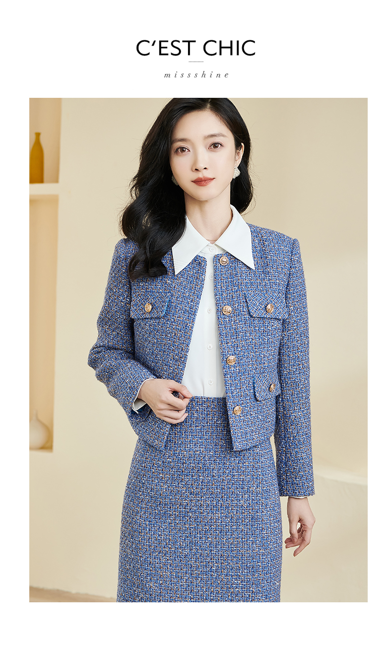 米思阳2026春季新款气质小香风时尚套装拼色纽扣一步裙两件套2989
