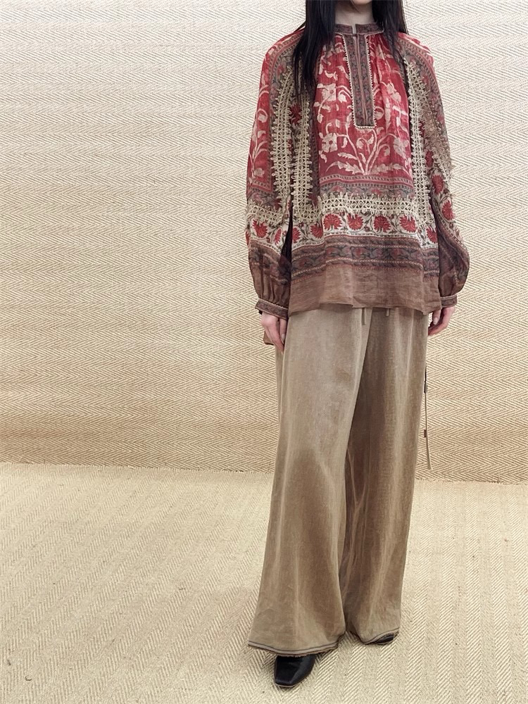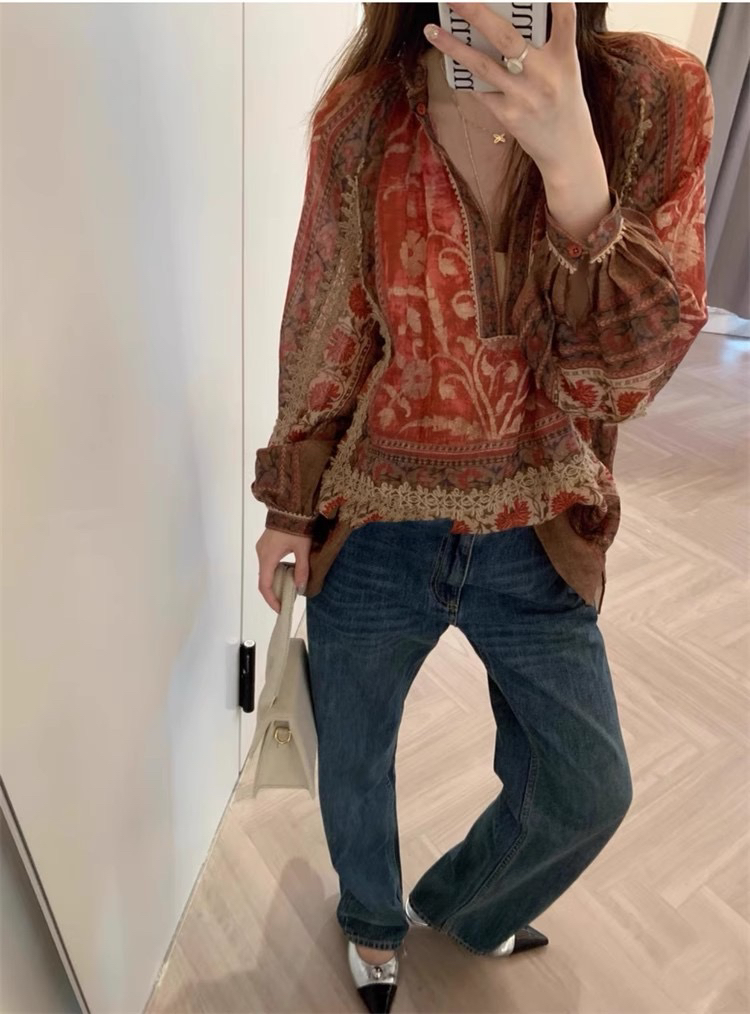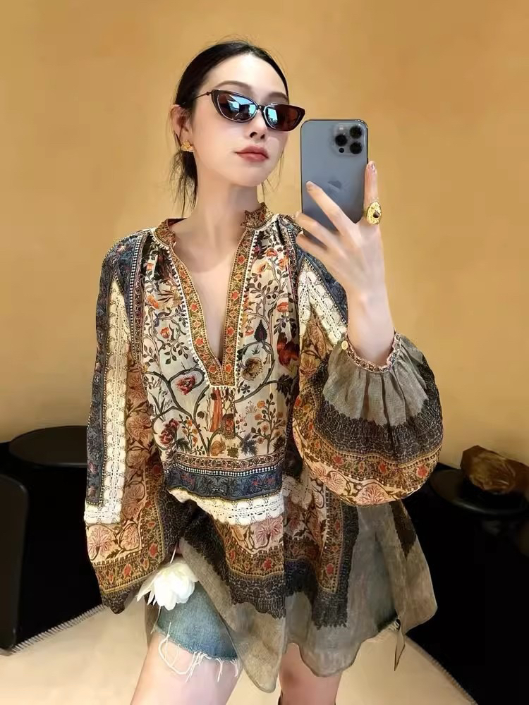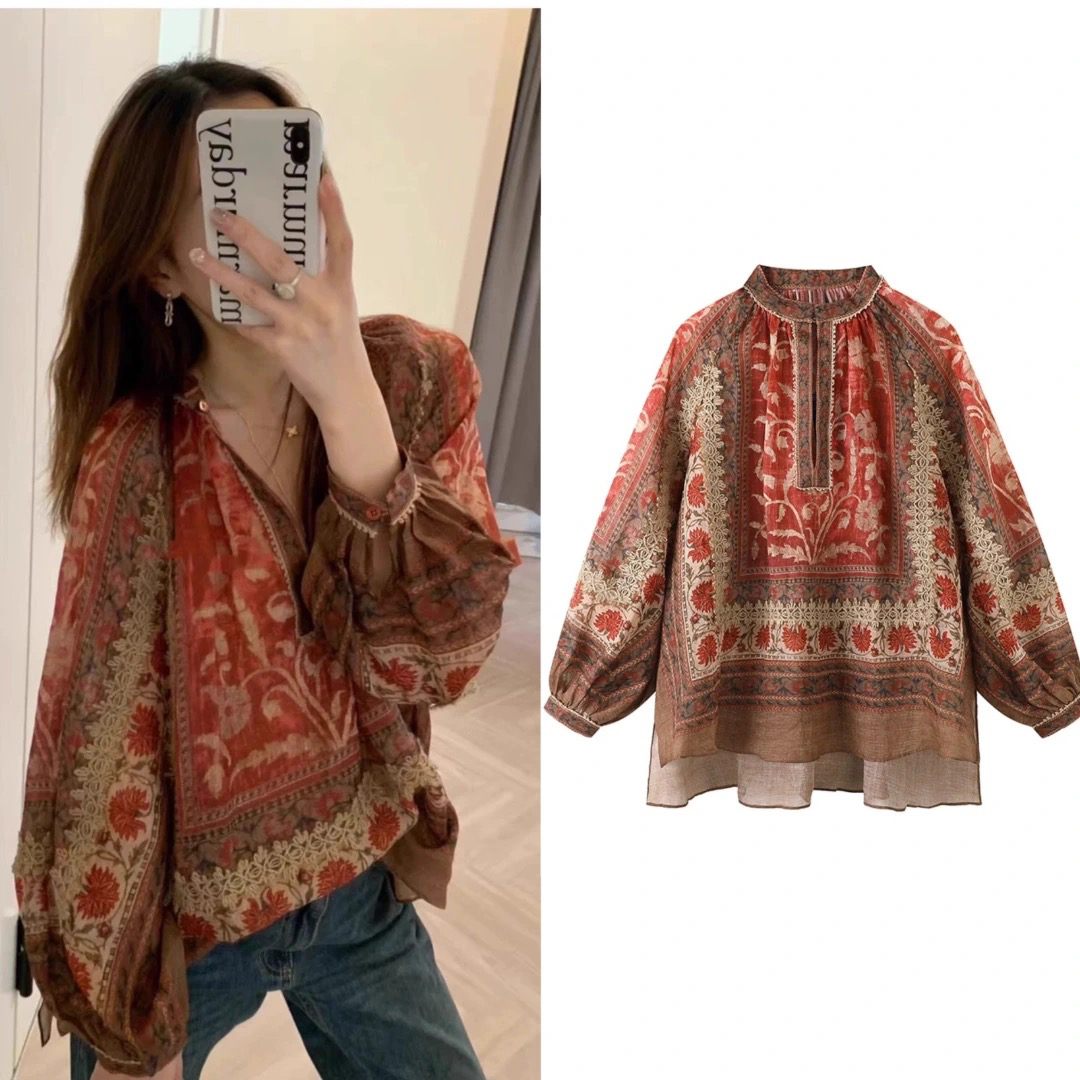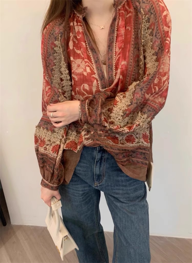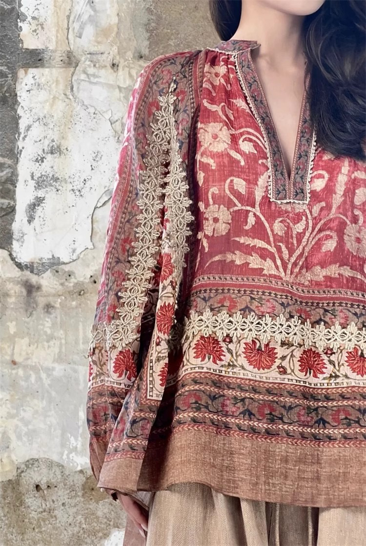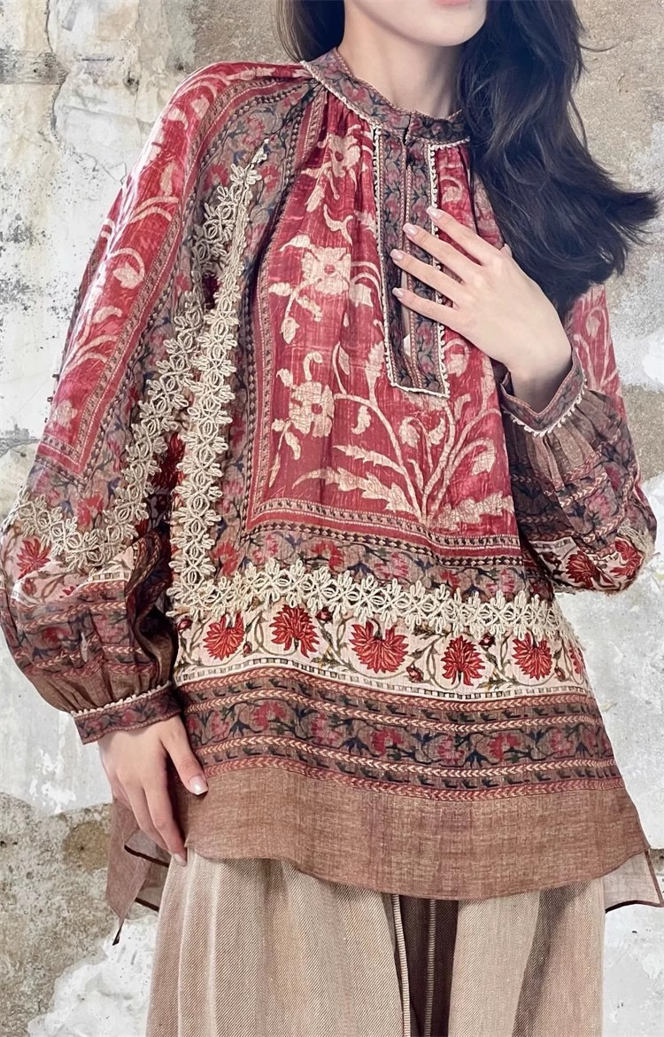 重工!法国苎麻!!民族风定拉印花蕾丝拼接轻薄长袖宽松衬衫!