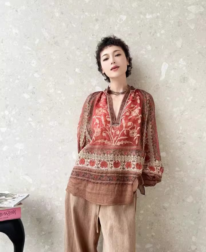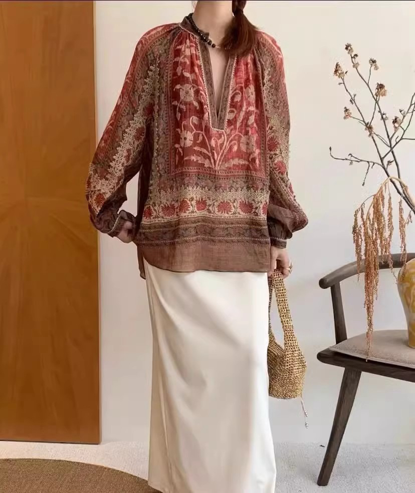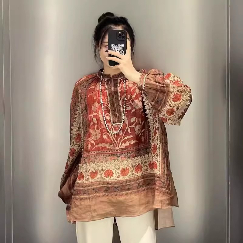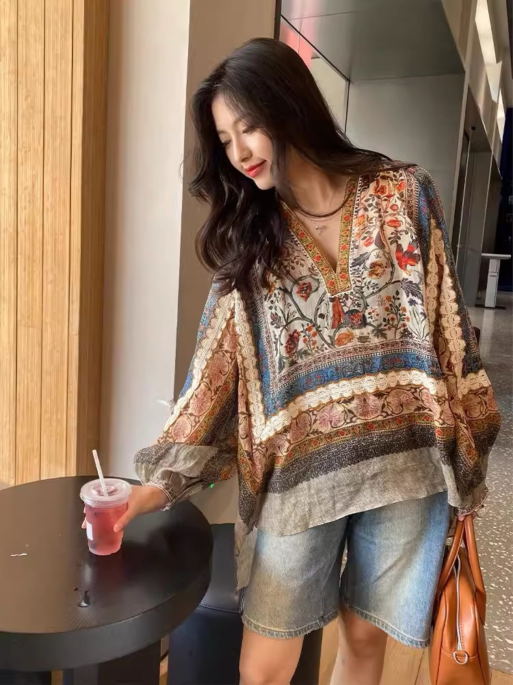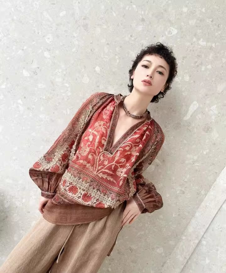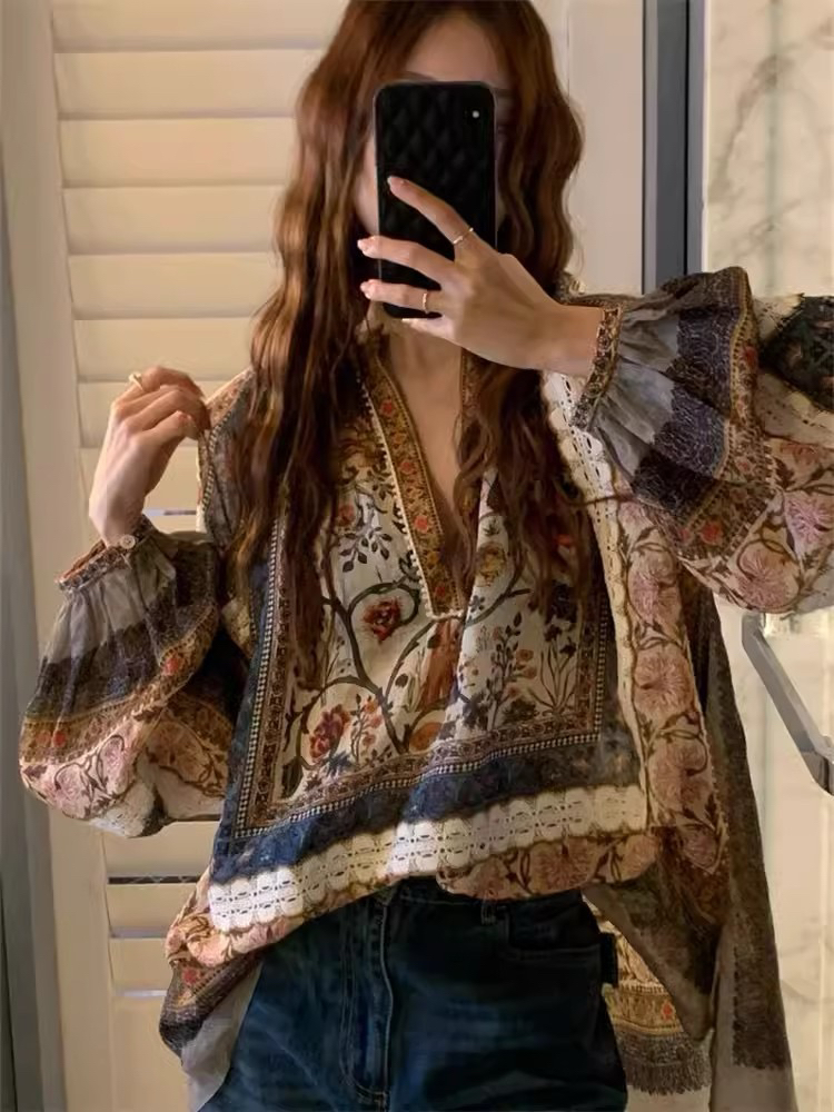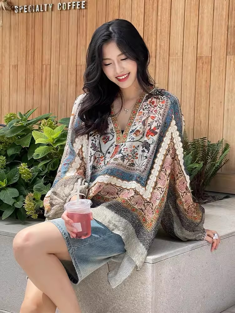 重工!法国苎麻!!民族风定拉印花蕾丝拼接轻薄长袖宽松衬衫!
