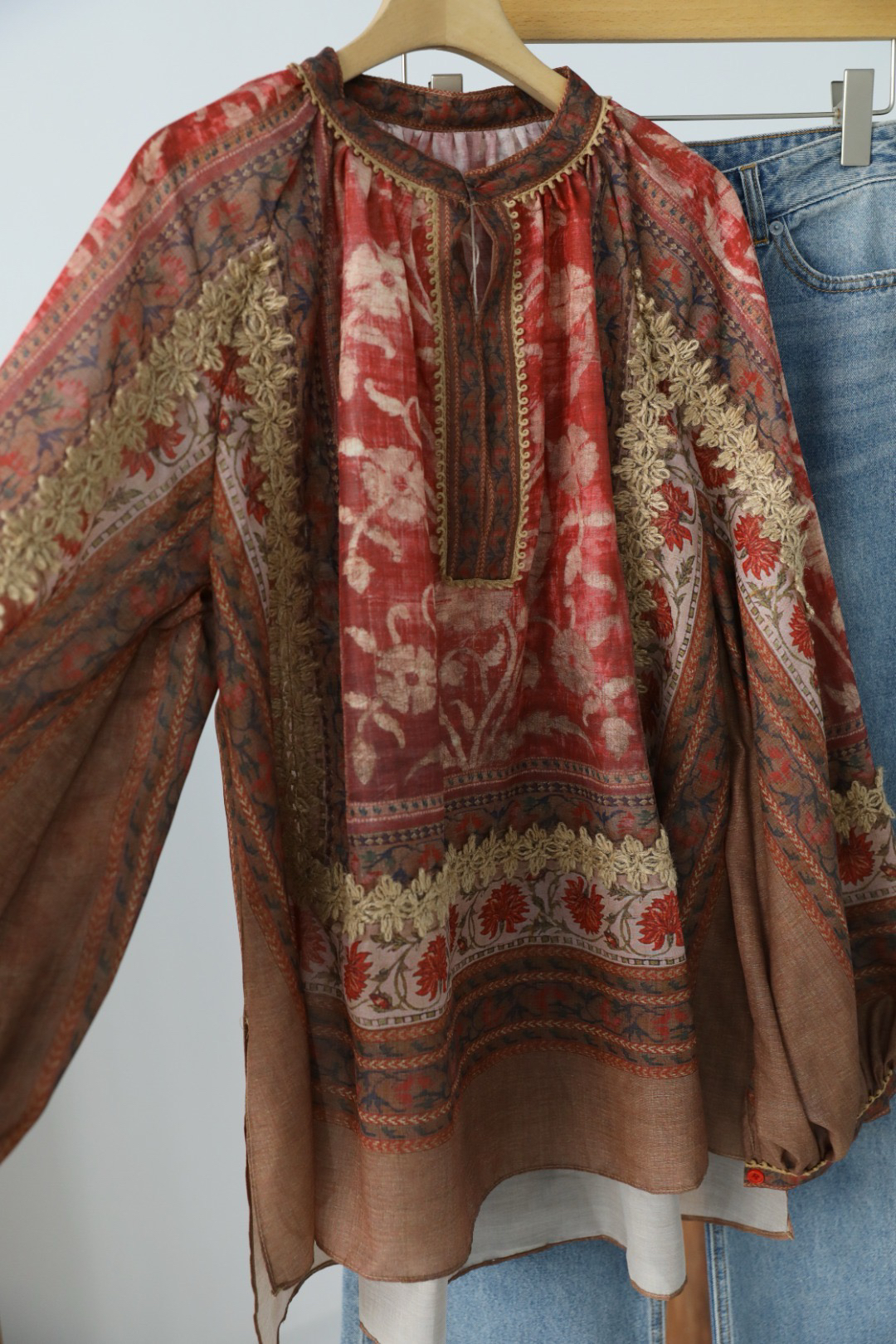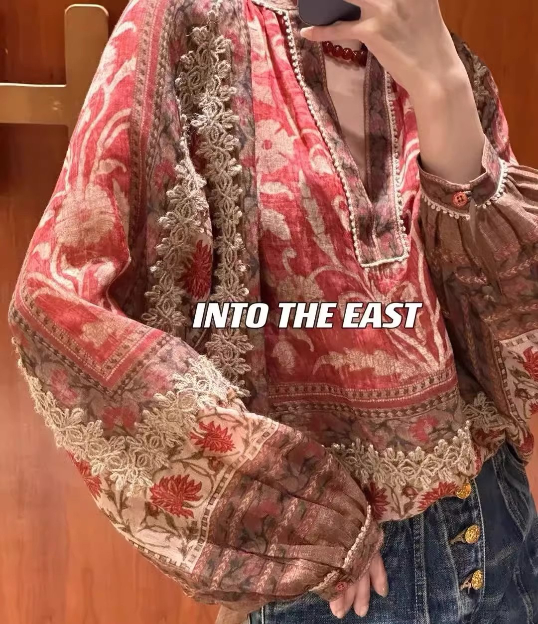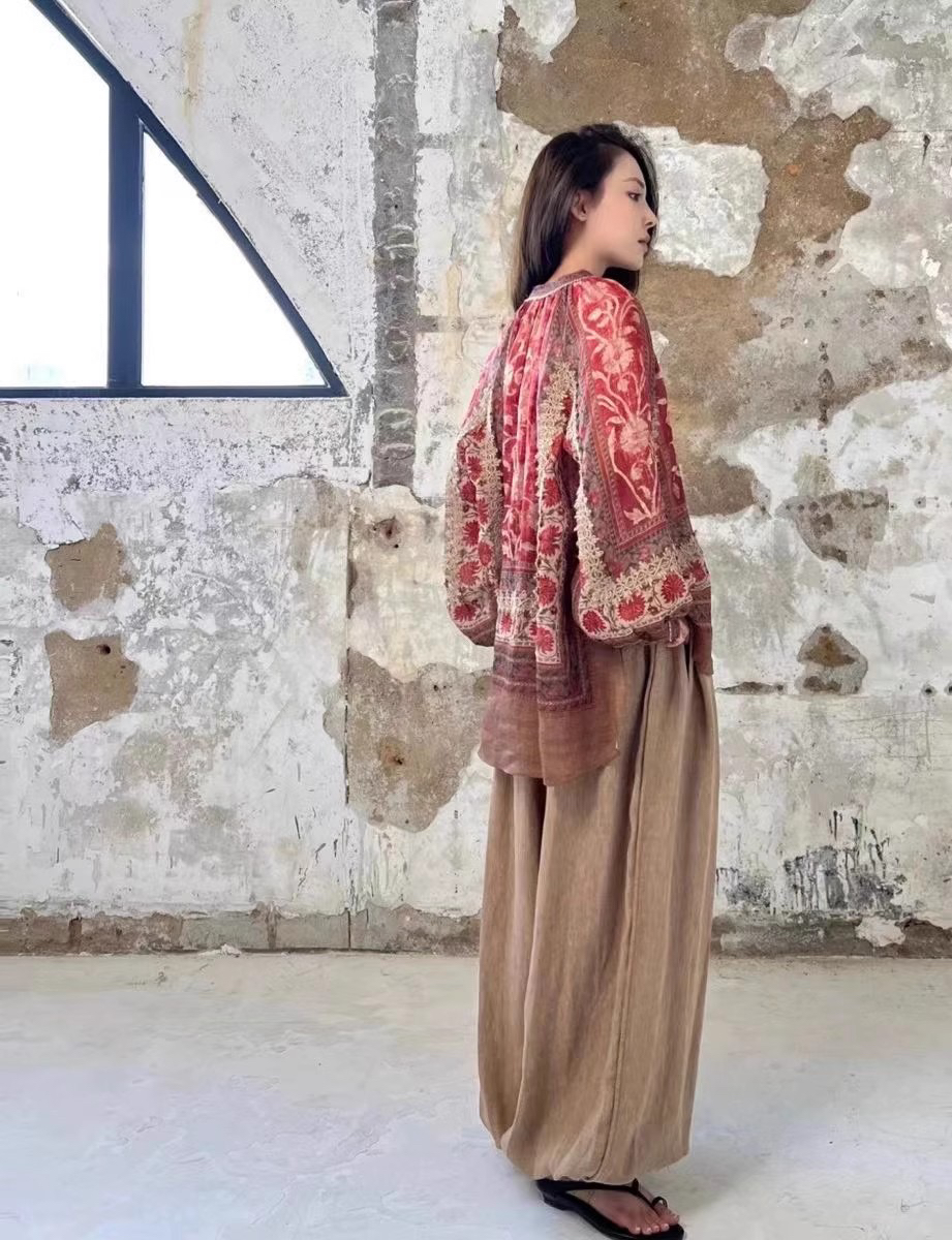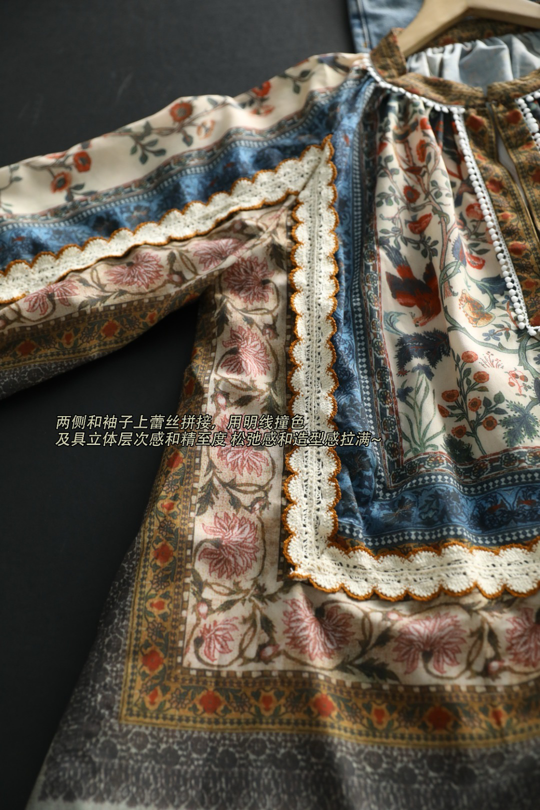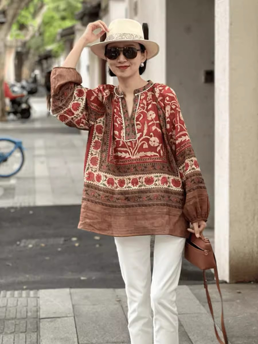 重工!法国苎麻!!民族风定拉印花蕾丝拼接轻薄长袖宽松衬衫!