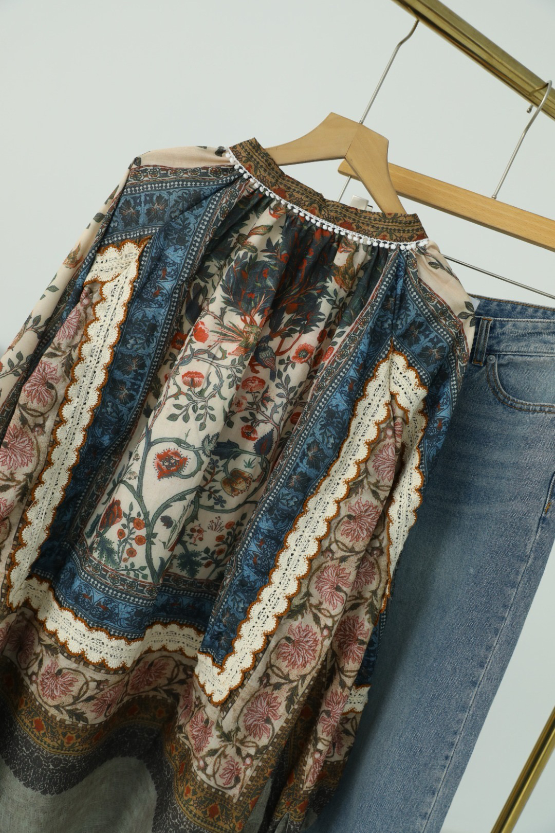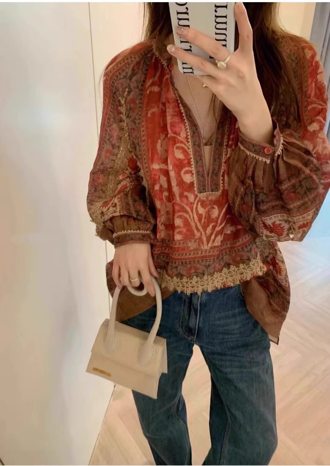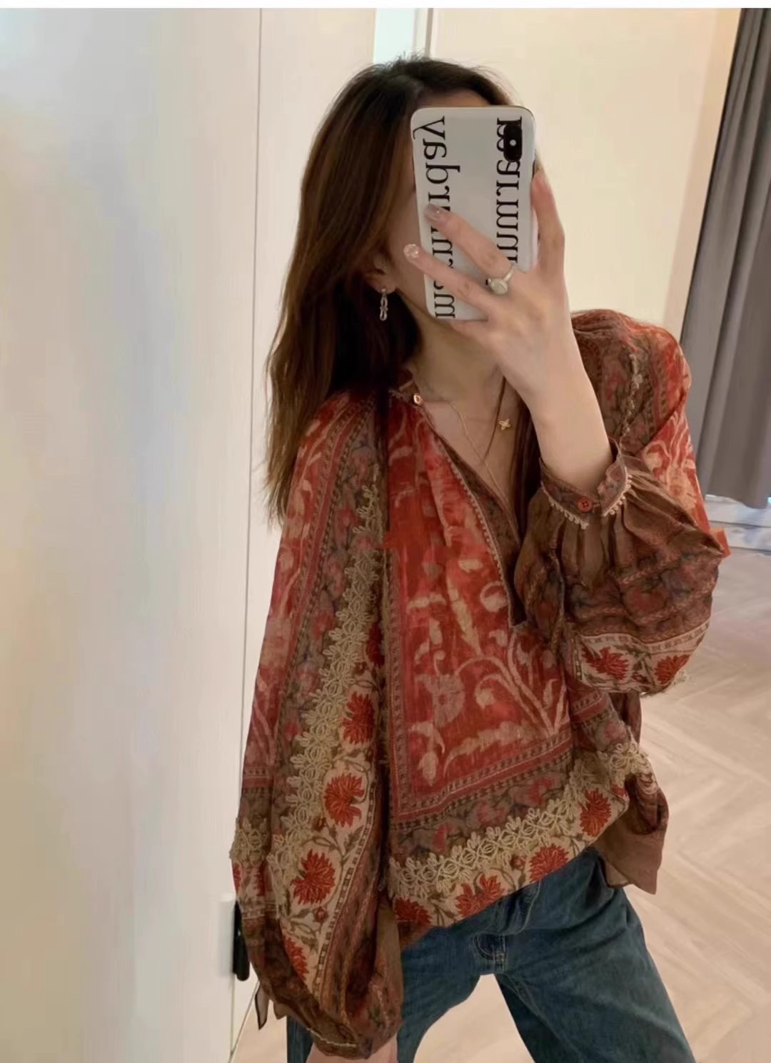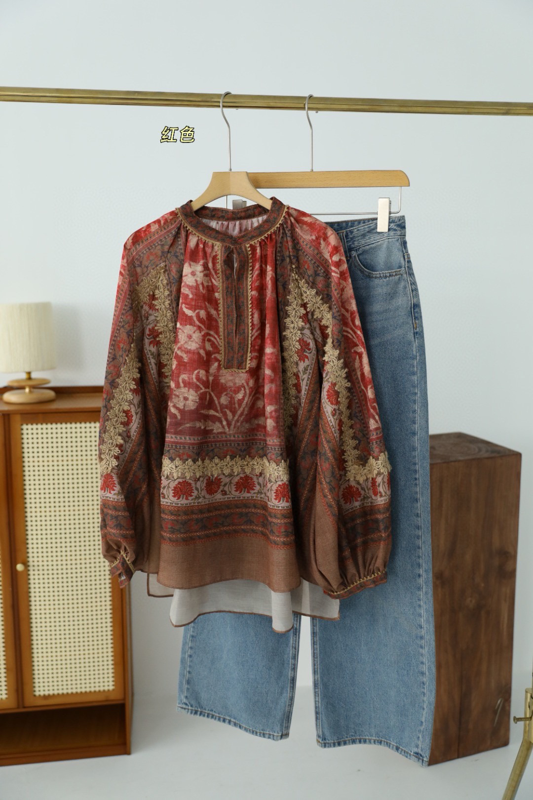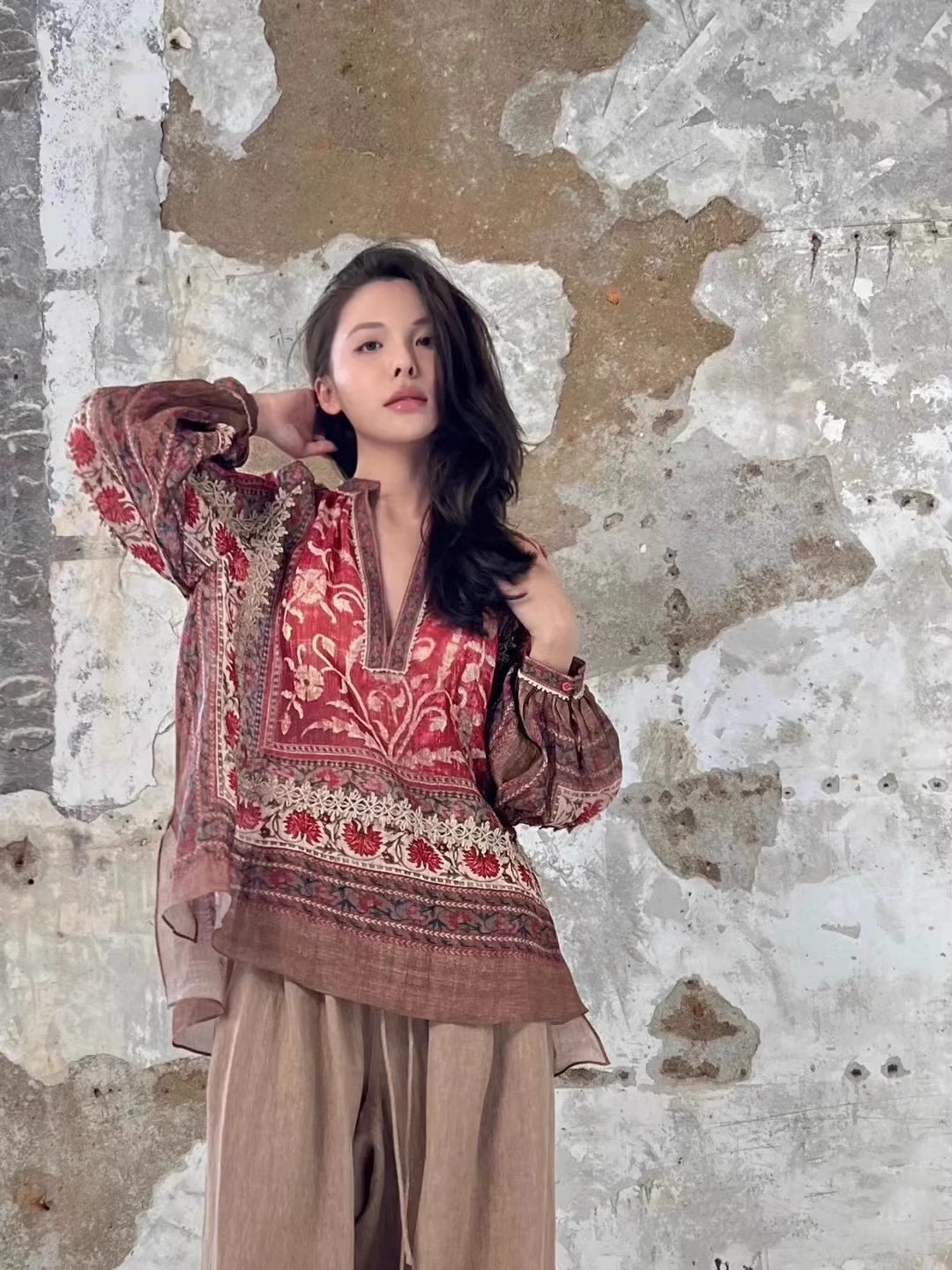 重工!法国苎麻!!民族风定拉印花蕾丝拼接轻薄长袖宽松衬衫!