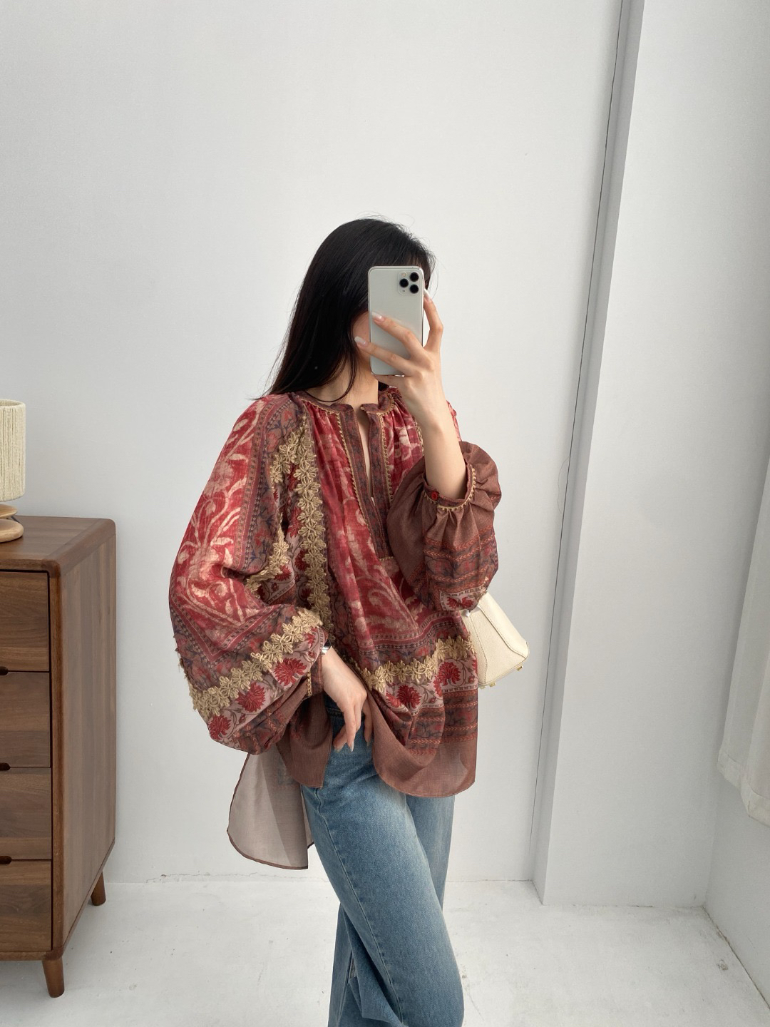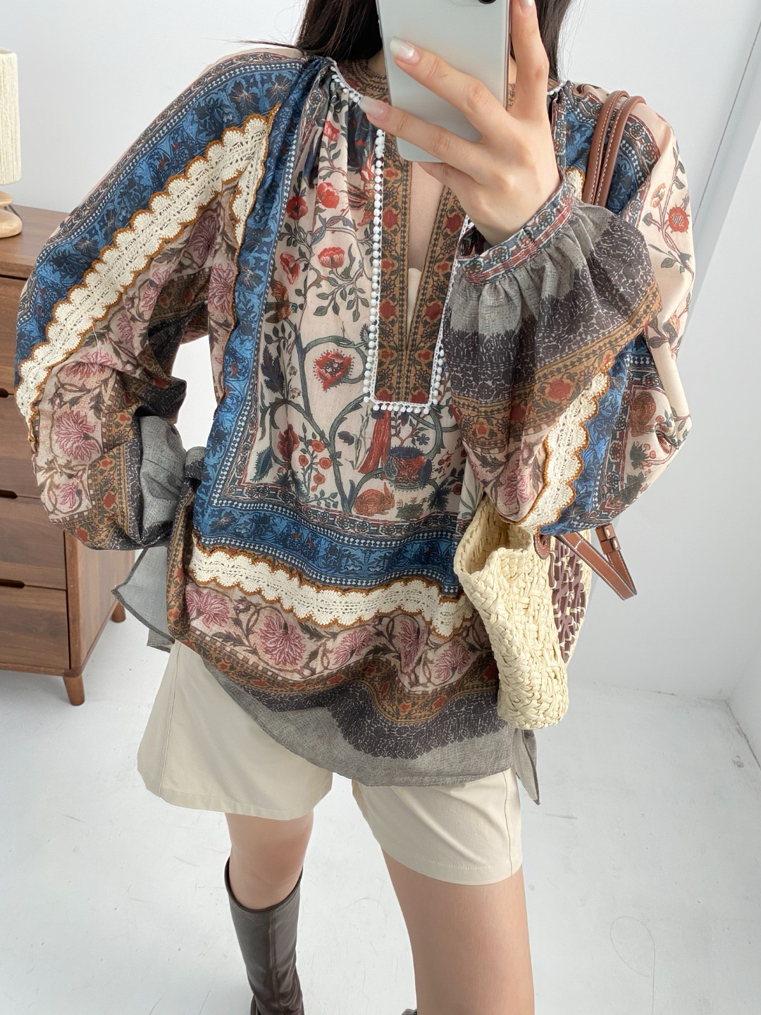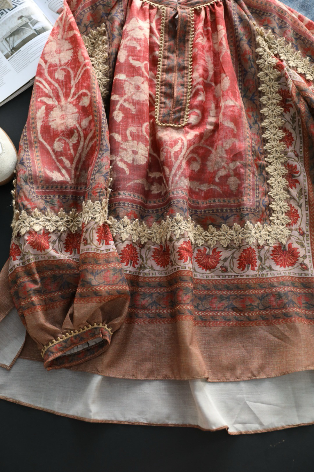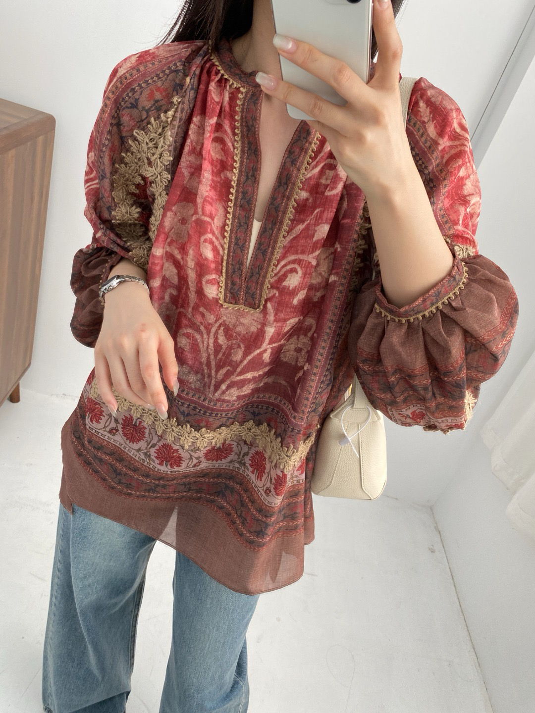 重工!法国苎麻!!民族风定拉印花蕾丝拼接轻薄长袖宽松衬衫!