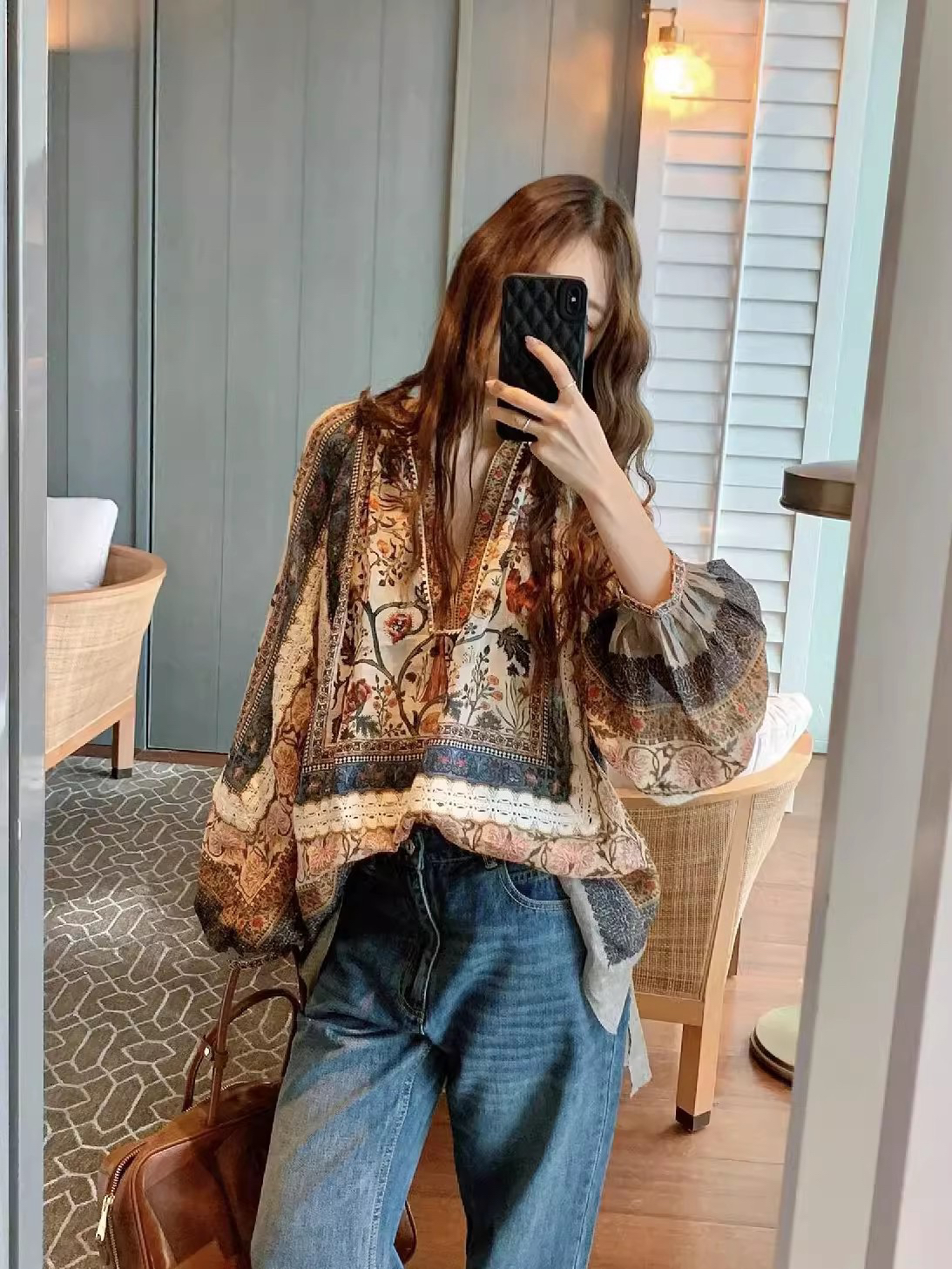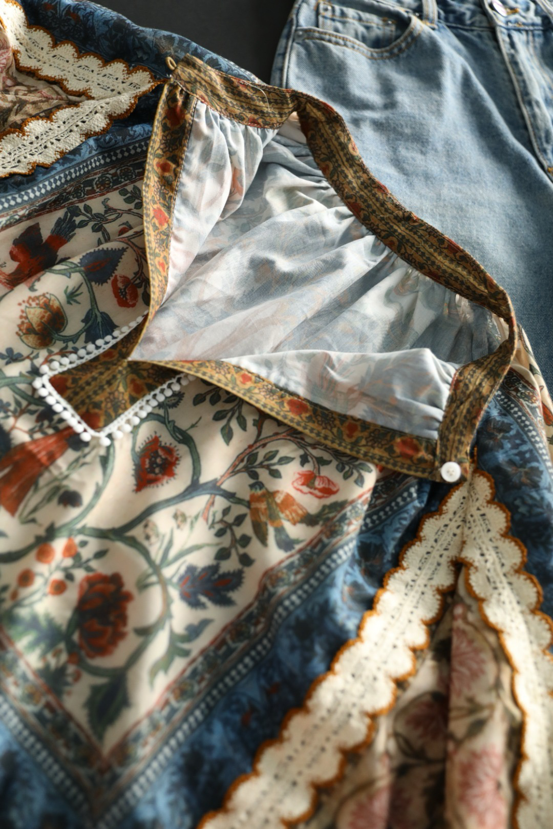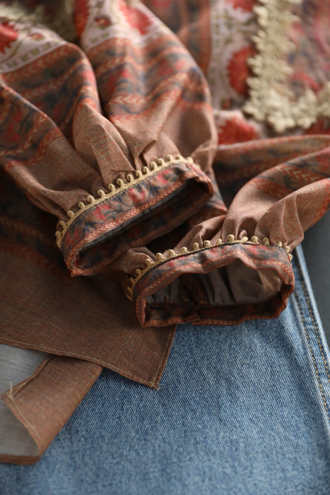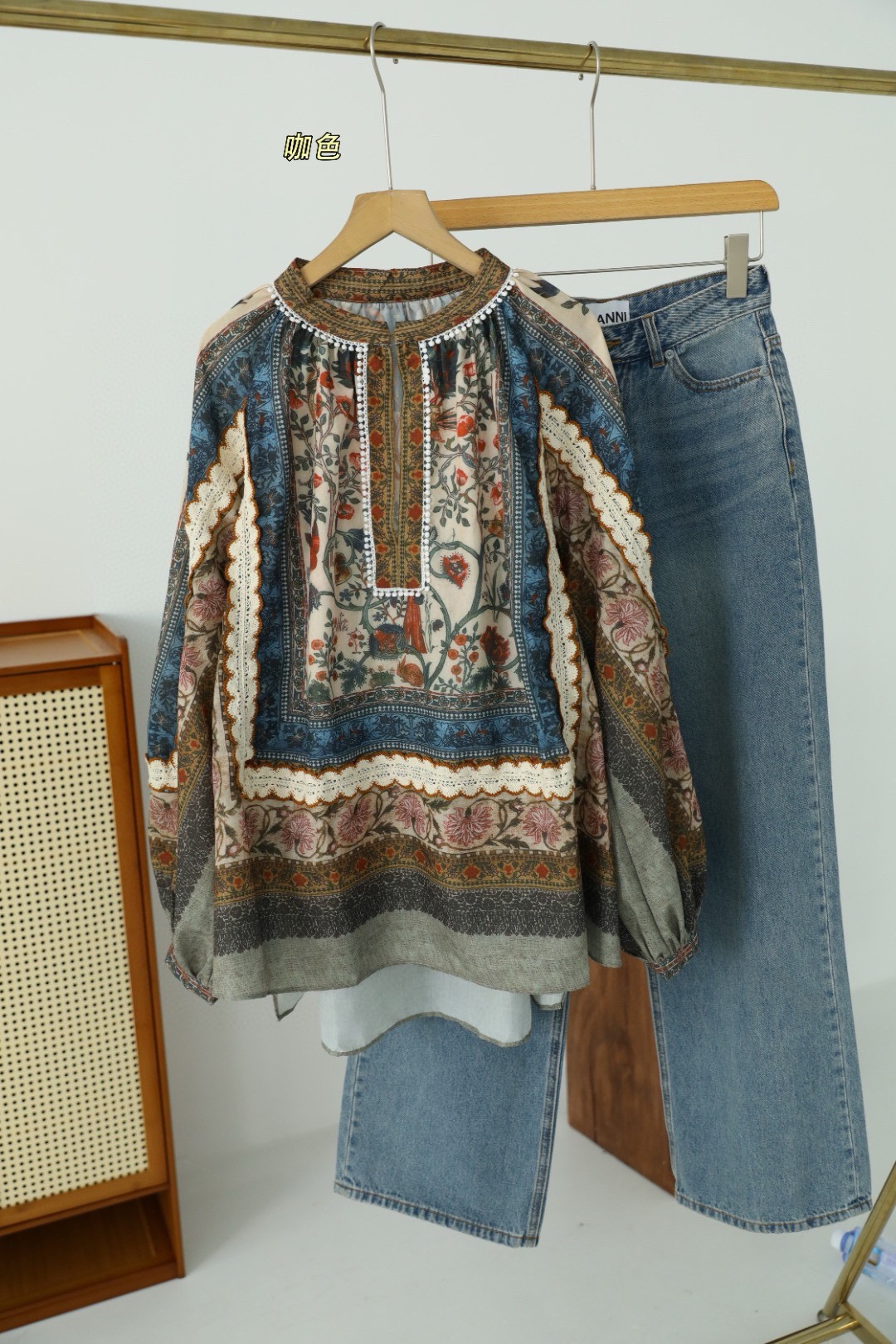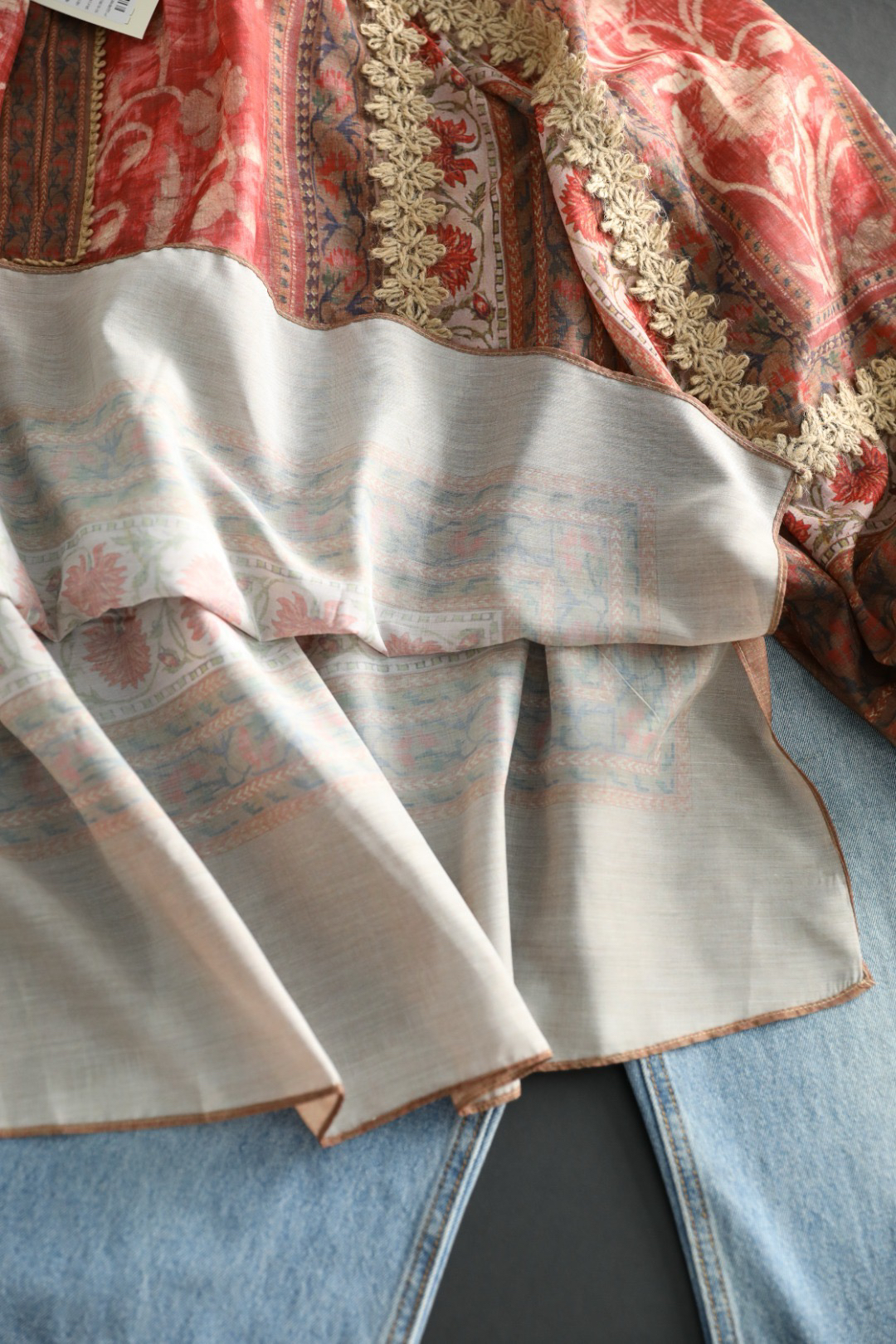 重工!法国苎麻!!民族风定拉印花蕾丝拼接轻薄长袖宽松衬衫!