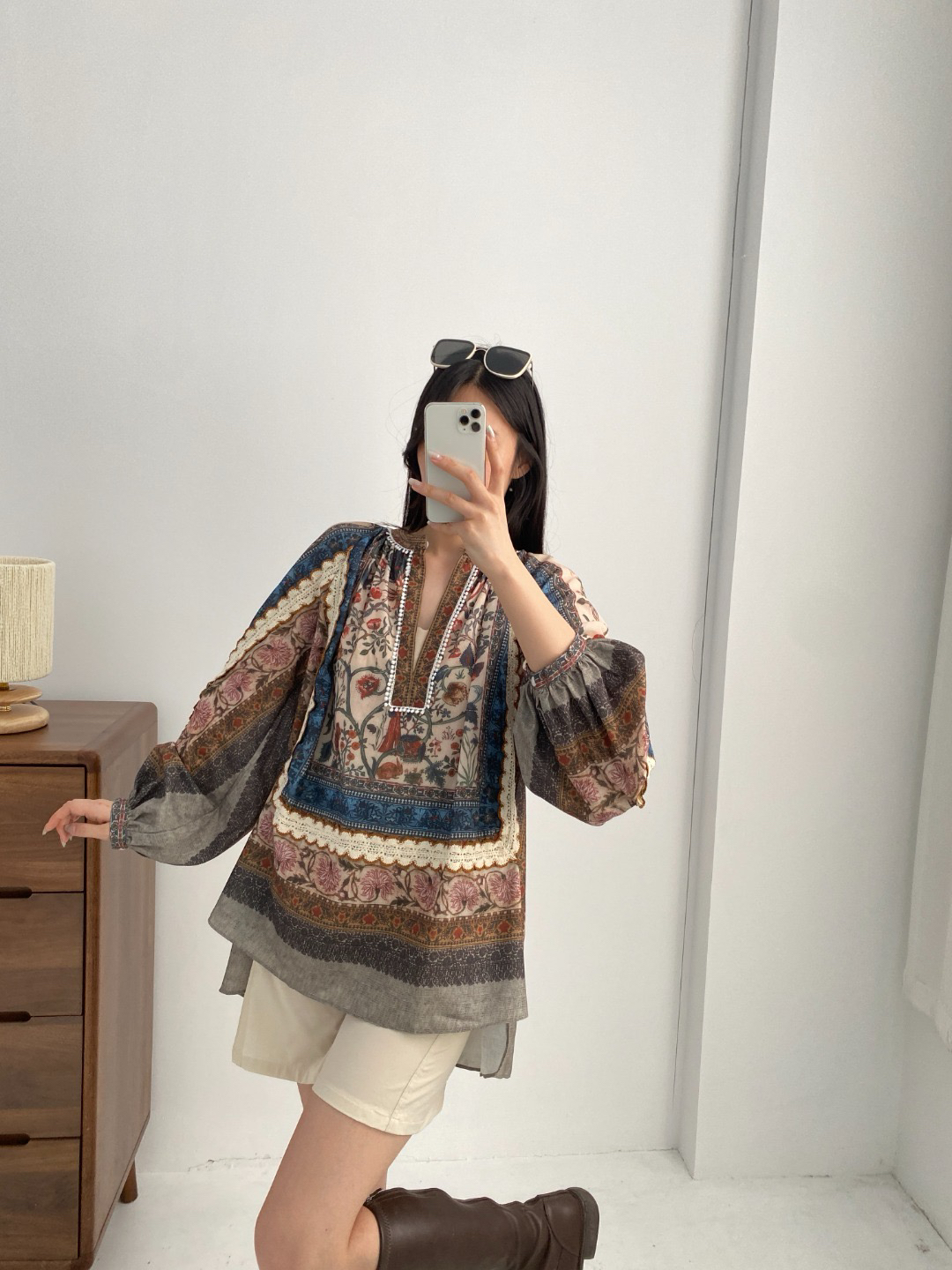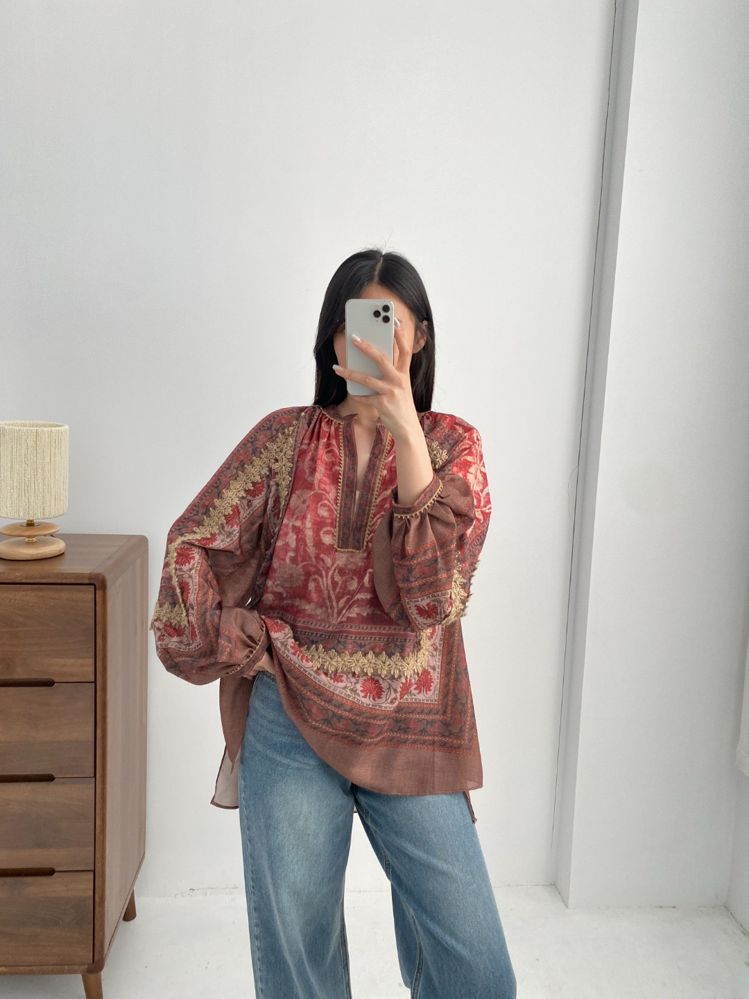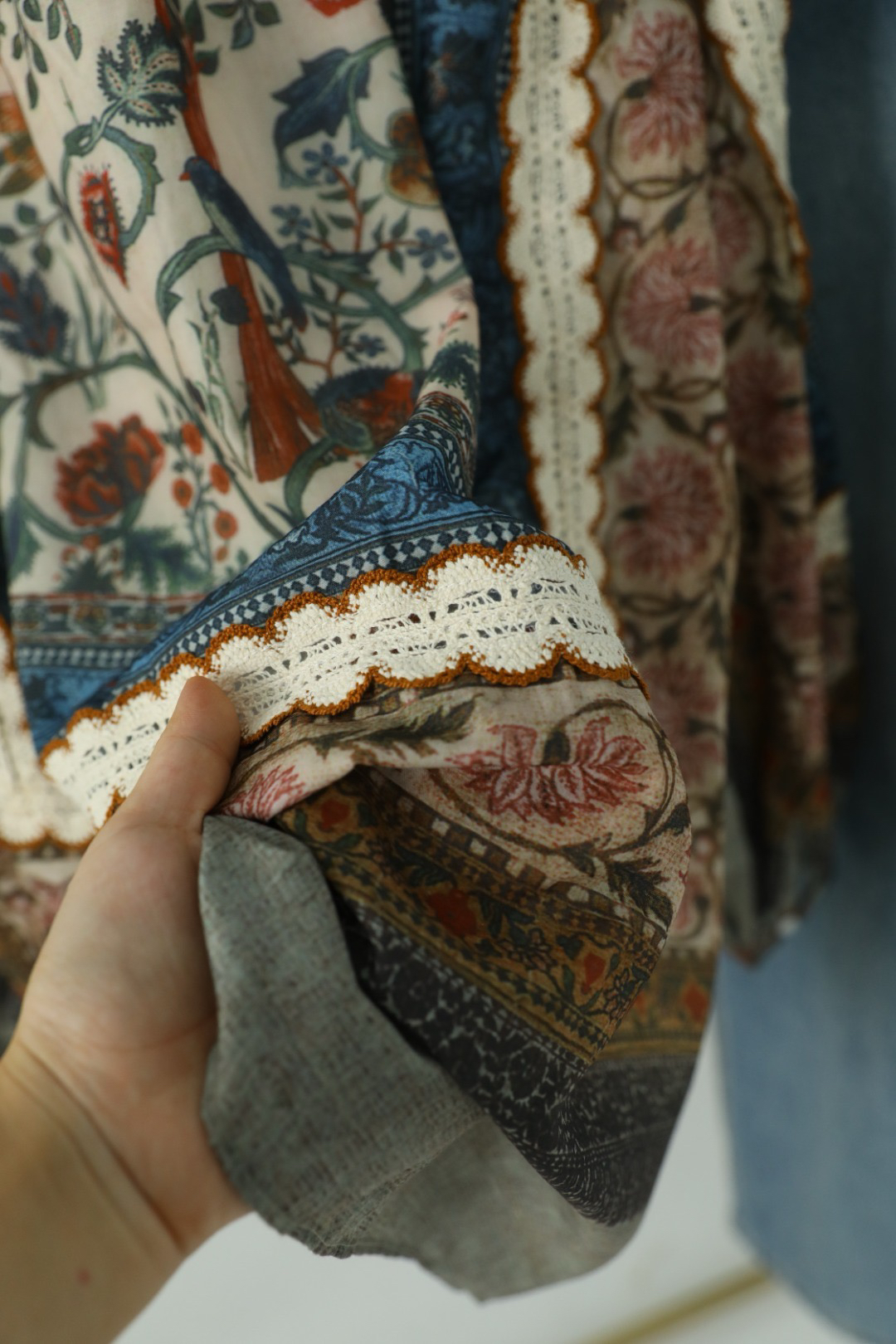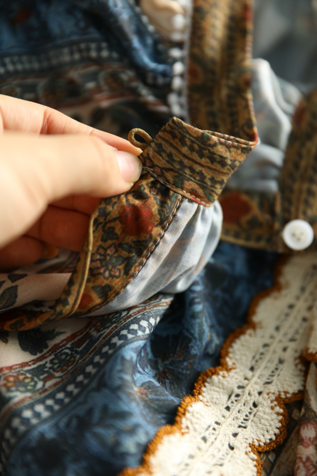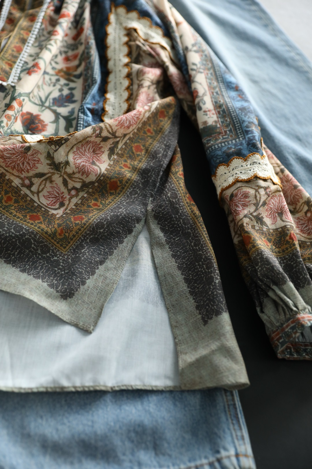 重工!法国苎麻!!民族风定拉印花蕾丝拼接轻薄长袖宽松衬衫!