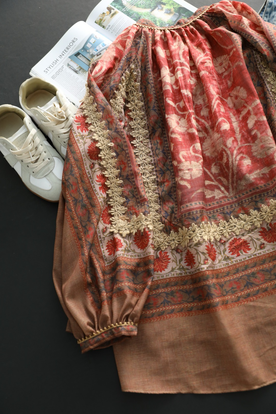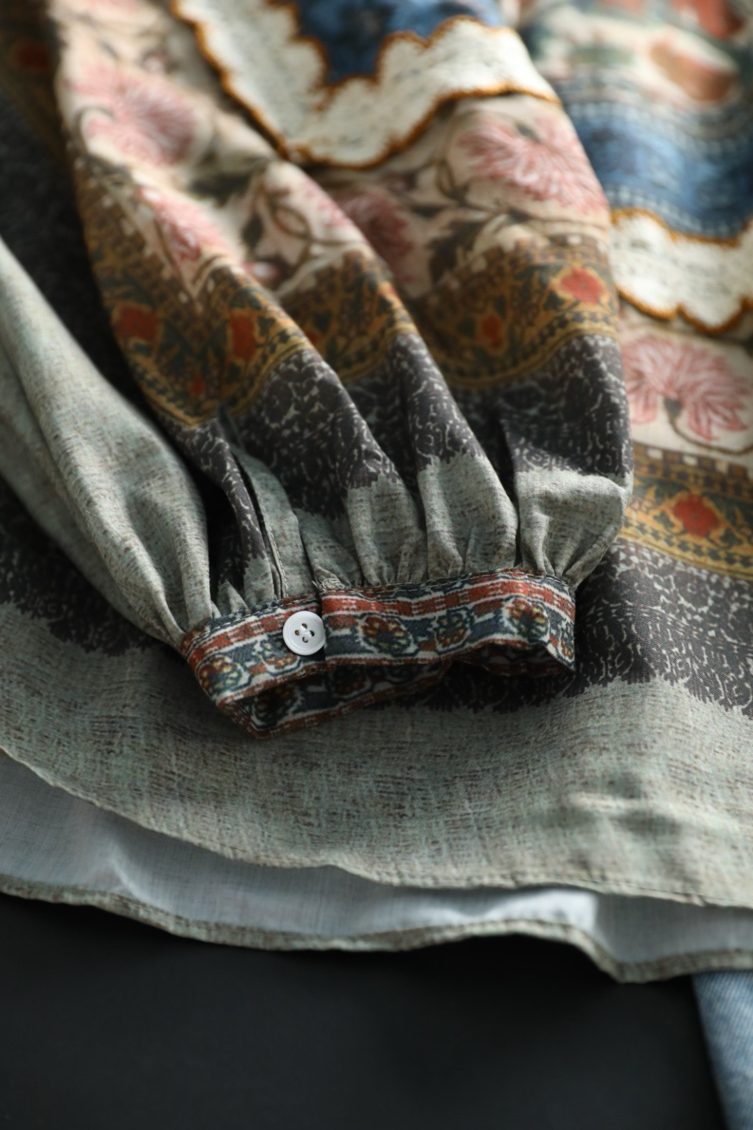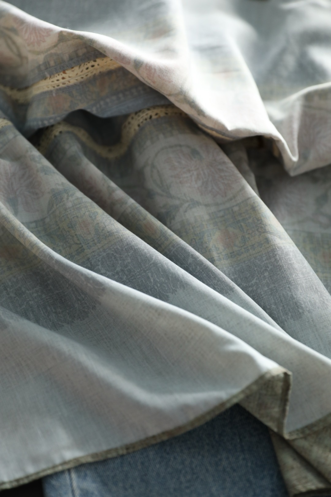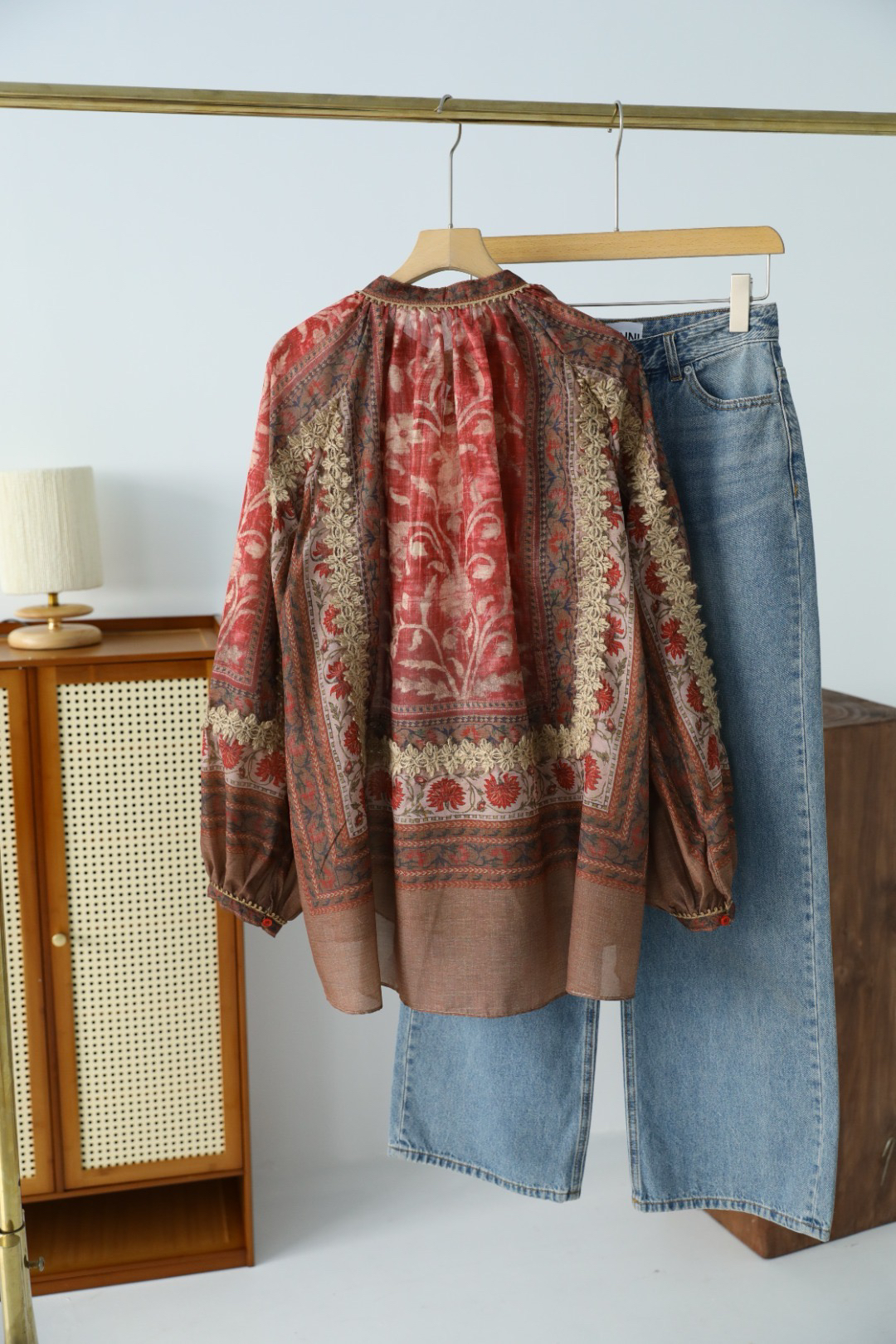 重工!法国苎麻!!民族风定拉印花蕾丝拼接轻薄长袖宽松衬衫!