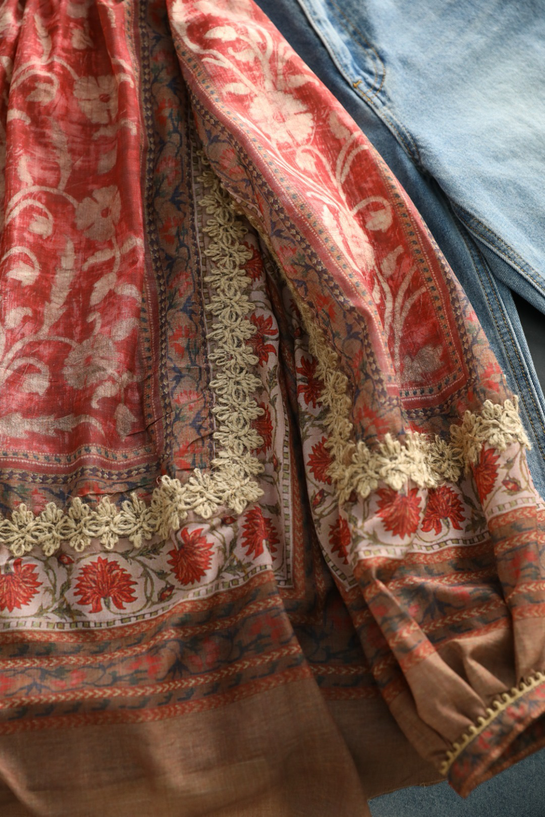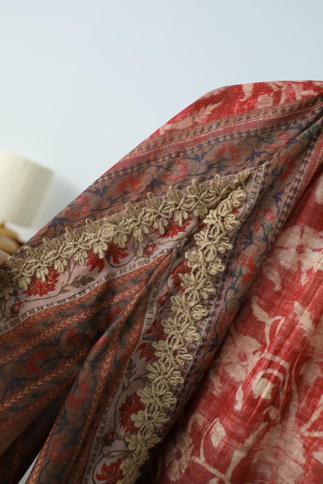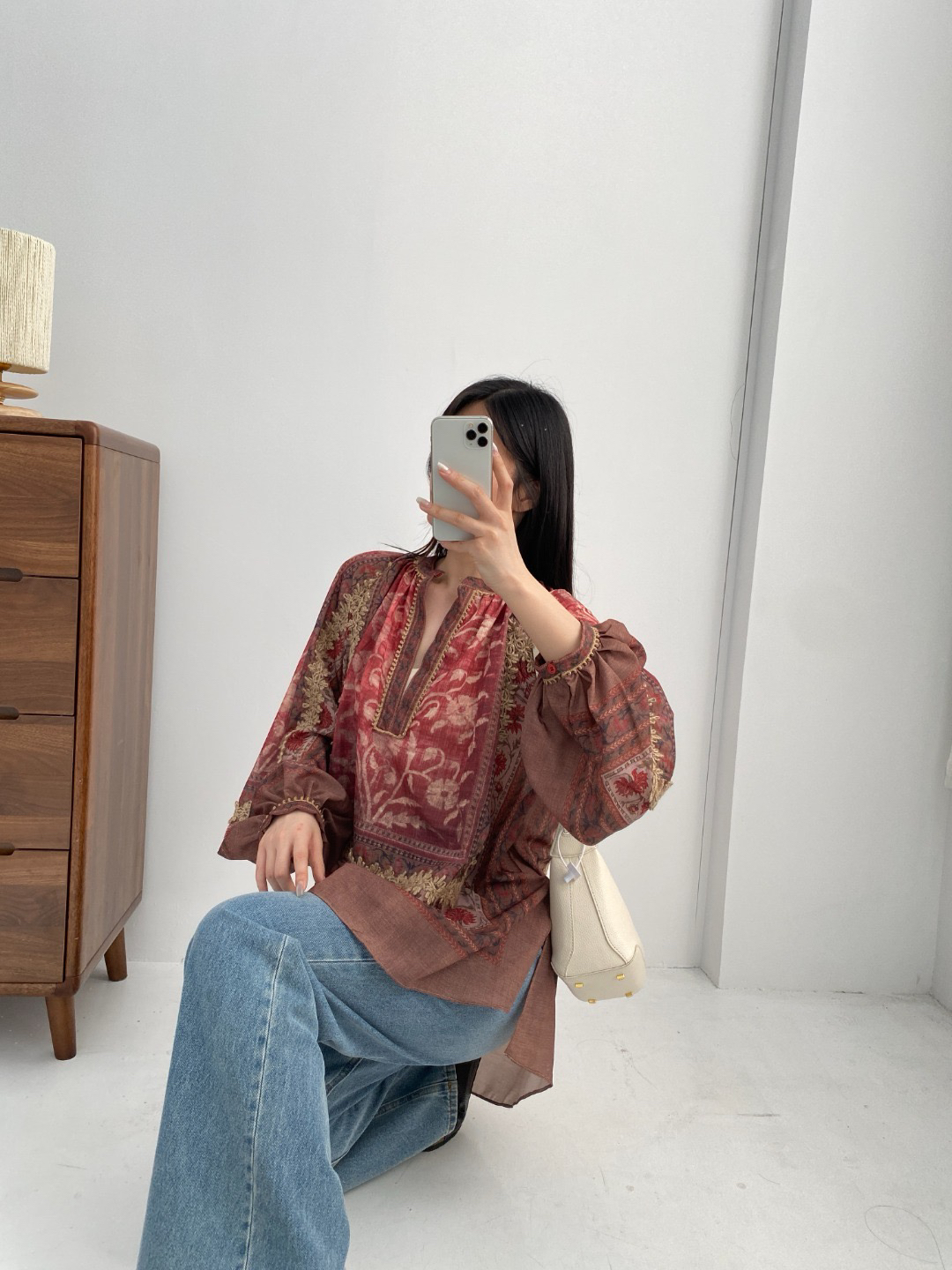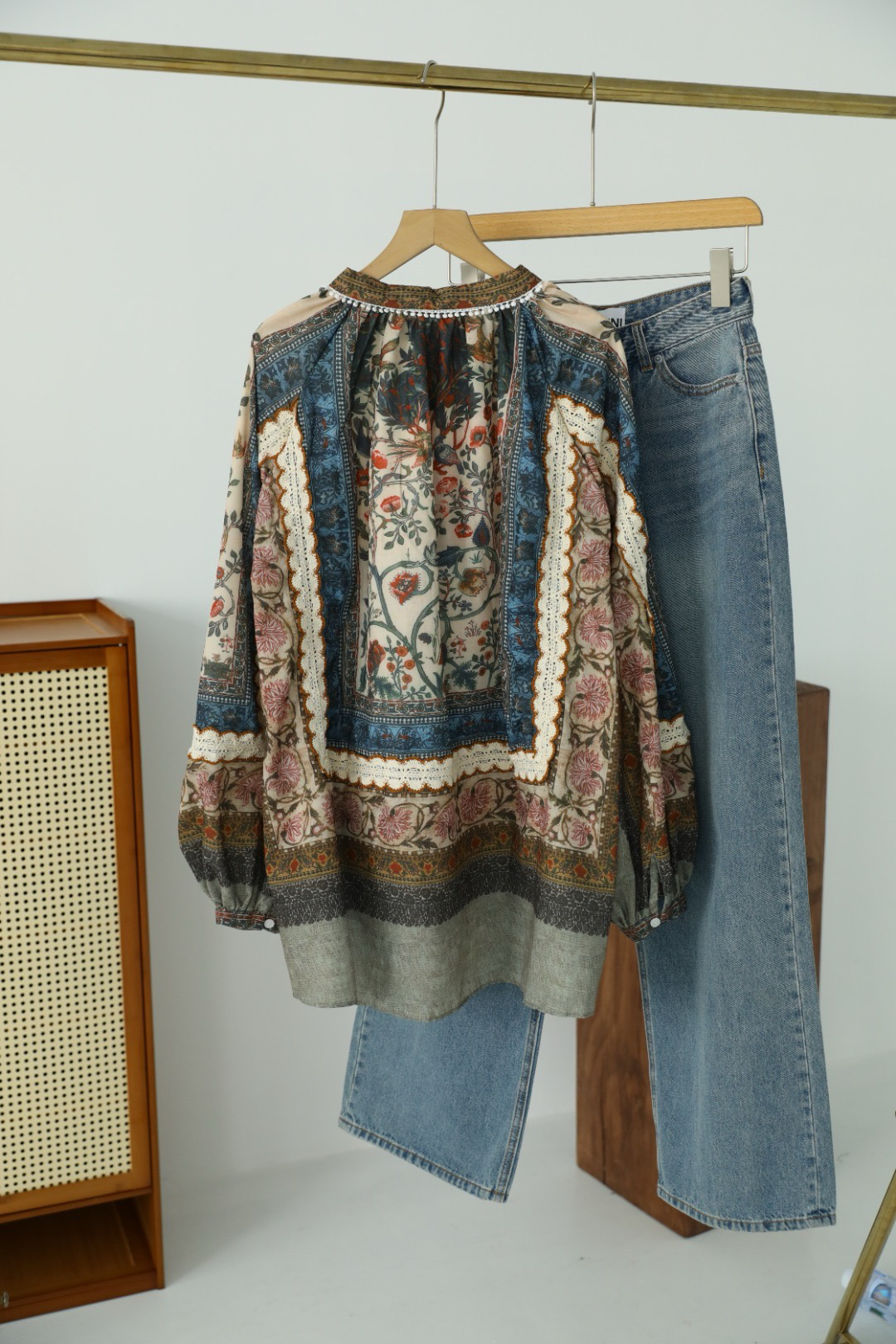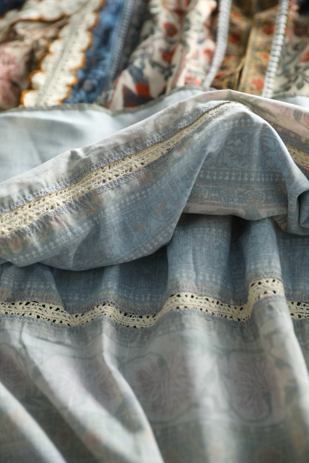 重工!法国苎麻!!民族风定拉印花蕾丝拼接轻薄长袖宽松衬衫!