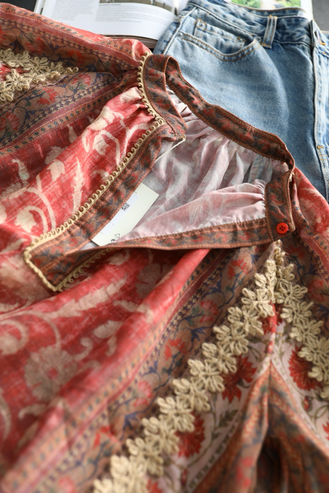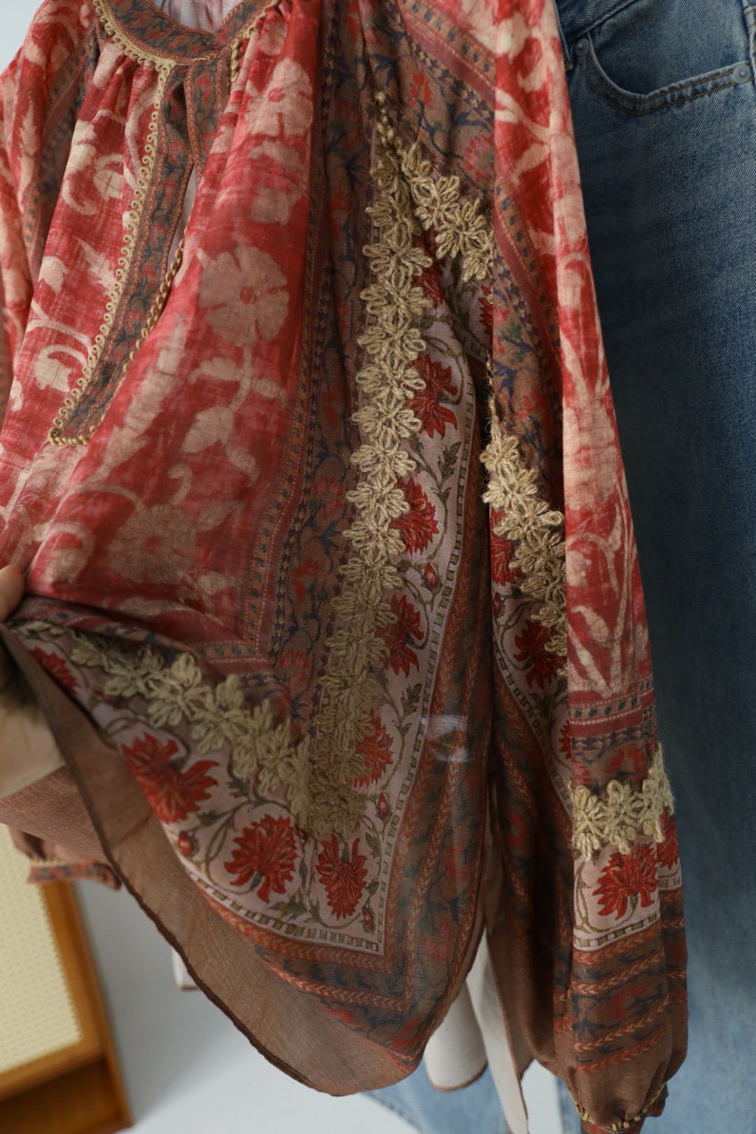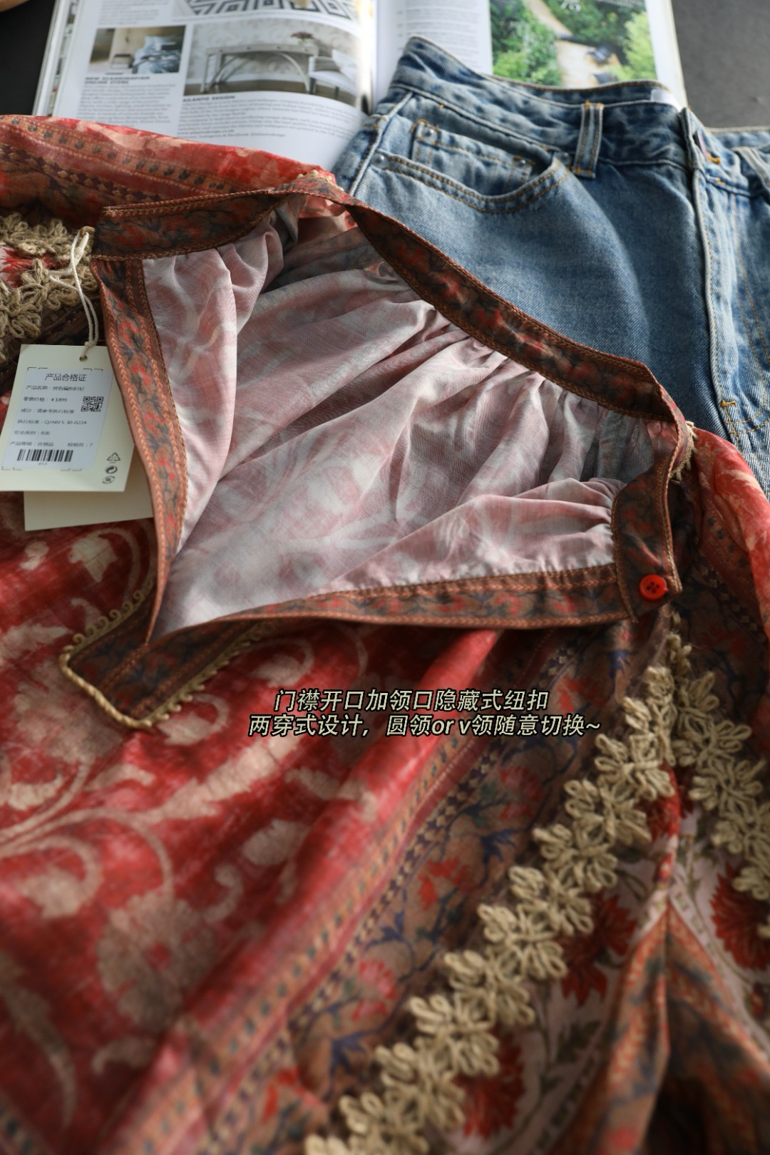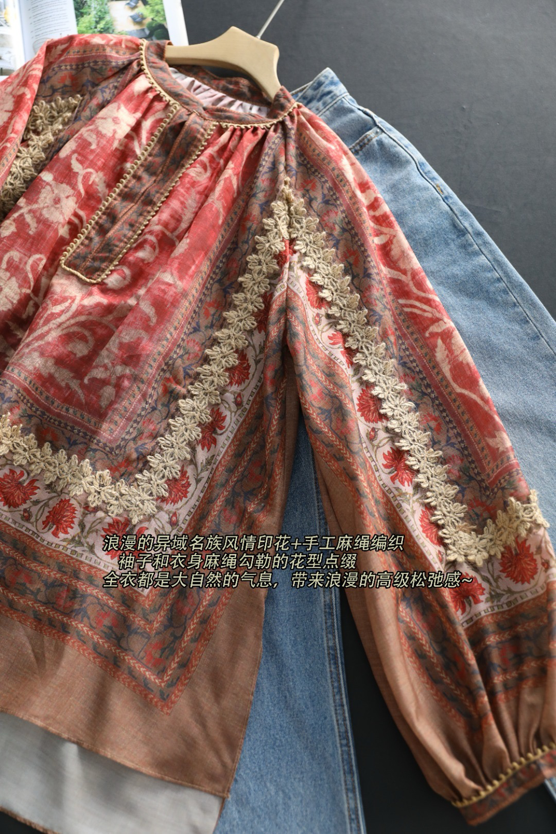 浪漫的异域名族风情印花+手工麻绳编织,袖子和衣身麻绳勾勒的花型点缀,全衣都是大自然的气息,带来浪漫的高级松弛感~