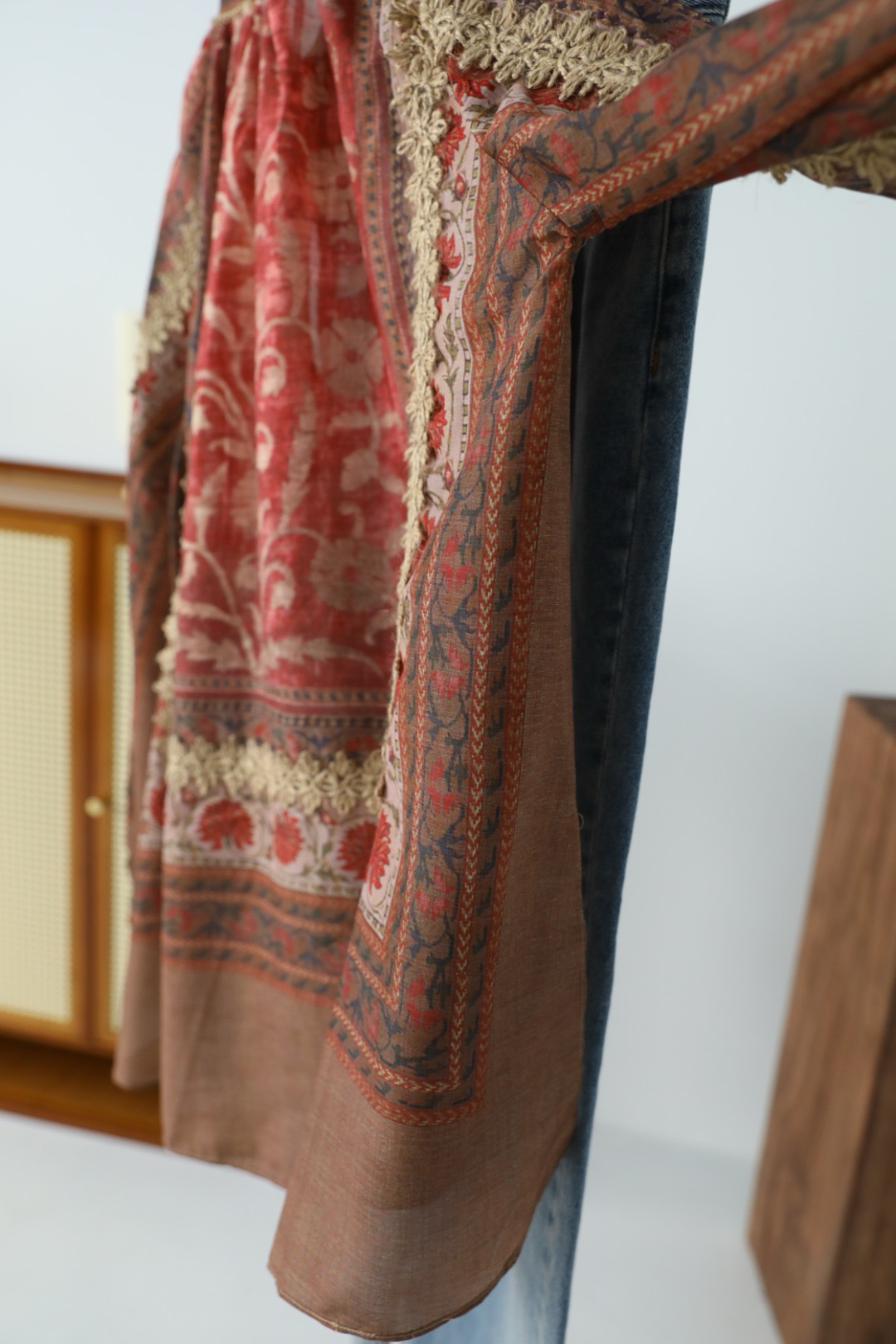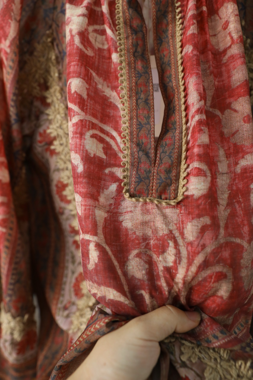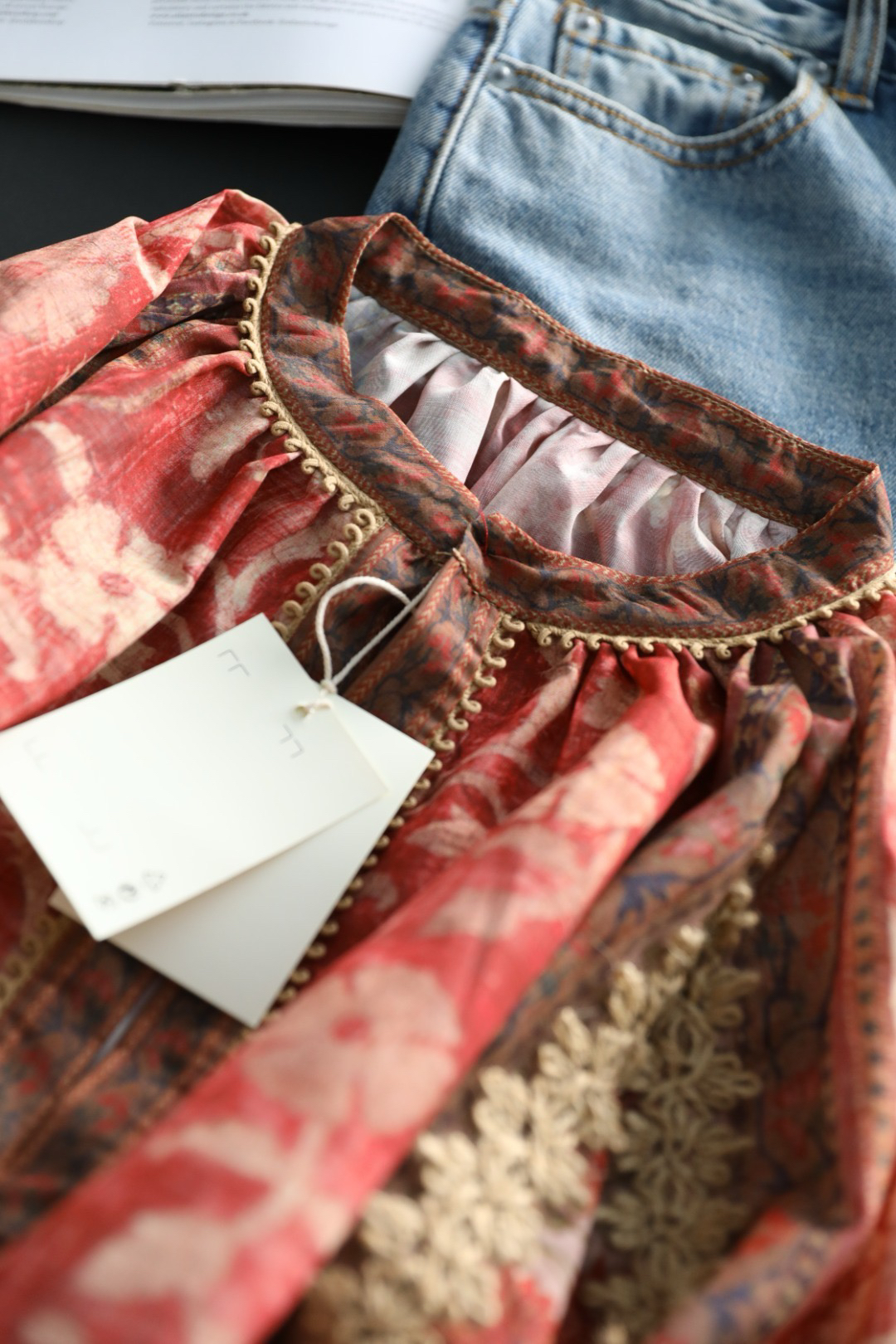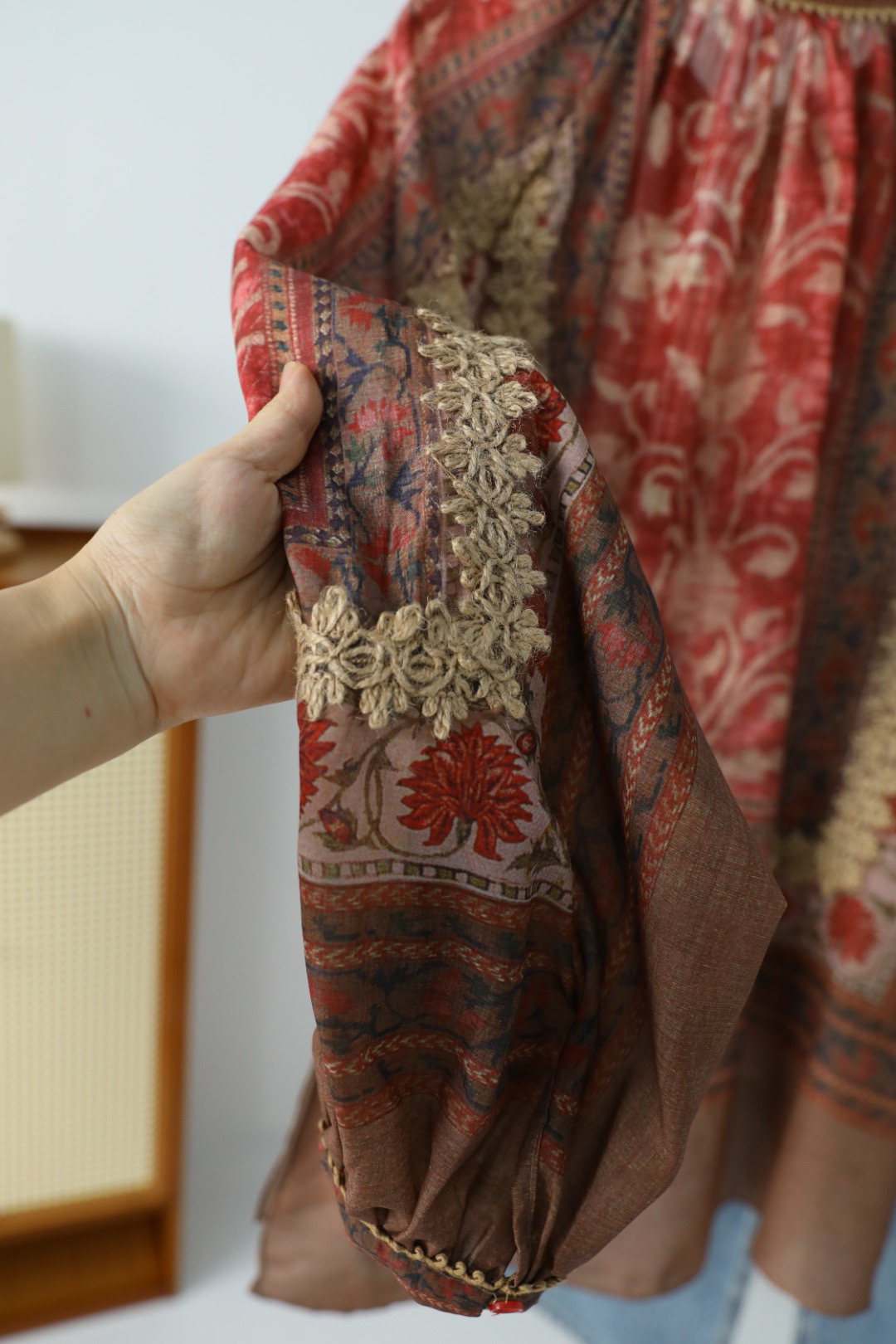 浪漫的异域名族风情印花+手工麻绳编织,袖子和衣身麻绳勾勒的花型点缀,全衣都是大自然的气息,带来浪漫的高级松弛感~