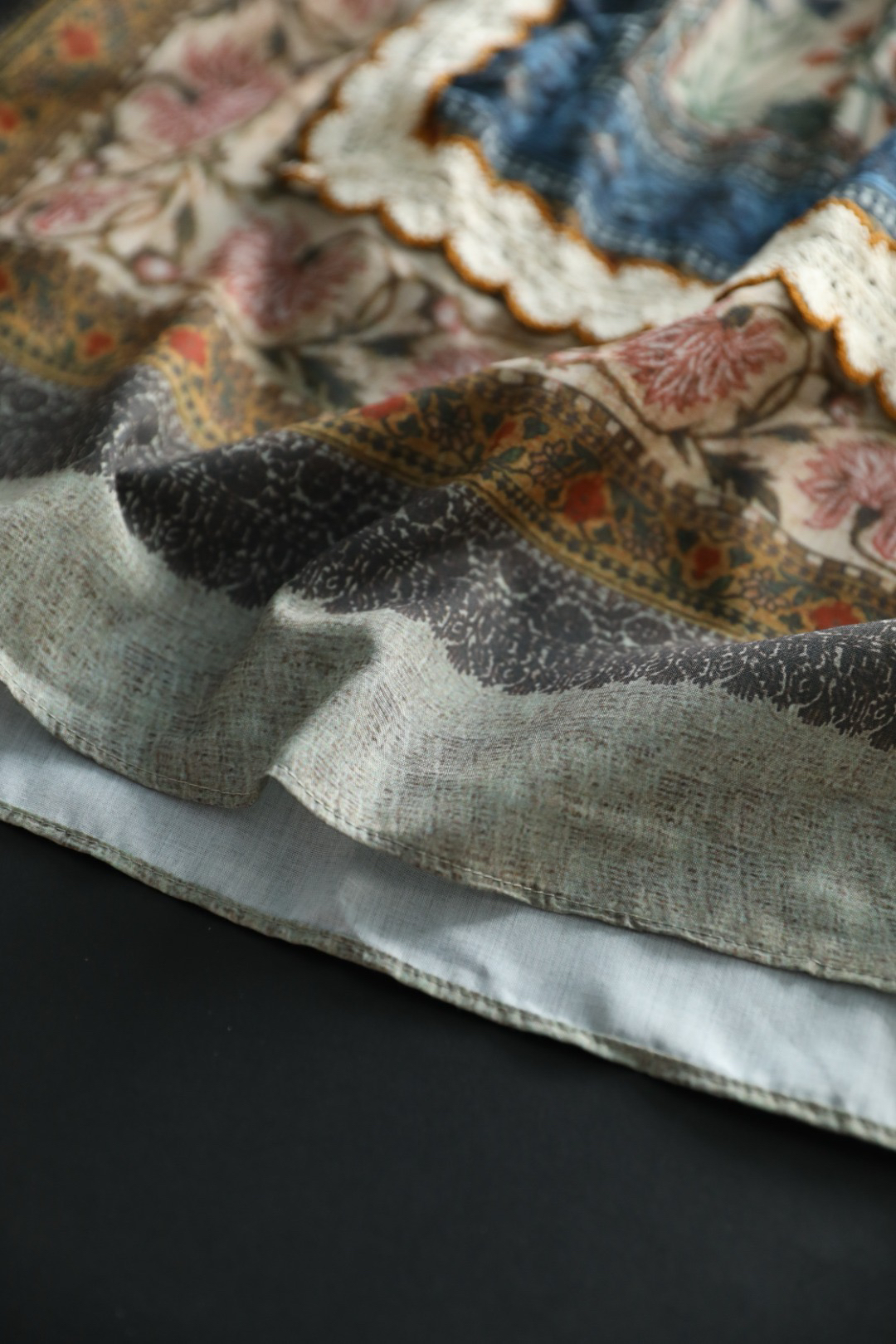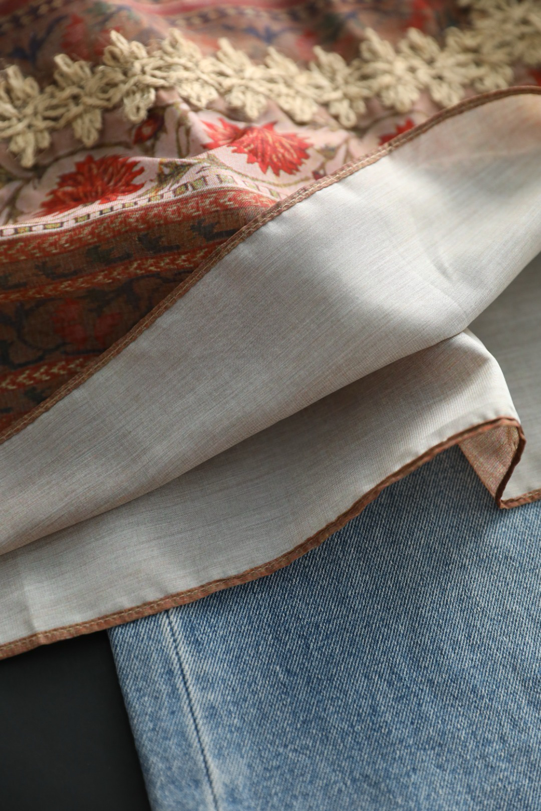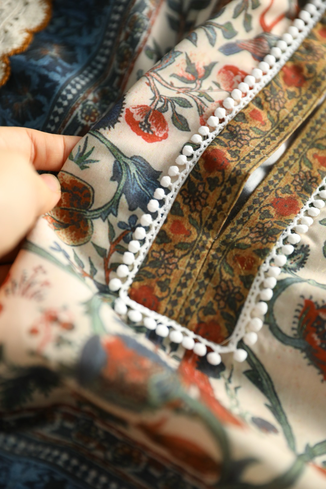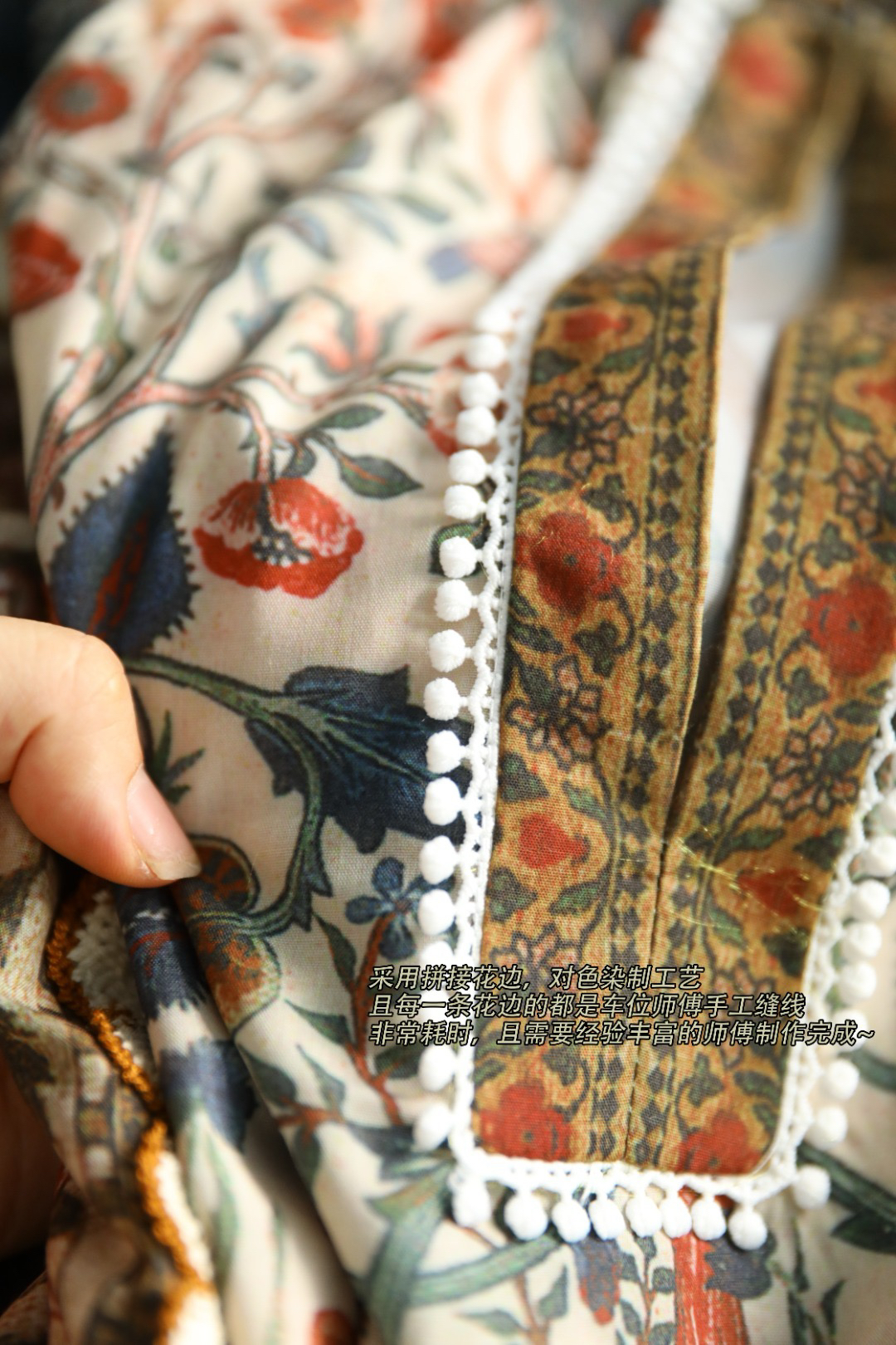 采用拼接花边,对色染制工艺,且每一条花边的都是车位师傅手工缝线,非常耗时,且需要经验丰富的师傅制作完成~