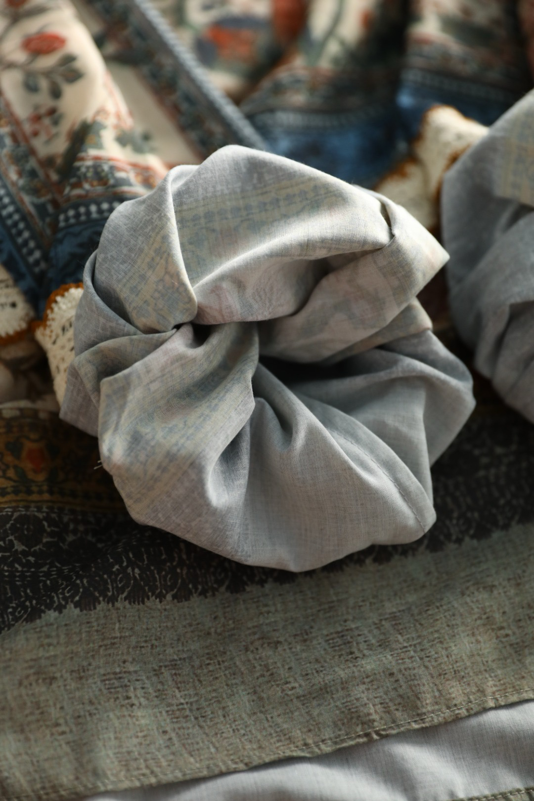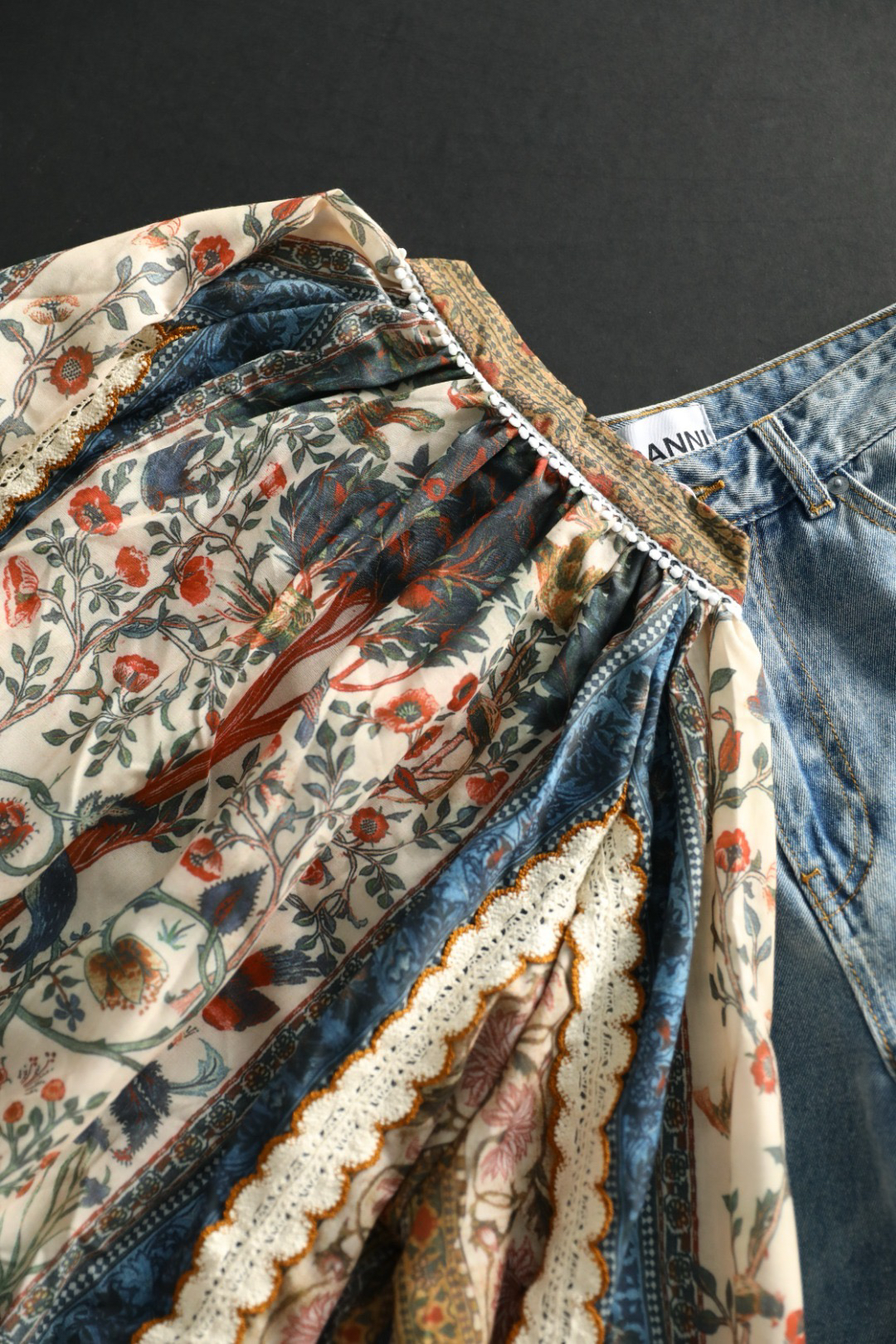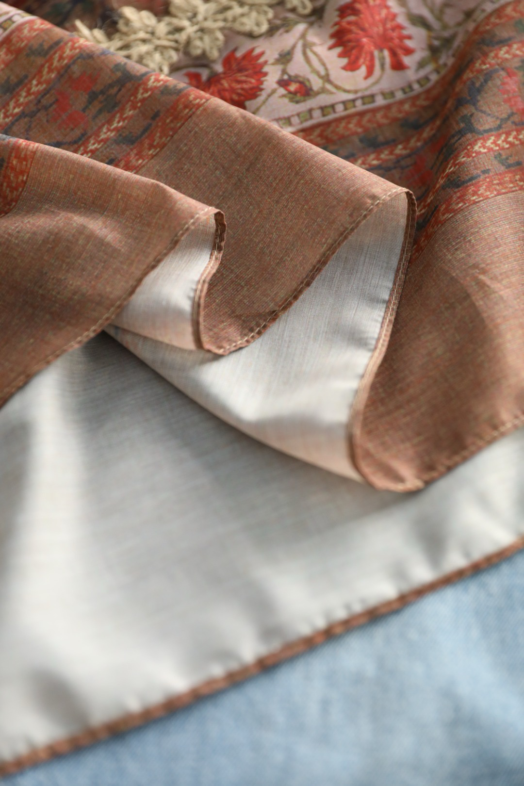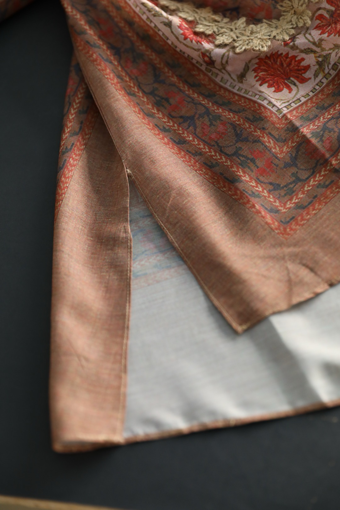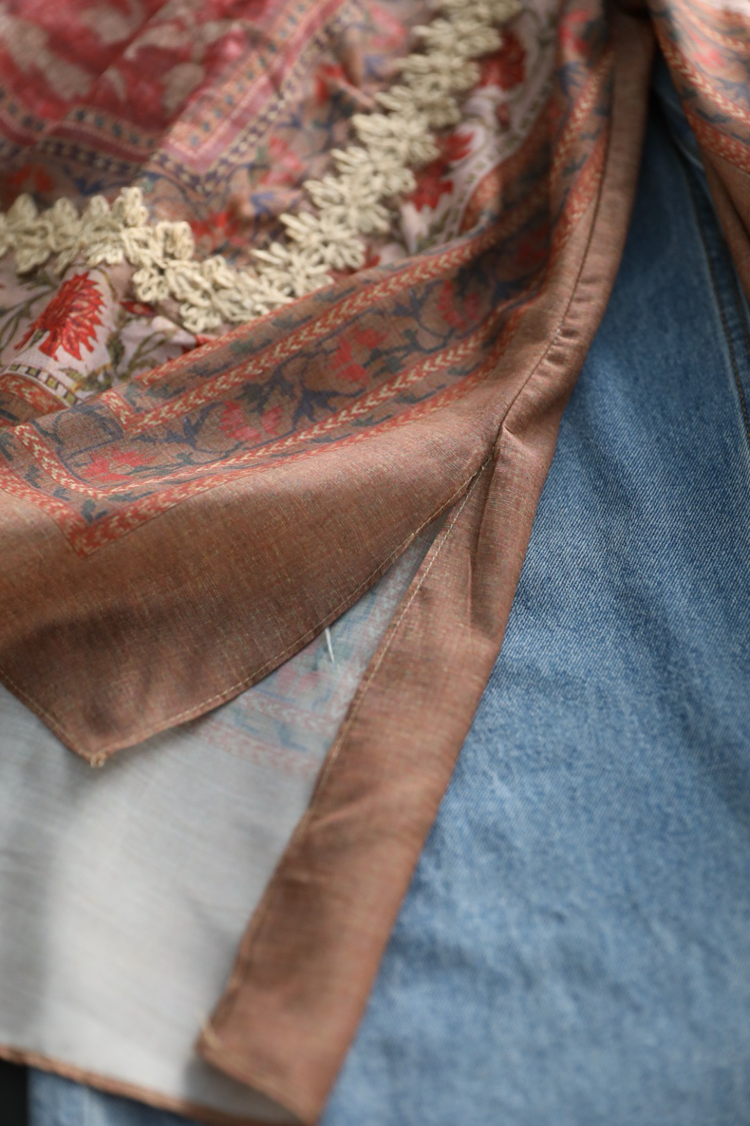 采用拼接花边,对色染制工艺,且每一条花边的都是车位师傅手工缝线,非常耗时,且需要经验丰富的师傅制作完成~