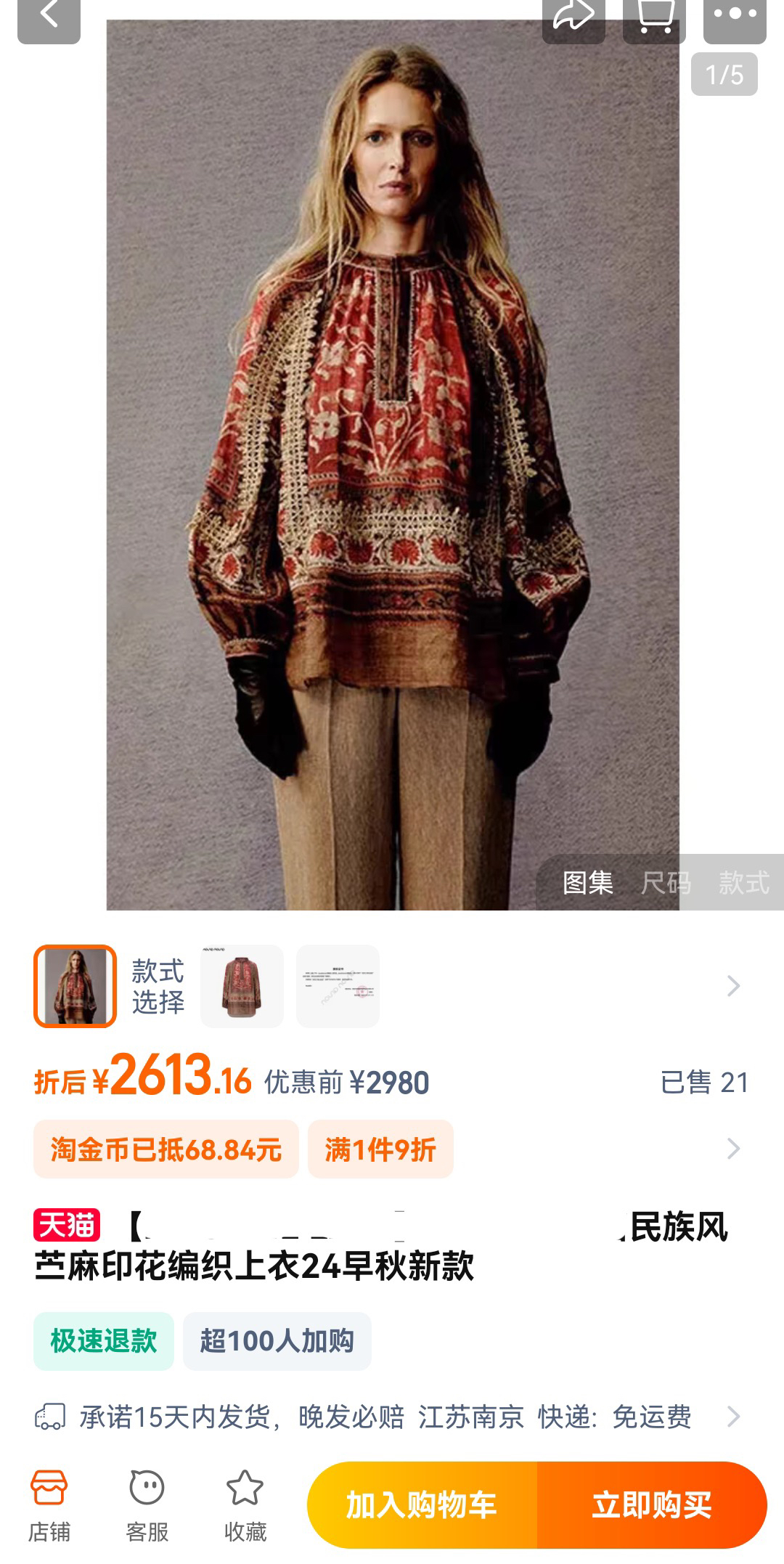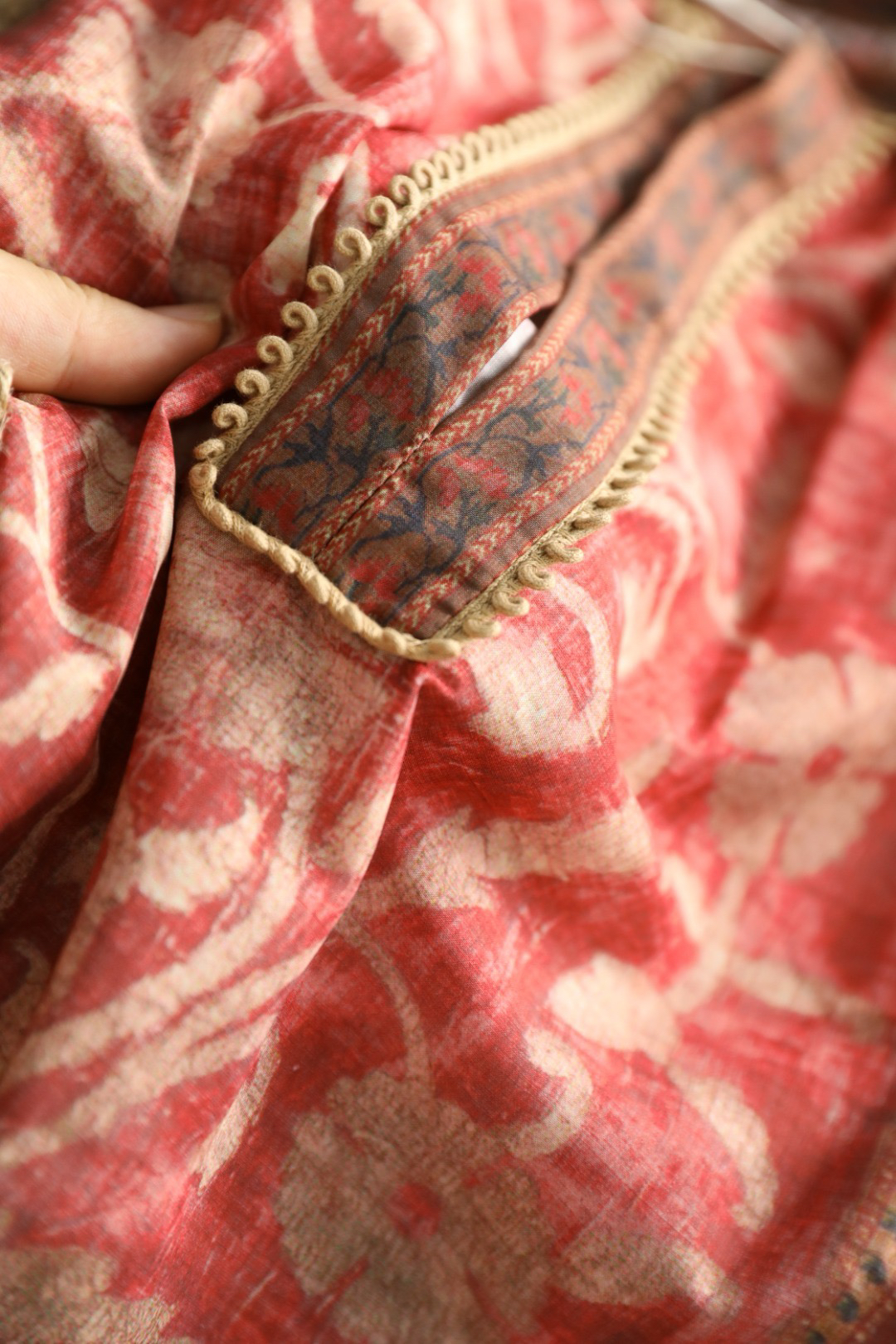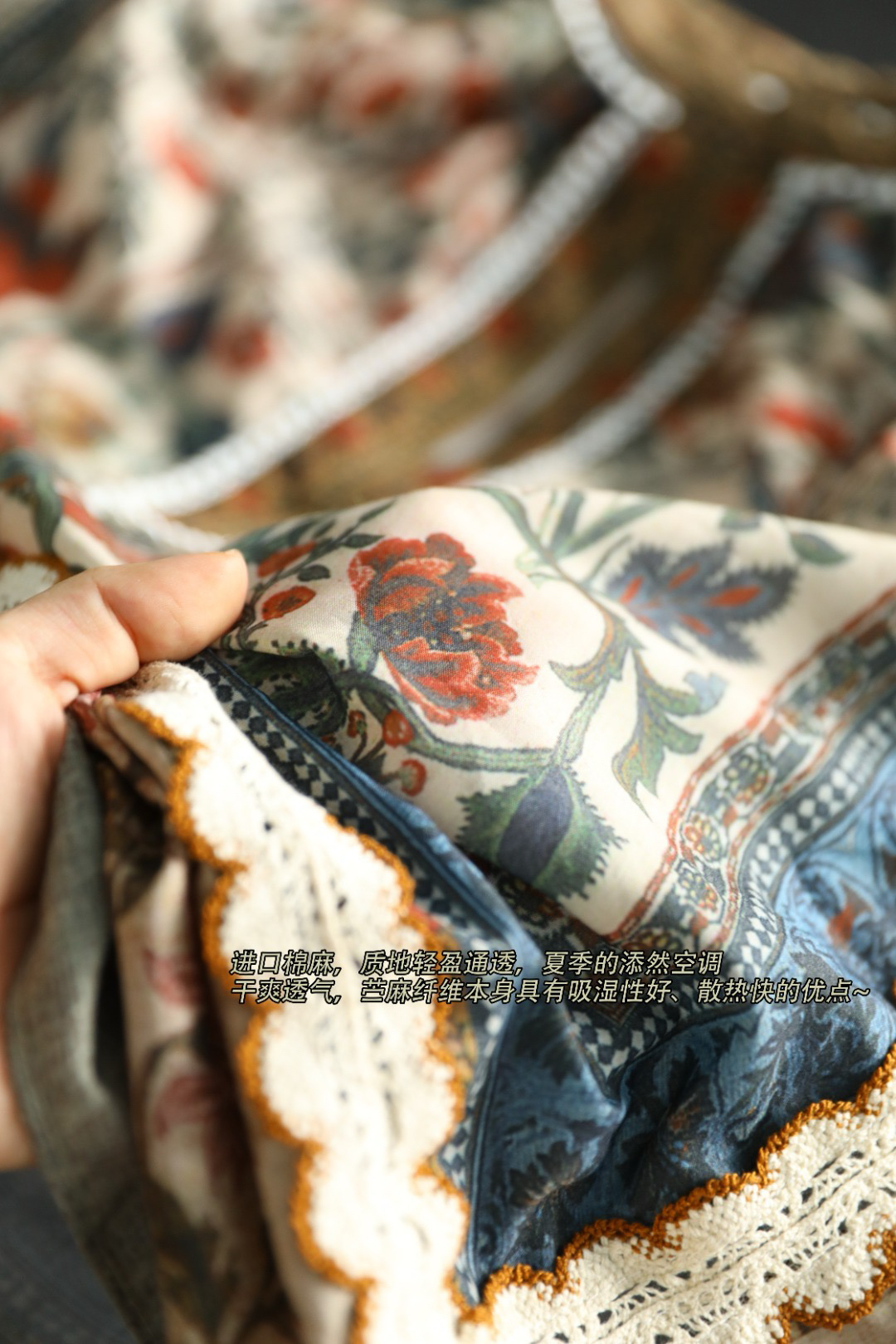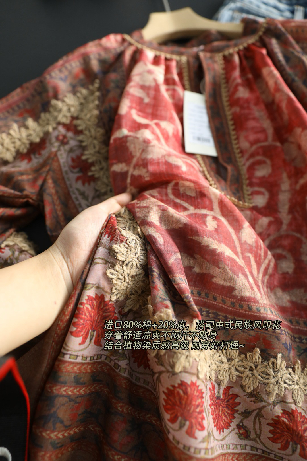 进口80%棉+20%麻,搭配中式民族风印花,穿着舒适凉爽不闷汗不贴身,结合植物染质感高级 耐穿好打理~