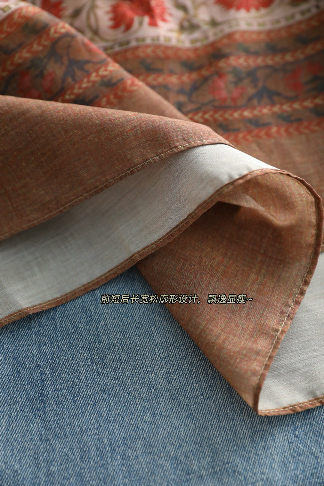 前短后长宽松廓形设计,飘逸显瘦,门襟开口加领口隐藏式纽扣,两穿式设计,圆领or v领随意切换~