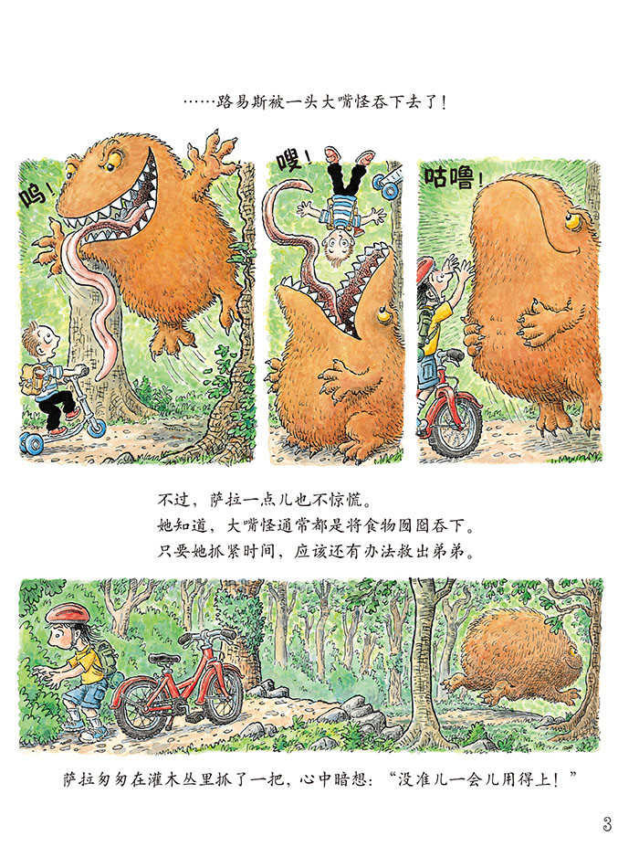 路易斯和姐姐萨拉正在树林里玩,突然,可怕的事情发生了!路易斯被一头大嘴怪吞下去了!这可怎么办呢?可是,作为姐姐的萨拉似乎一点也不担心,她有什么办法呢?她能否历经艰险,救出弟弟?他们还会遇到什么危险?前路漫漫,我们一起来追随萨拉的足迹吧!