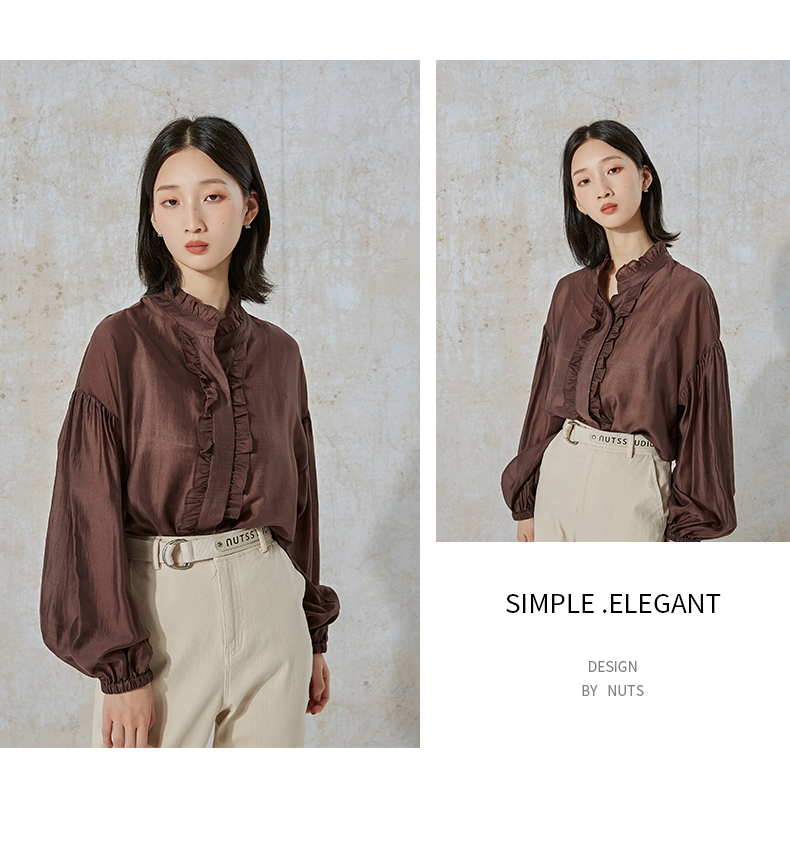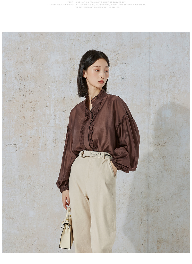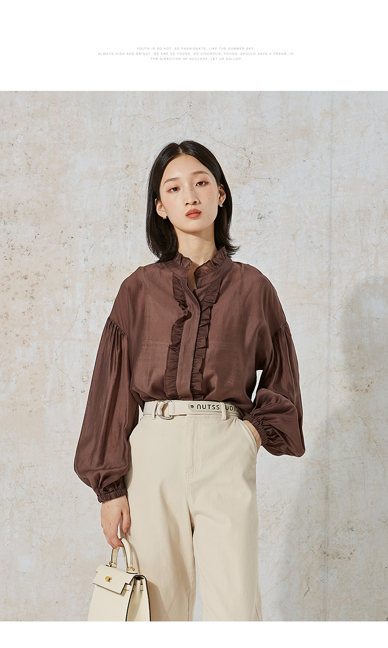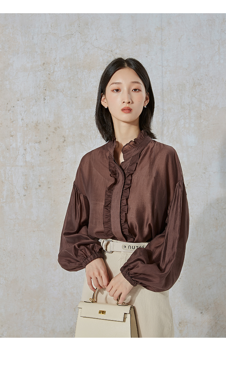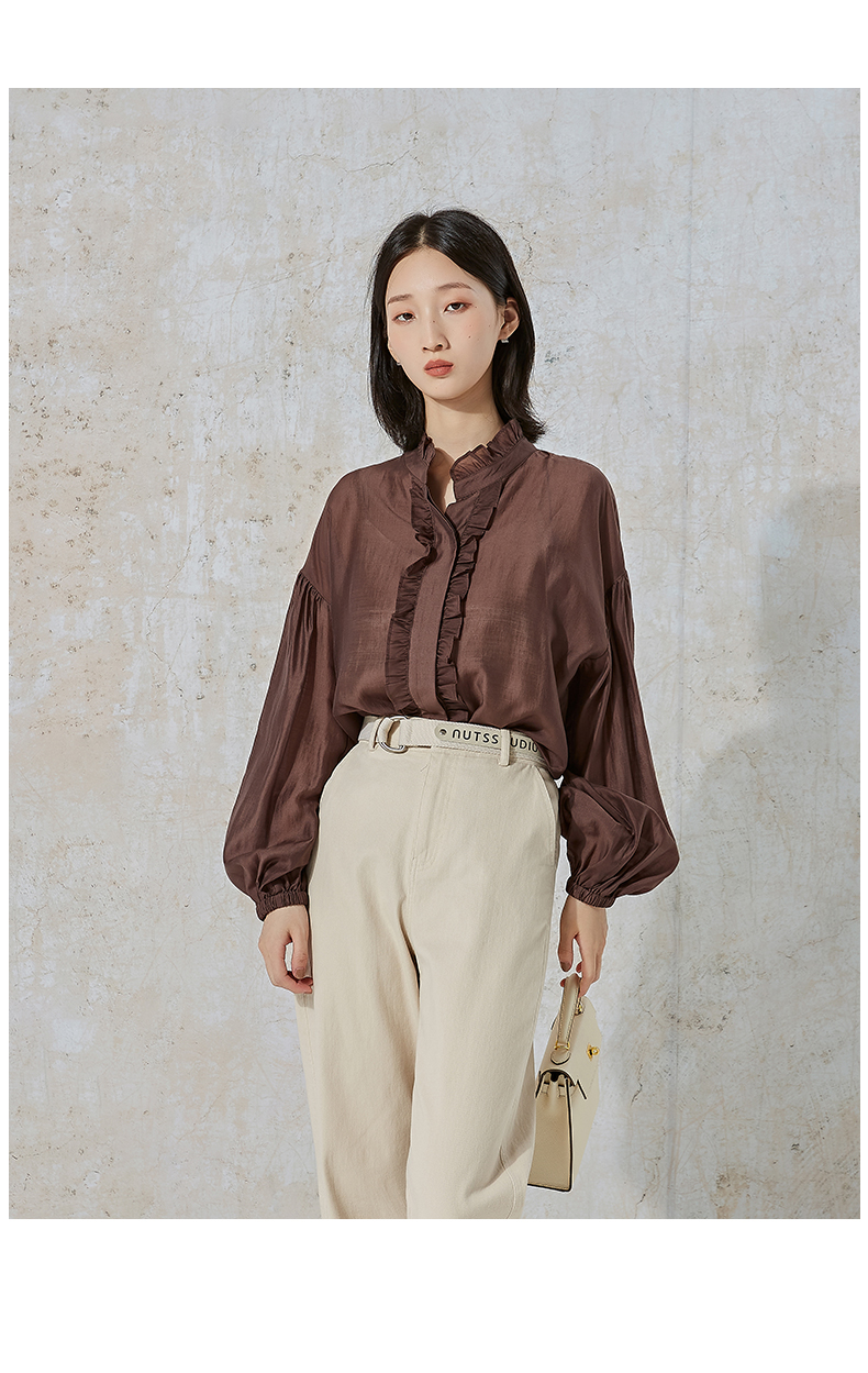 NUTS秋季新款时尚通勤风荷叶领泡泡袖设计感长袖衬衫231013089B