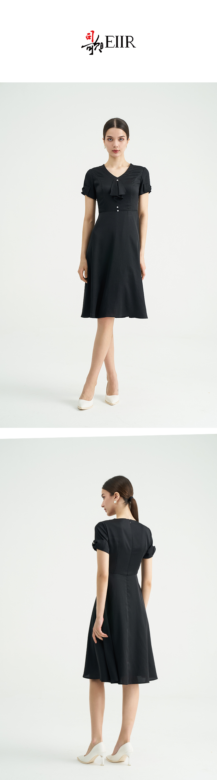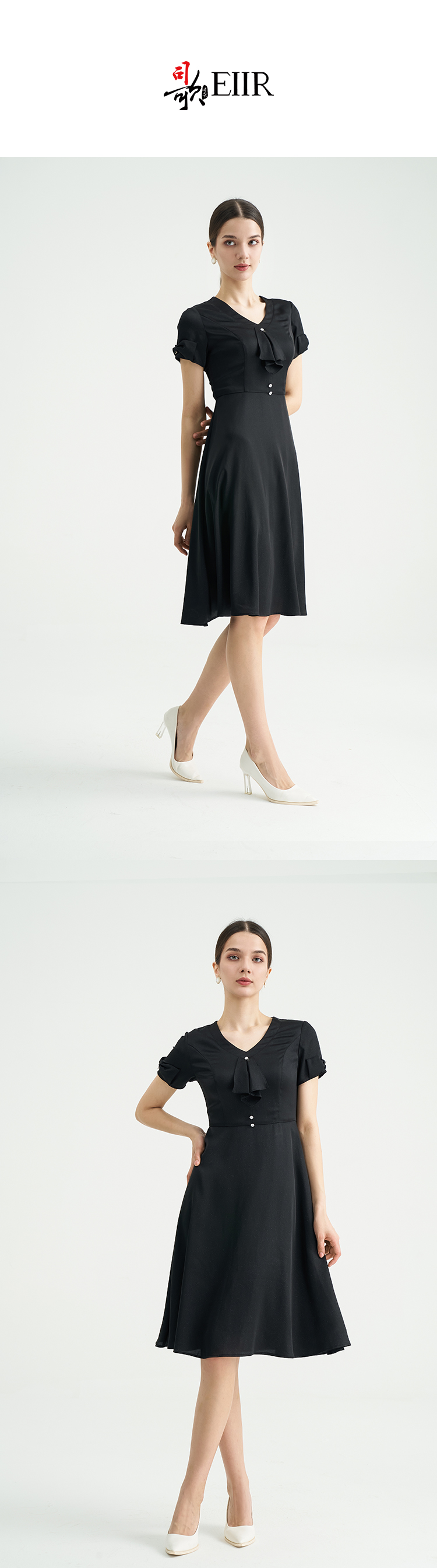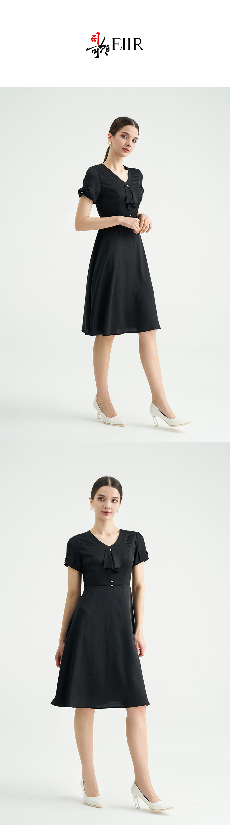 司歌v领修身短袖净色连衣裙小黑裙EA891113X