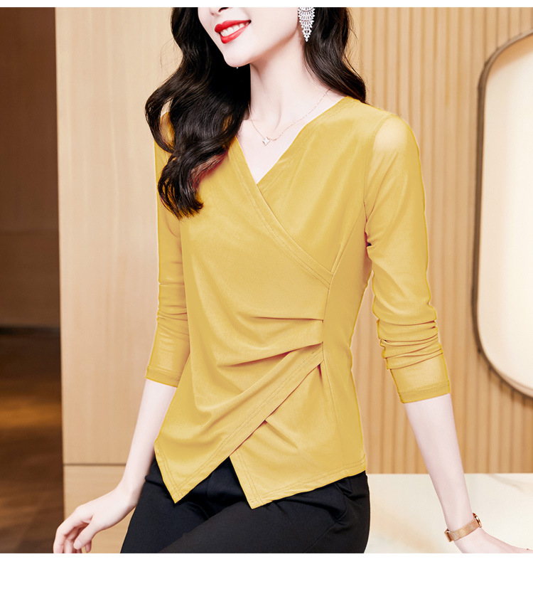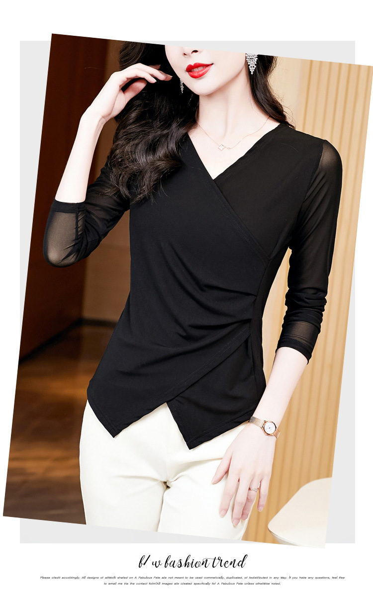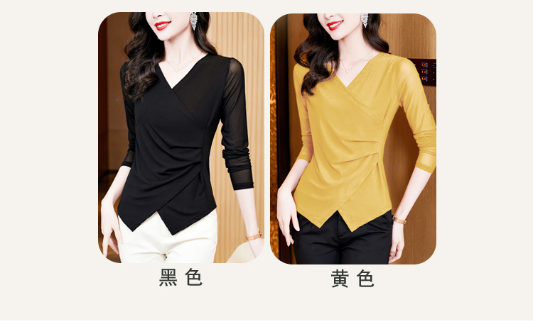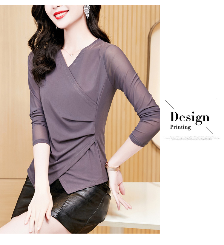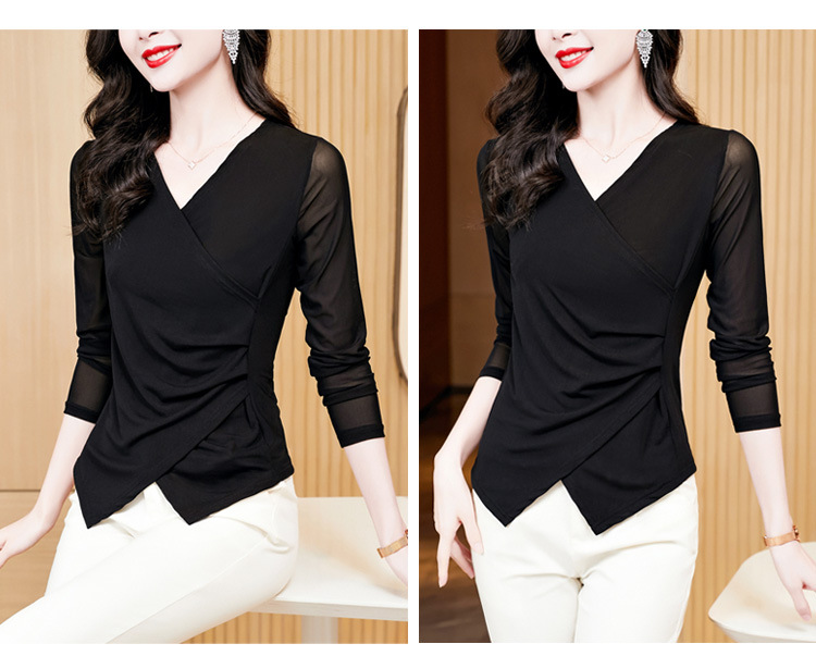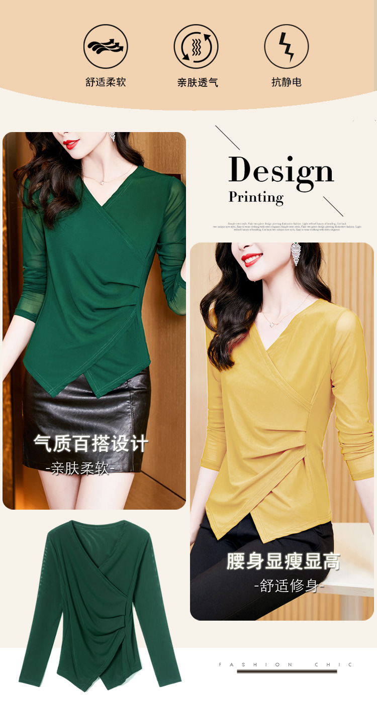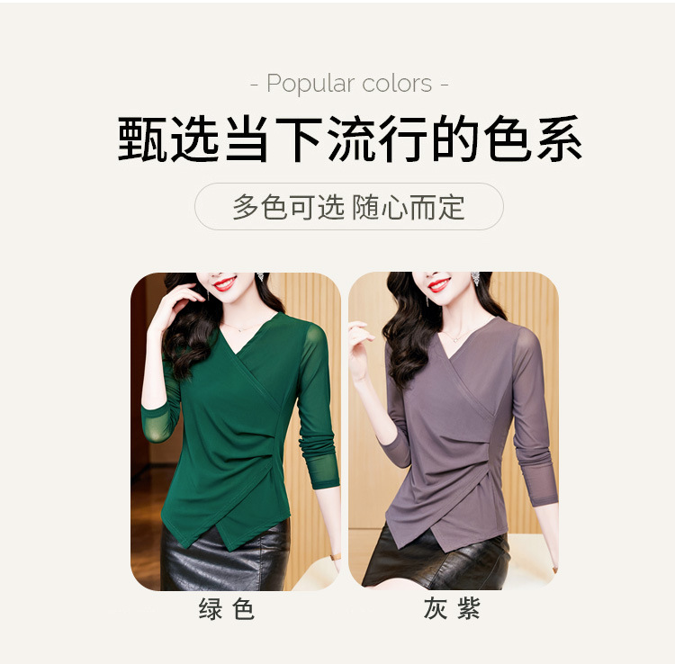秋季新款,修身显瘦百搭交叉V领纯色长袖网纱打底衫女KQL-E37M2669