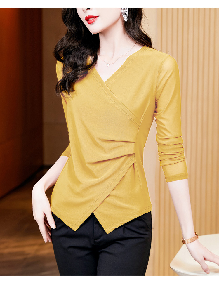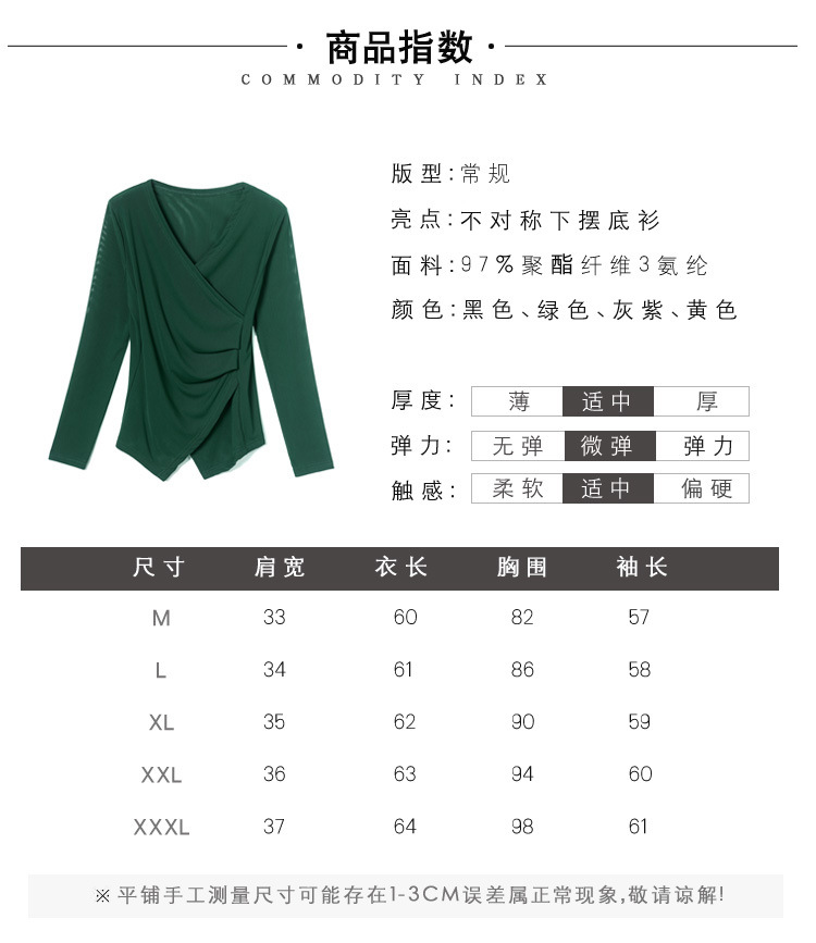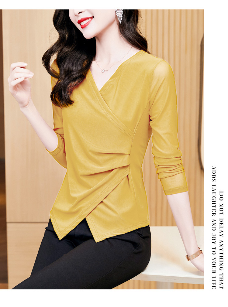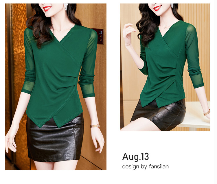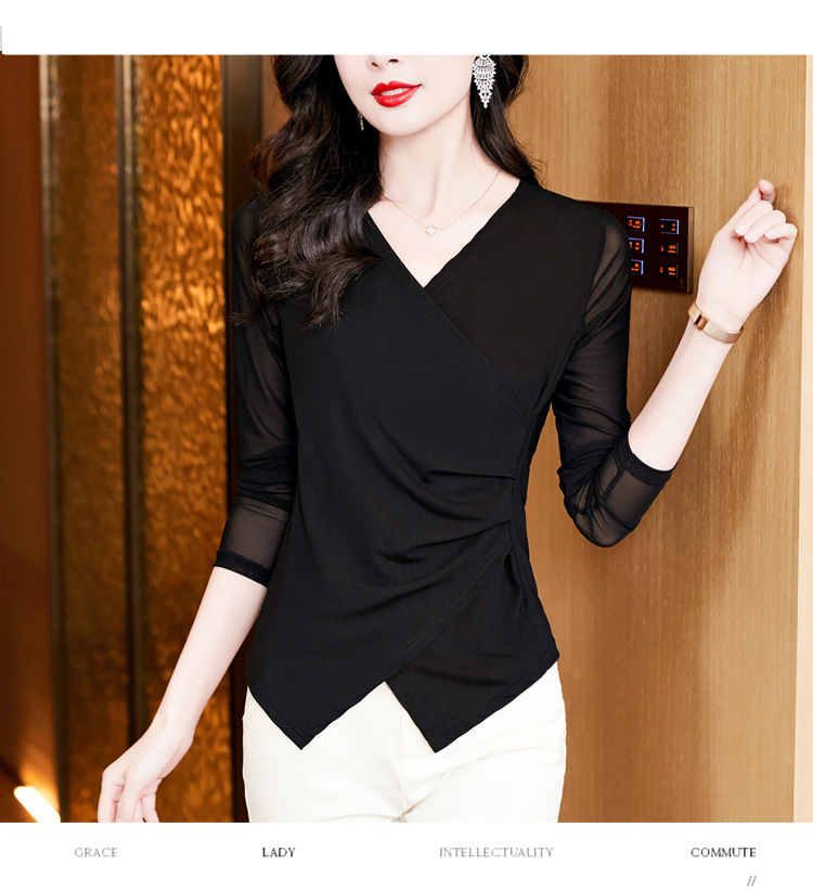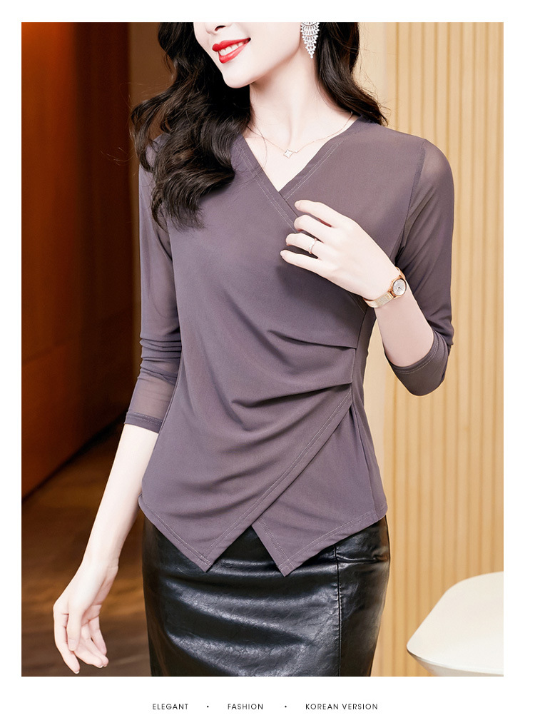 秋季新款,修身显瘦百搭交叉V领纯色长袖网纱打底衫女KQL-E37M2669