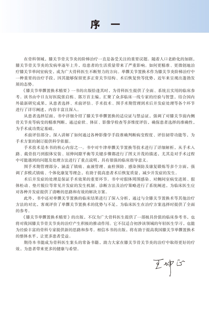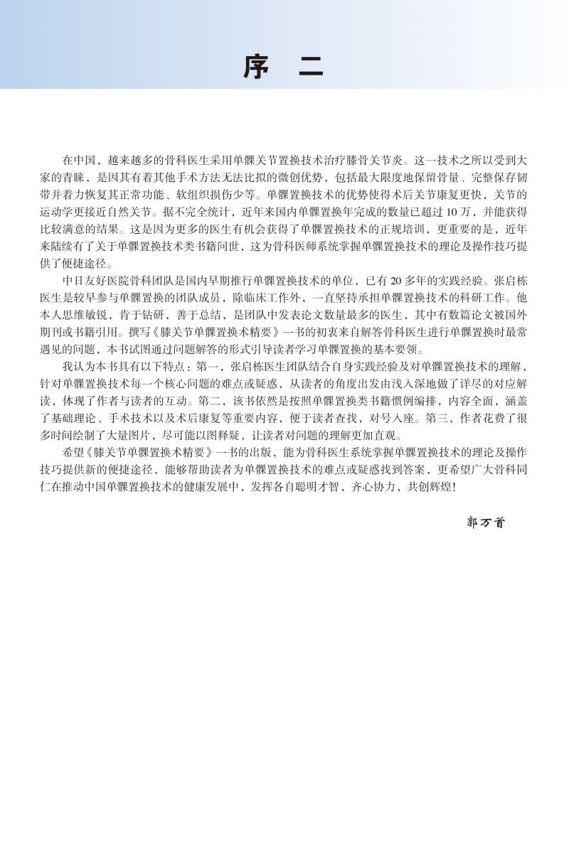 中日友好医院骨科团队是国内早期推行单髁置换技术的单位,已有20多年的实践经验。张启栋医生是较早参与单髁置换的团队成员,撰写《膝关节单髁置换术精要》一书的初衷是为解答骨科医师同单髁置换对最常遇见的问题,本书试图通过问题解答的形式引导读者学习单髁置换的基本要领。我认为本书独具以下特点:第一,张启栋医生团队结合自身实践经验及对单髁置换技术的理解,针对单髁置换技术每一个核心问题的难点或疑惑,从读者的角度出发由浅入深地做了详尽的对应解读,体现了作者与读者的互动。第二,该书依然是按照单髁置换书籍惯例编排,内容全面,涵盖了基础理论、手术技术以及术后康复等重要内容,便于读者查找,对号入座。第三,本书在编写过程中花费了很多时间绘制了大量图片,尽可能以图释疑,让读者对问题的理解更加直观。