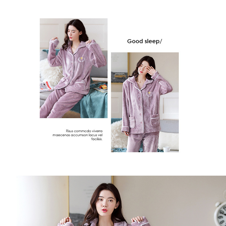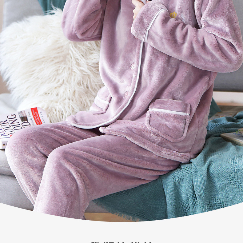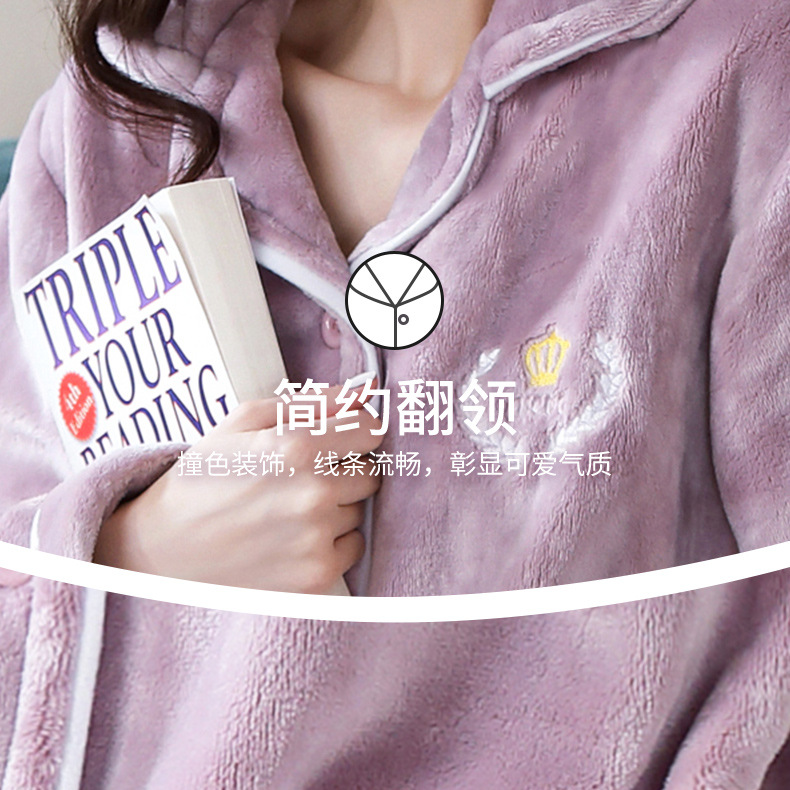 【加绒保暖!柔软舒适】新款秋冬季珊瑚绒睡衣女翻领开衫法兰绒女士家居服套装。rc 商品图1