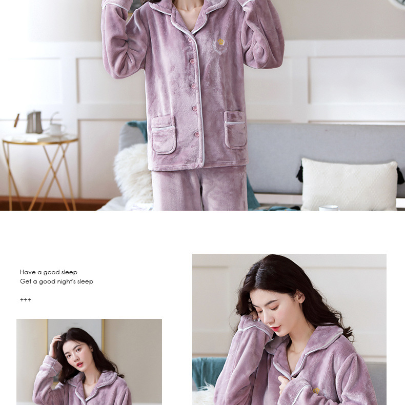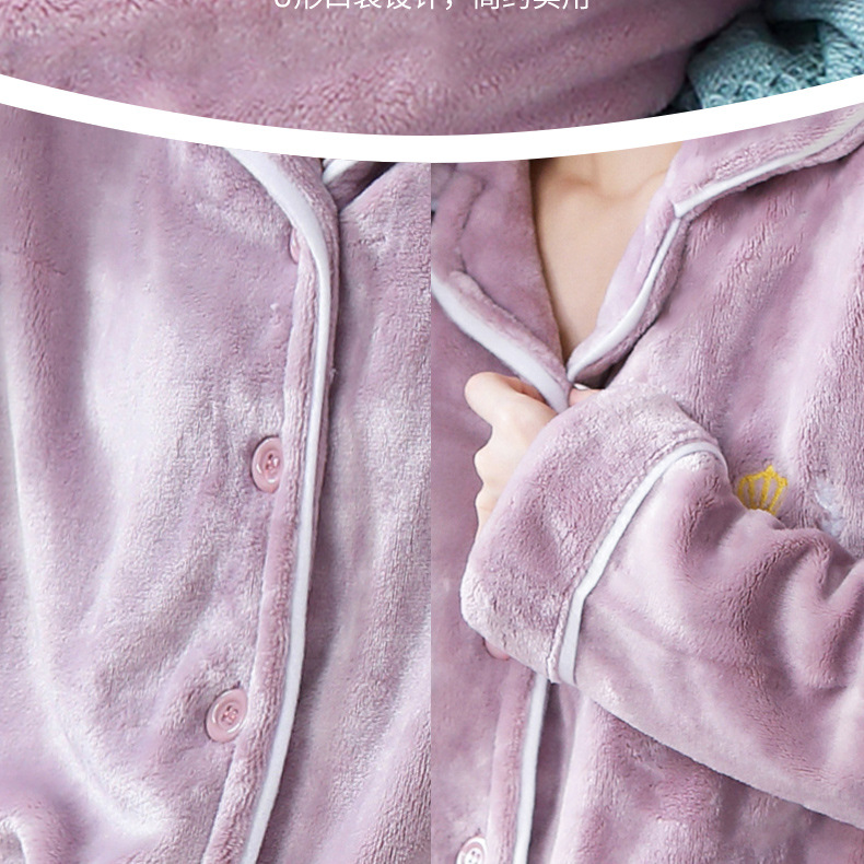 【加绒保暖!柔软舒适】新款秋冬季珊瑚绒睡衣女翻领开衫法兰绒女士家居服套装。rc 商品图3