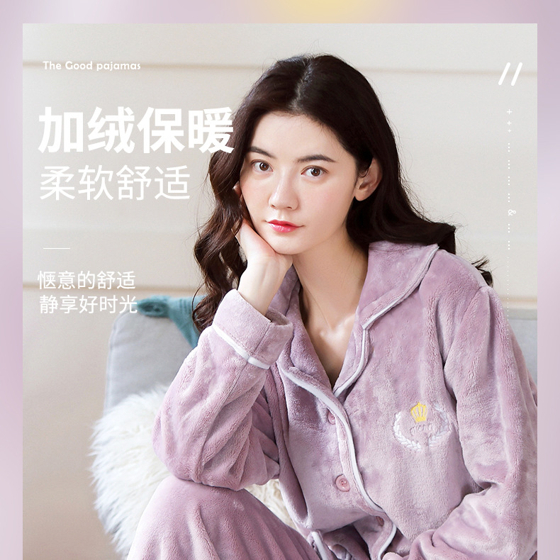 【加绒保暖!柔软舒适】新款秋冬季珊瑚绒睡衣女翻领开衫法兰绒女士家居服套装。rc