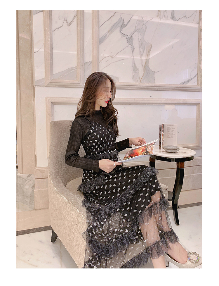 张心子心机套装冬装裙子2019春季新款烫金星星网纱吊带裙两件套女010726