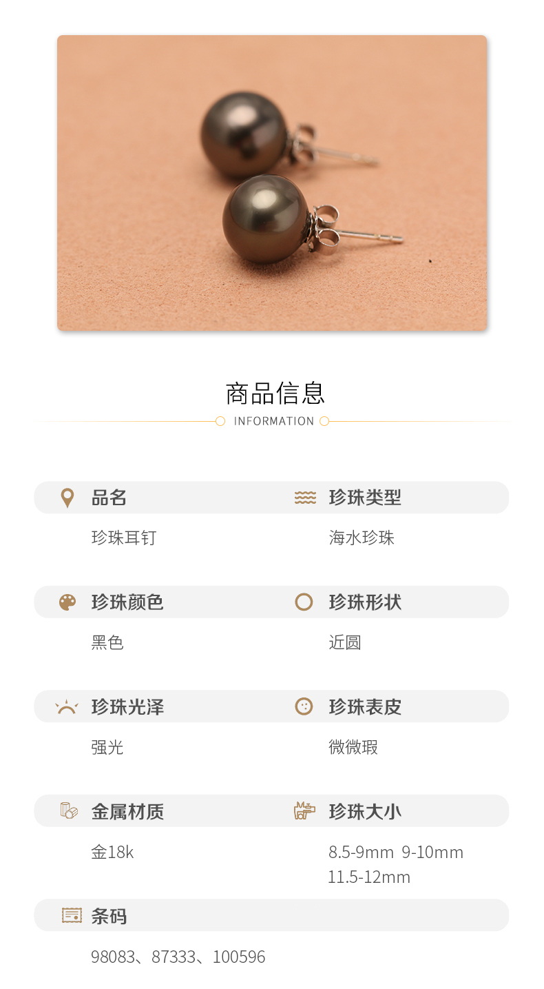 金18k海水珍珠耳钉 8.5-12mm 98083-87333-100596