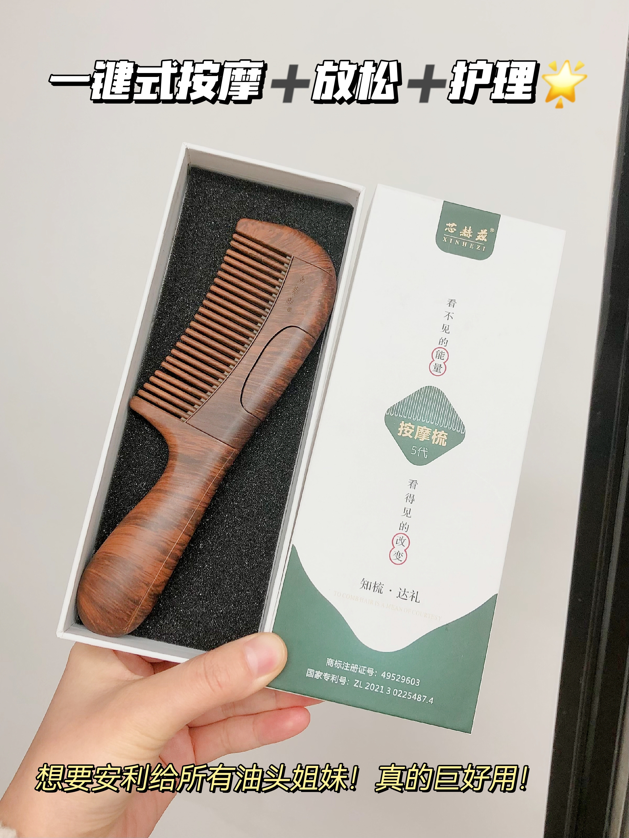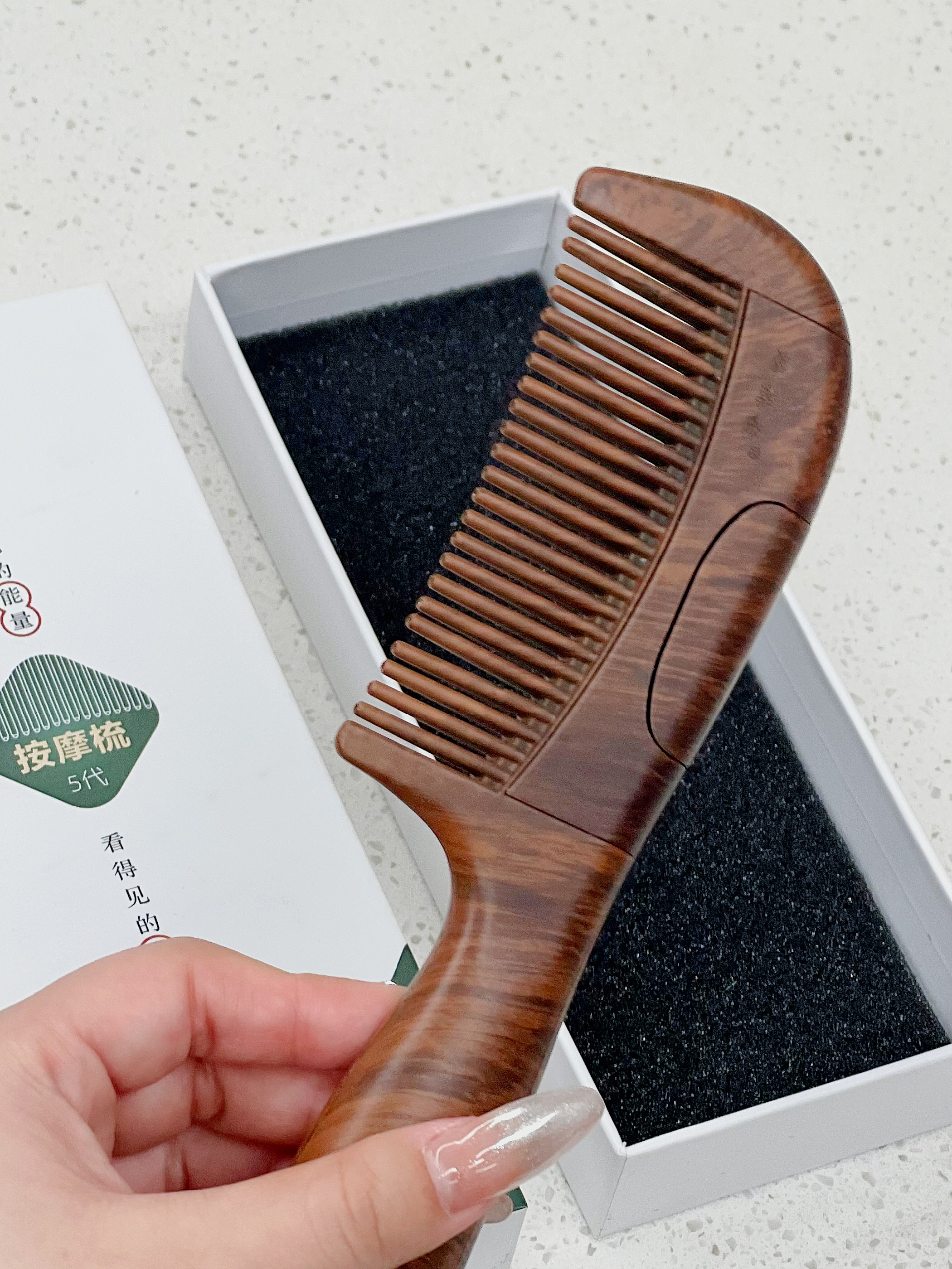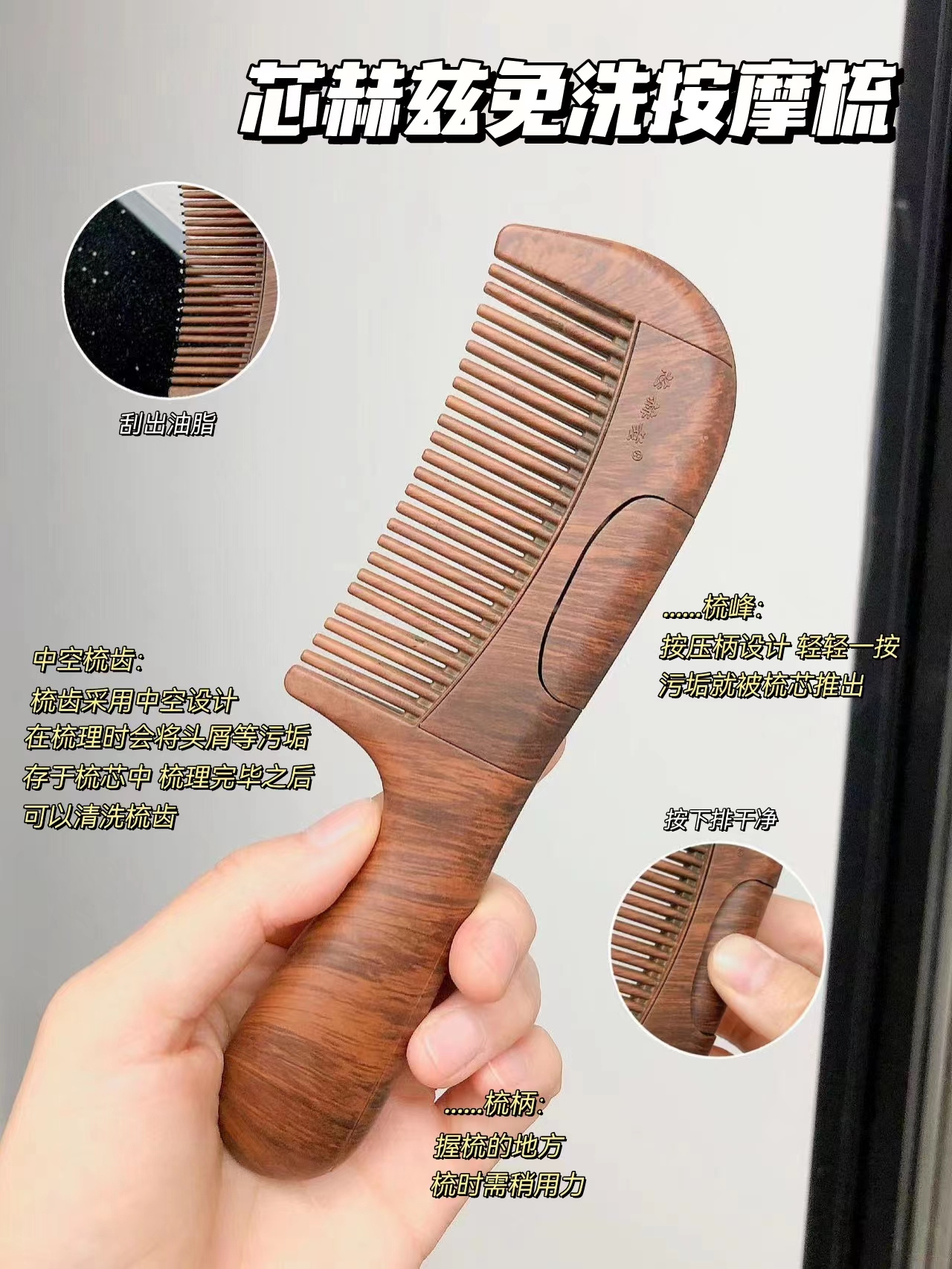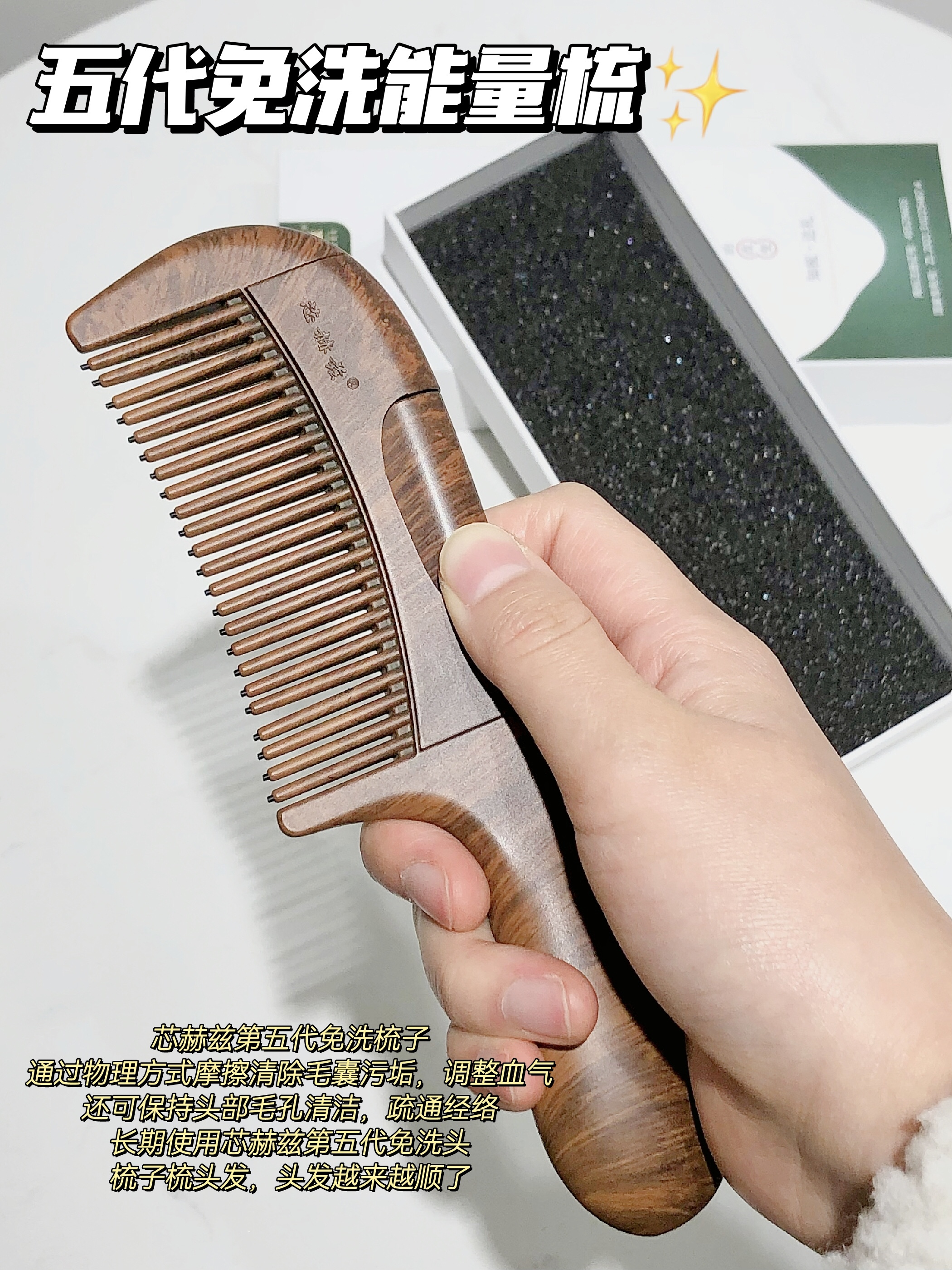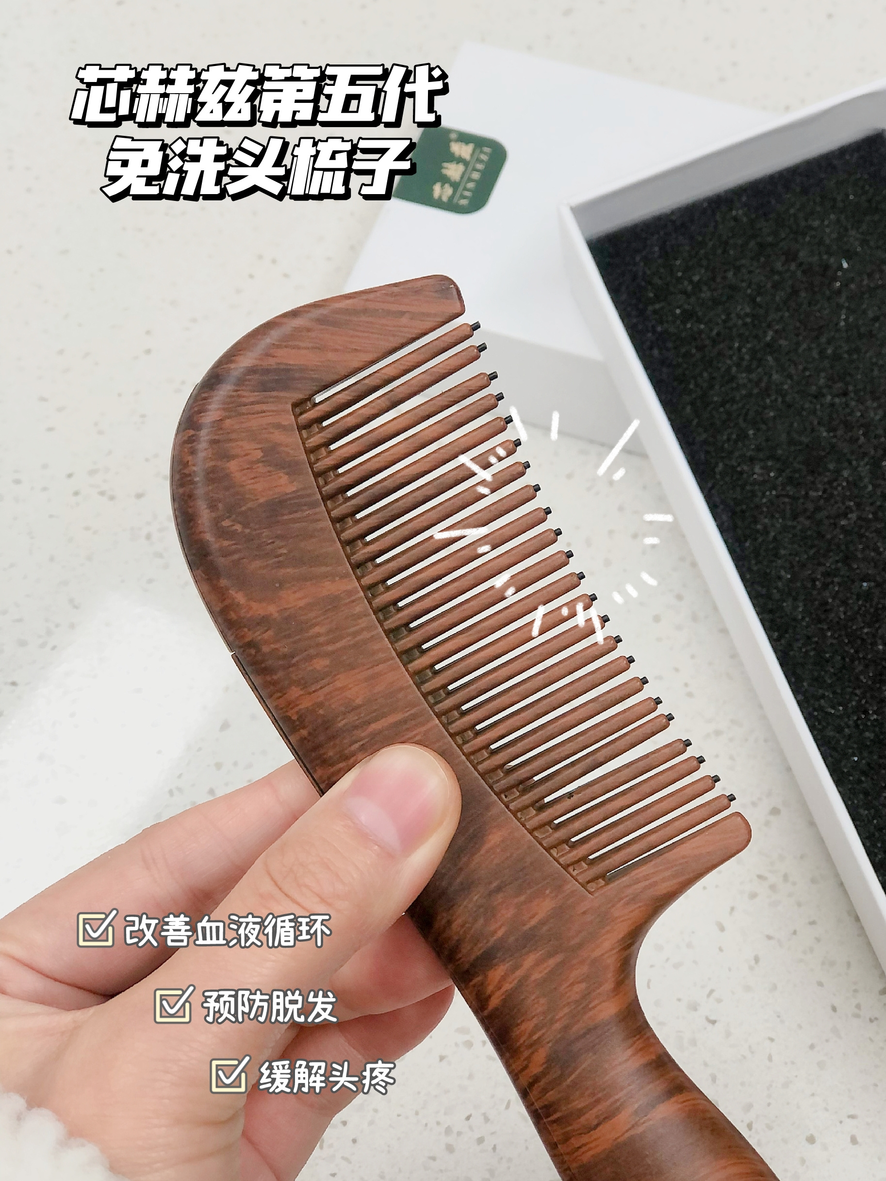 日常生活中,总有一些看似简单却又让人头大的事儿 比如梳子的清洁问题.....铛铛铛~芯赫兹第五代免洗头梳子 1.好打理:刷子刷一刷冲一冲就能洗干净了,非常方便 2.不藏头发:头发不容易勾留在梳齿上,有一两根也很好拿掉 3.对头皮友好:比塑料对头皮更好,特别便宜的塑料梳子,工艺处理的不好就很容易划伤头皮 4.摩擦力小,可以减少梳子对毛鳞片磨损 5.手感光滑,干净卫生,不起静电、能降低掉发 同时还能够减缓脑衰退,能够清除疲惫感,可以益脑醒神 具有降血压,防止脑溢血等病症的功效,能够缓解头疼,能耳聪慧目 可以对头部血液的循环系统,具有改进的功效 能具有推拿头发的作用,让秀发获得滋润,乌亮有光泽度 另外梳子是越久越好,经过长时间使用会变得更加光滑,老梳子不要丢,用起来更好哦